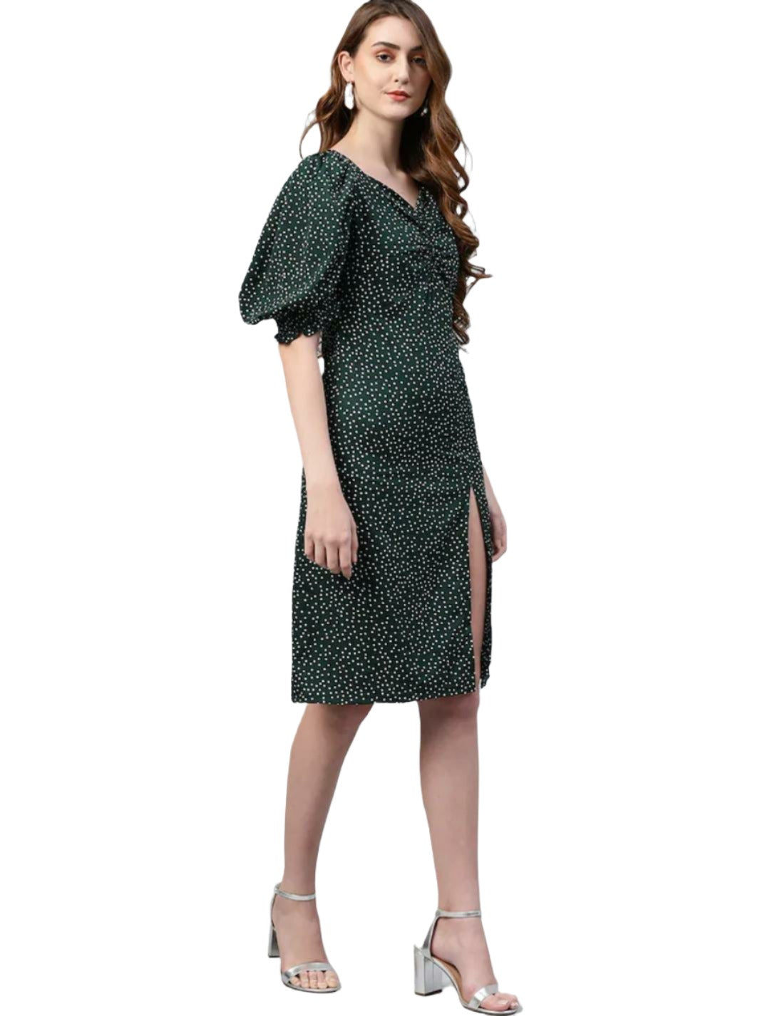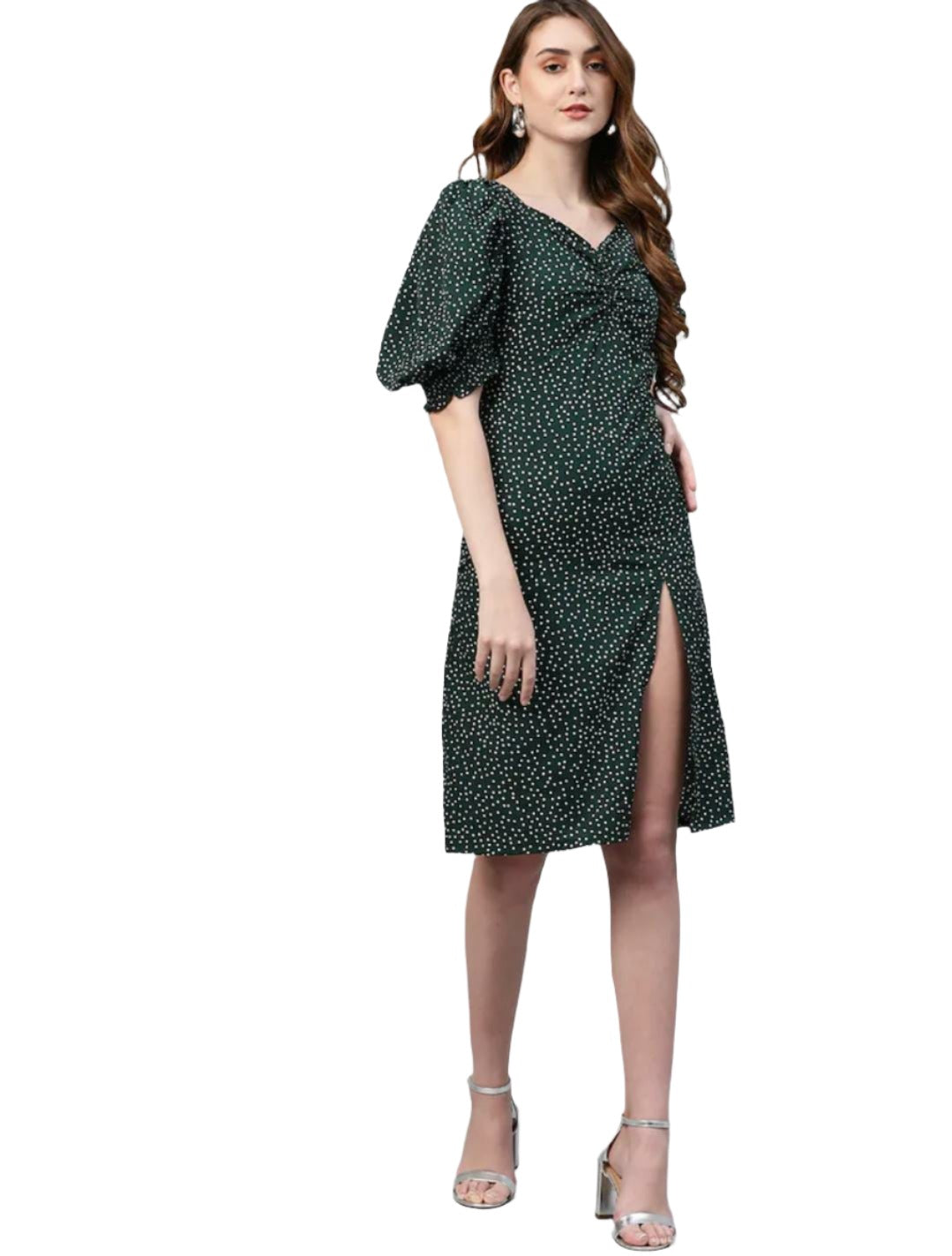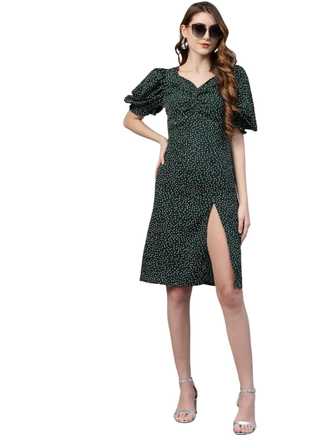 Green and white printed woven A-line dress, has a sweetheart neck, short puff sleeves, concealed zip closure, and flared hem with side slit