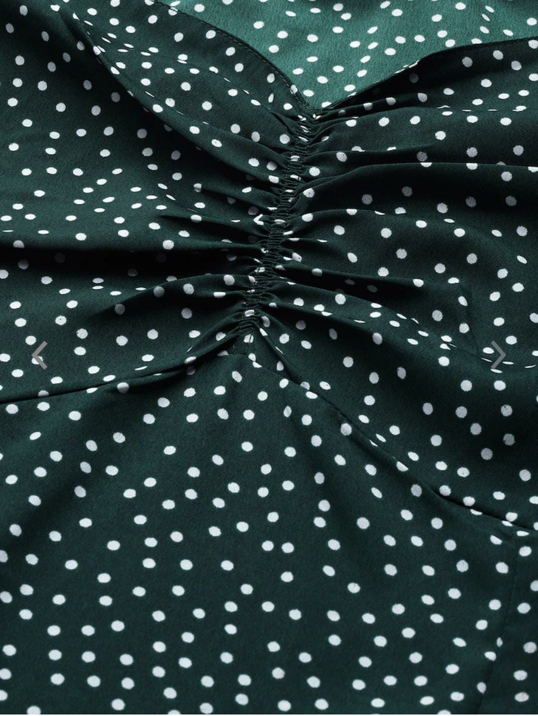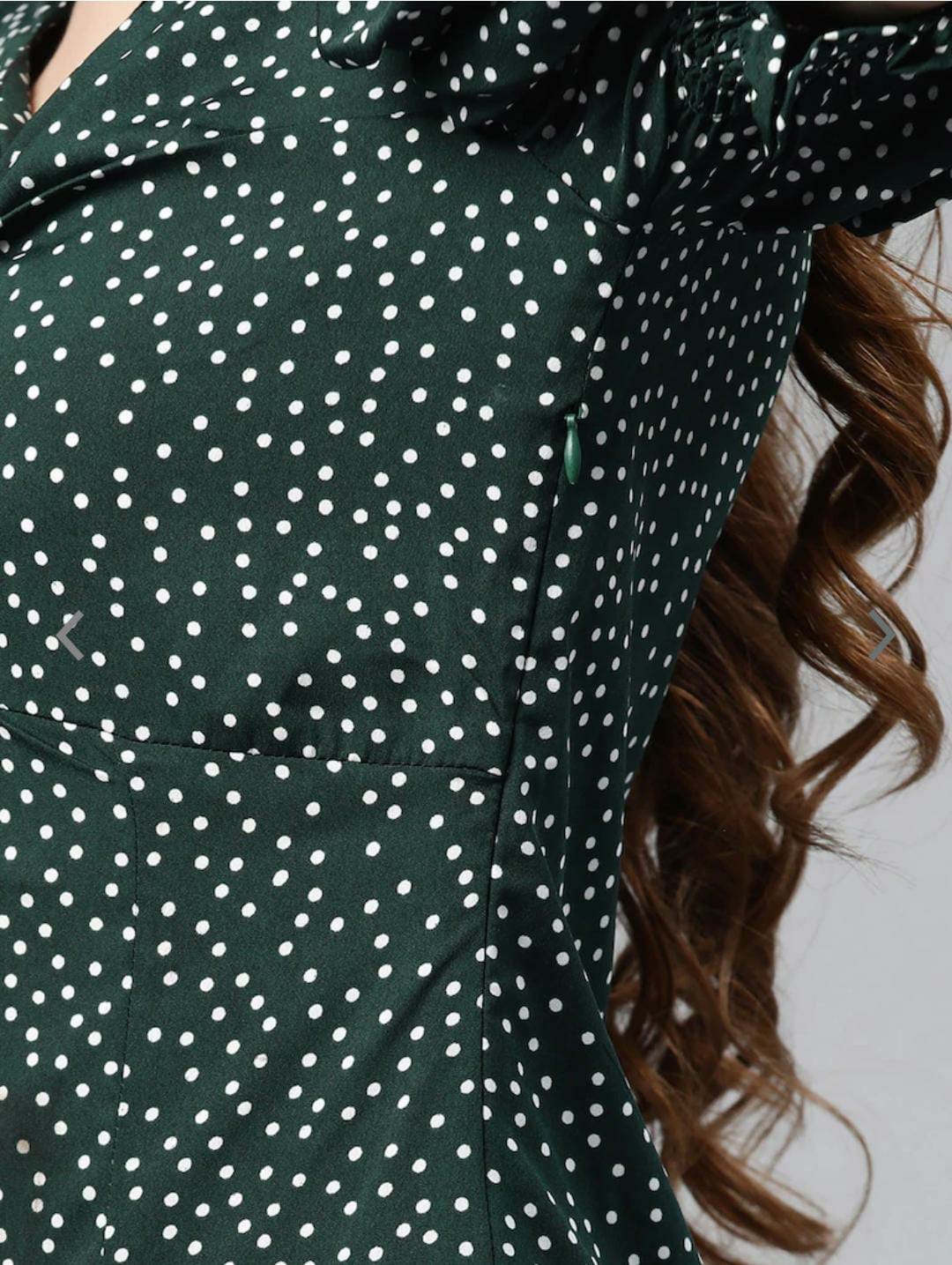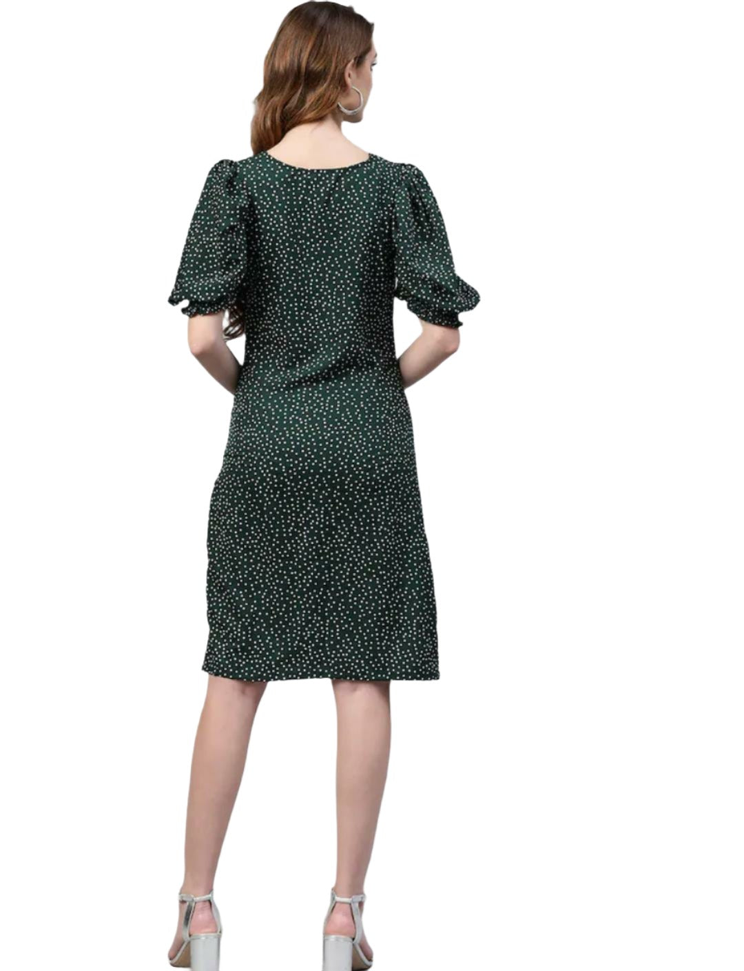 Green and white printed woven A-line dress, has a sweetheart neck, short puff sleeves, concealed zip closure, and flared hem with side slit