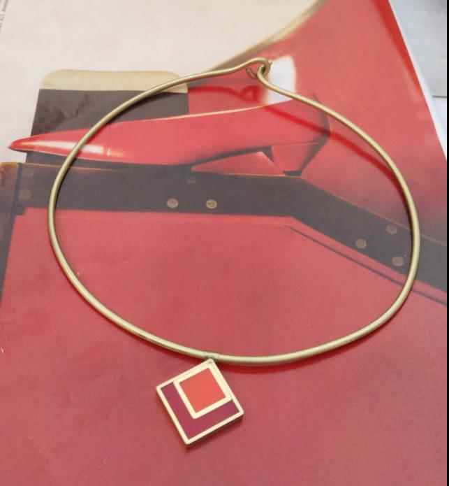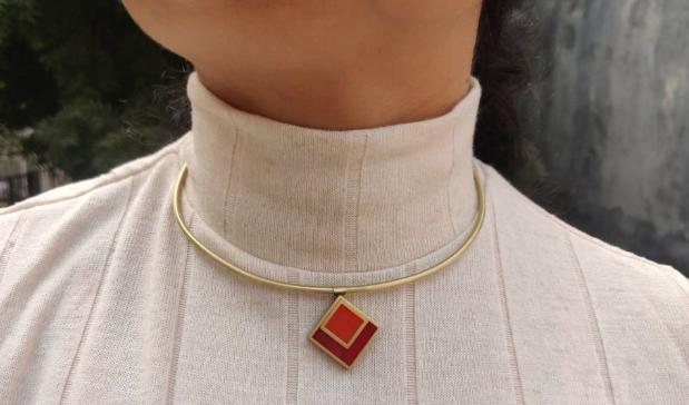 Handmade Beaten Brass Contemporary Stylish Choker Hasli Necklace with Orange Color Square Shaped Stone for Women and Girls
