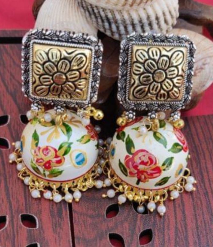 Handpainted Meenakari Work Mogra Pearl Jhumki with Dual Square Stud Earring for Women and Girls.