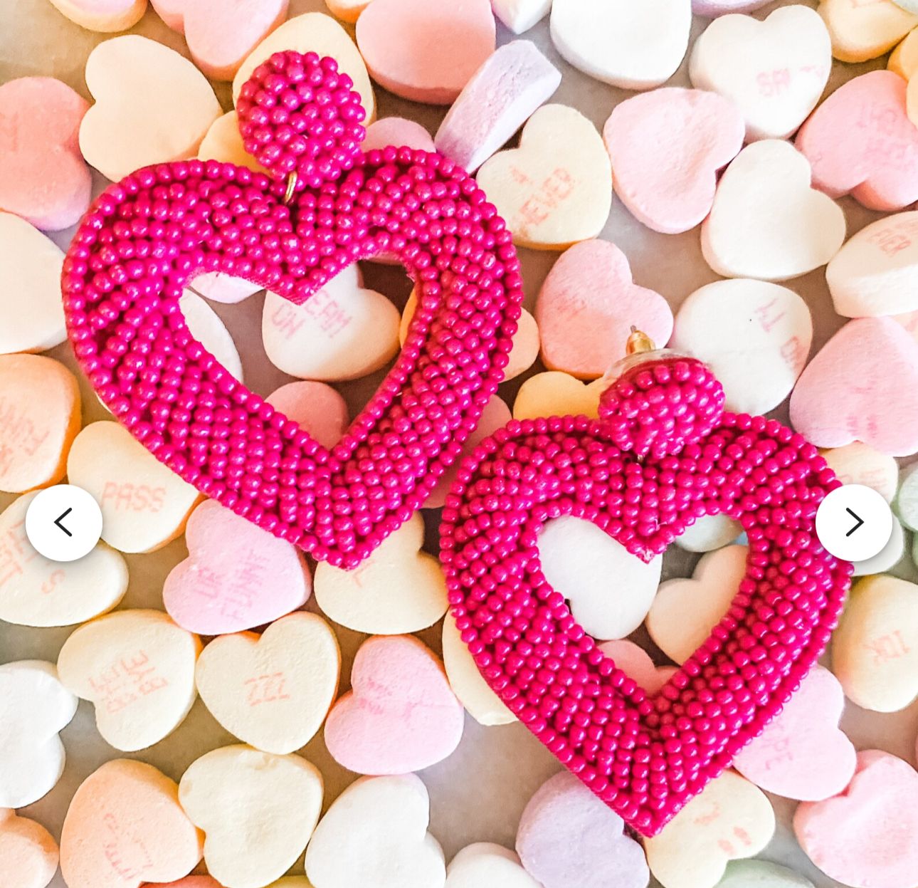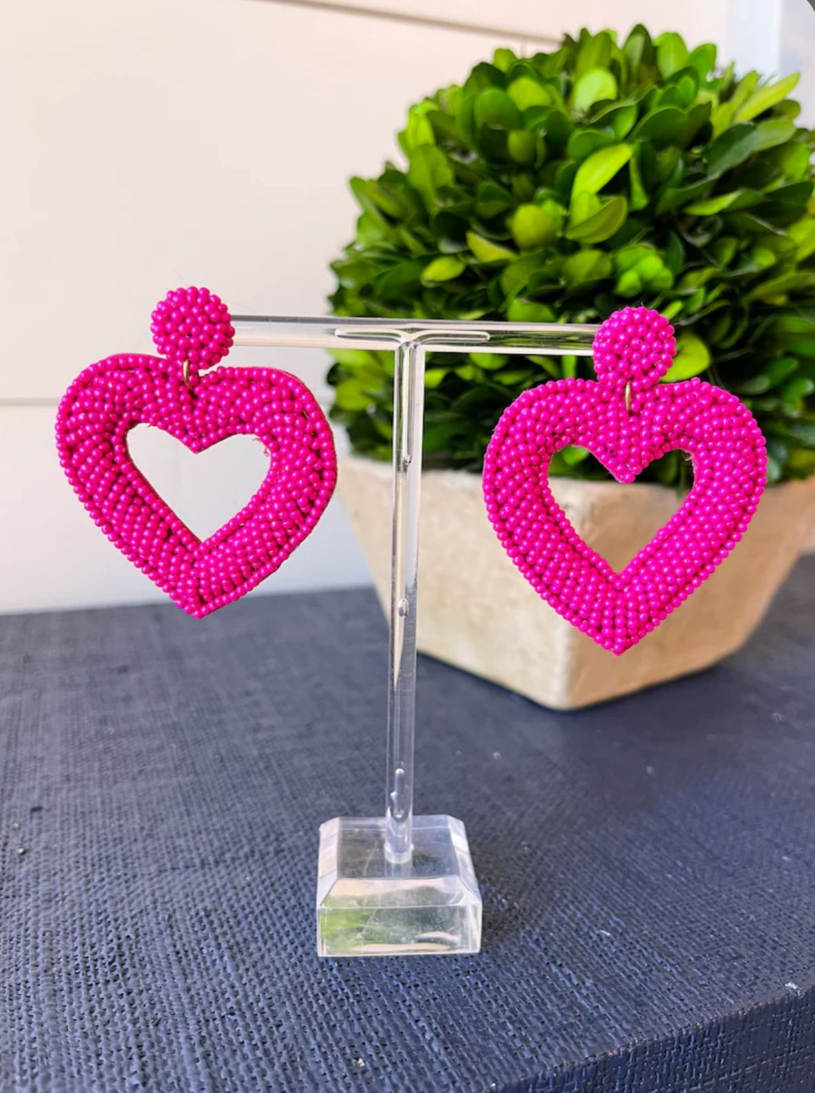 Hot Pink Heart Beaded Earrings - Southern Statement Jewelry - Beaded Statement Earrings - Fashion Earrings for her