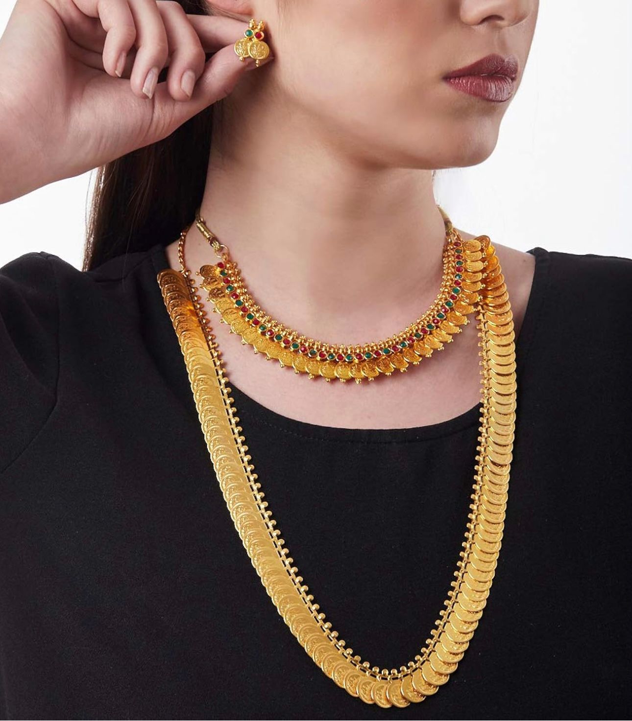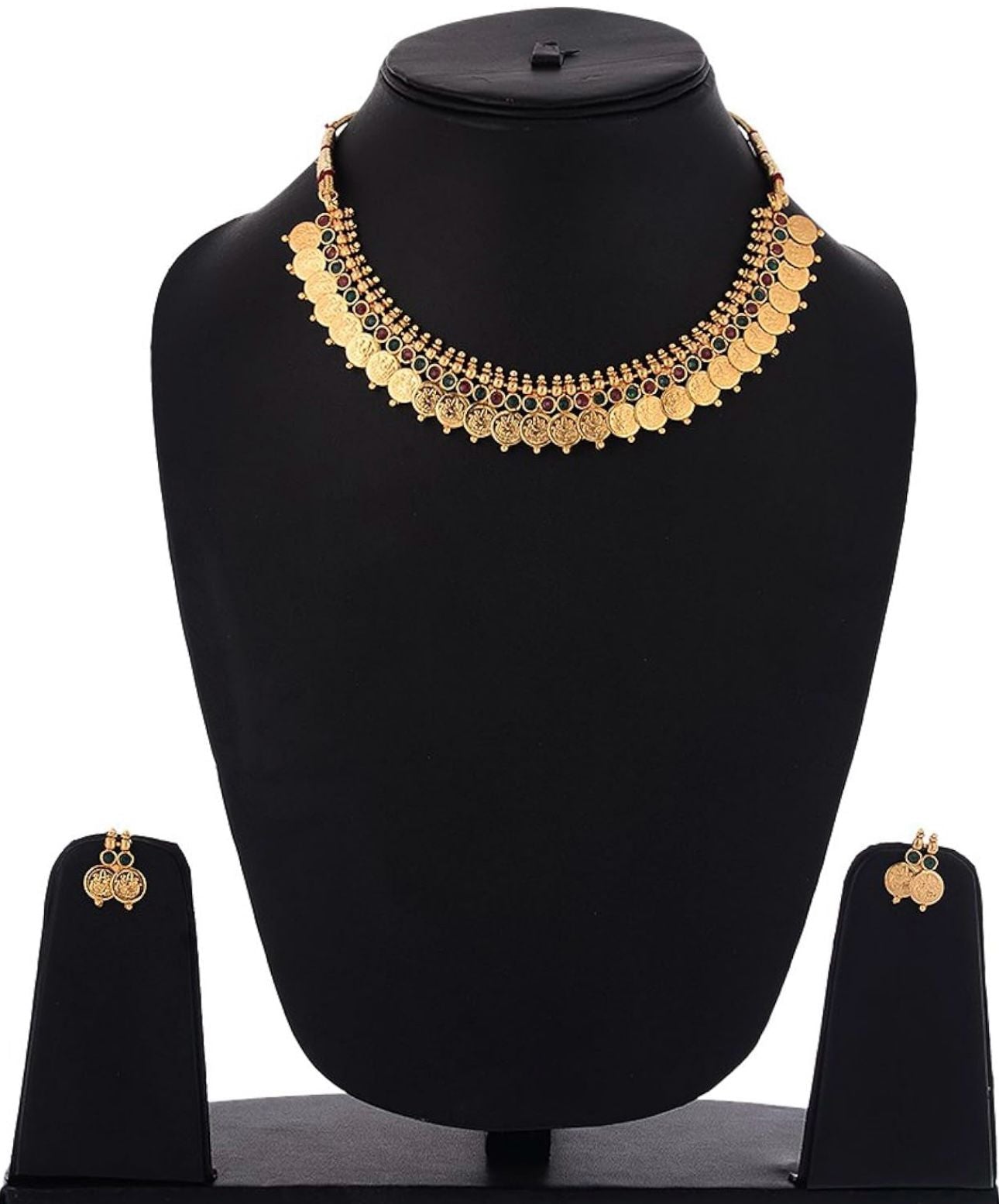 Jewellery Set Gold Plated Traditional Temple Coin Maharani Necklace Set & Red Green Temple Coin Necklace Set With Earring Jewellery For Women and Girls