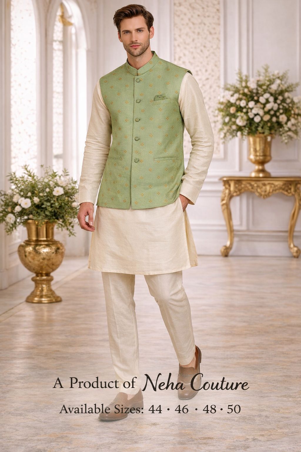 Impressive banarasi silk and jacquard kurta payjama with jacket portrays subtle damask patterns with ornamentation of jacquard work on the collar, front panel and sleeves. Comes with matching bottom