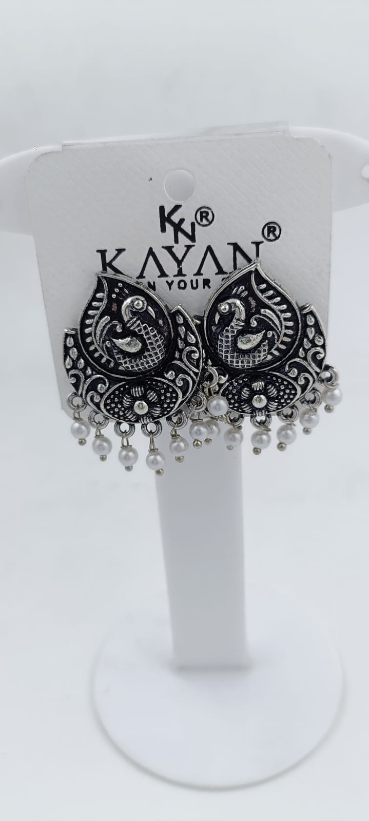 Leaf Pattern Peacock Oxidised Stud Earring is a must-have piece in your collection. These pieces are set in a beautiful silver polish with intricate handwork. These earrings make a statement of their own and lend the perfect finishing touch to any outfit.