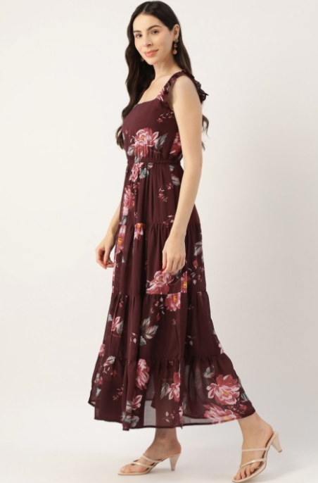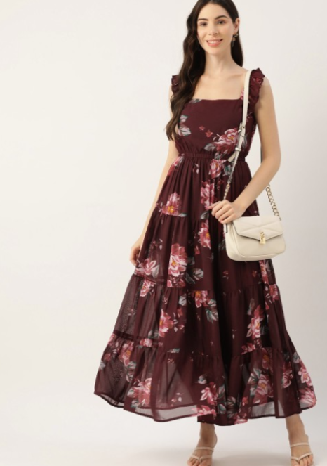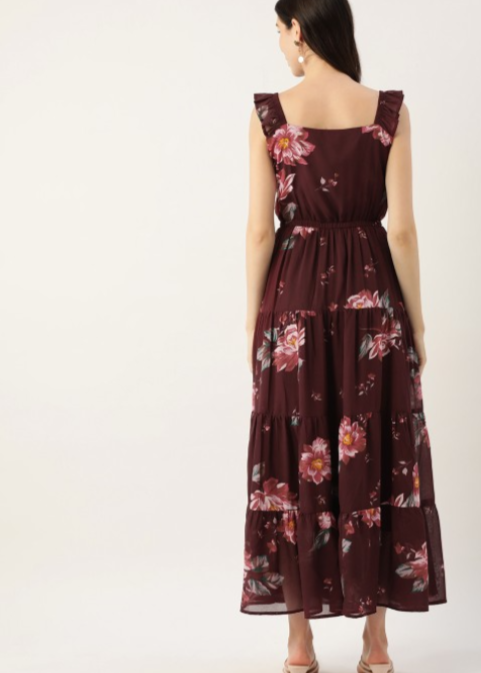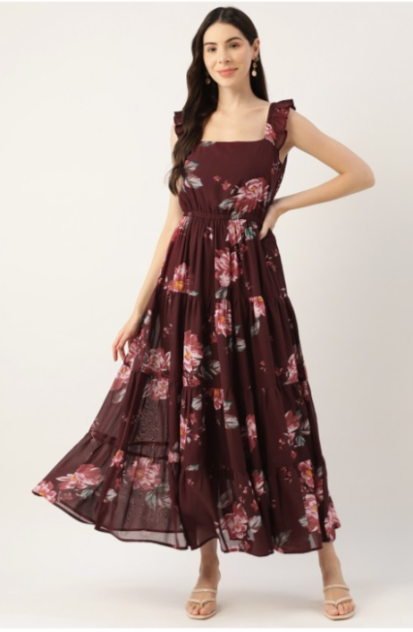 Maroon Floral Georgette A-Line Maxi Dress in Munich