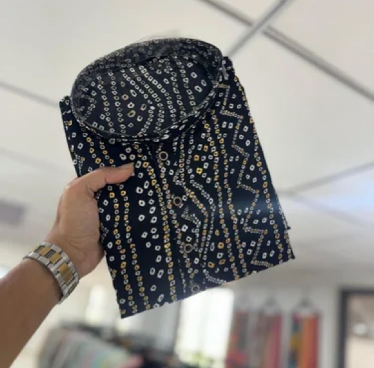 This men's ethnic ensemble is a stylish and comfortable printed kurta, A linen cotton kurta adorned with intricate white and gold bandhani prints in a wavy pattern, giving it a sophisticated yet trendy look. It features a classic straight cut with a mandarin collar and full sleeves for a relaxed fit.perfect for festive and traditional occasions.
