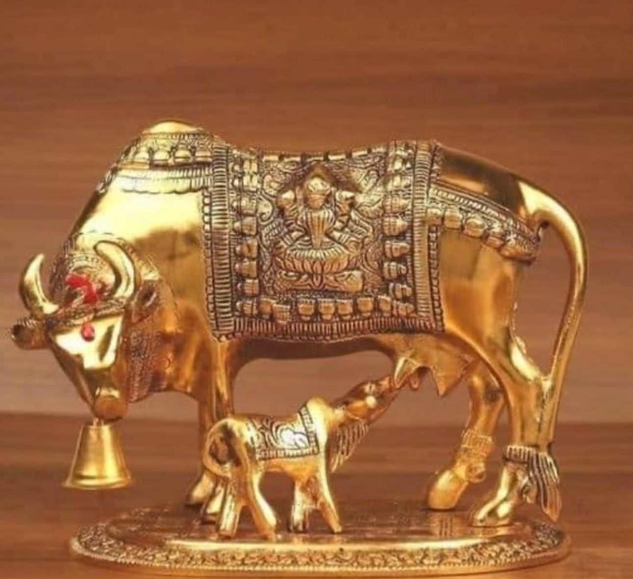 Metal Illuminati Kart-Golden Kamdhenu Cow With Calf Statue in Germany
