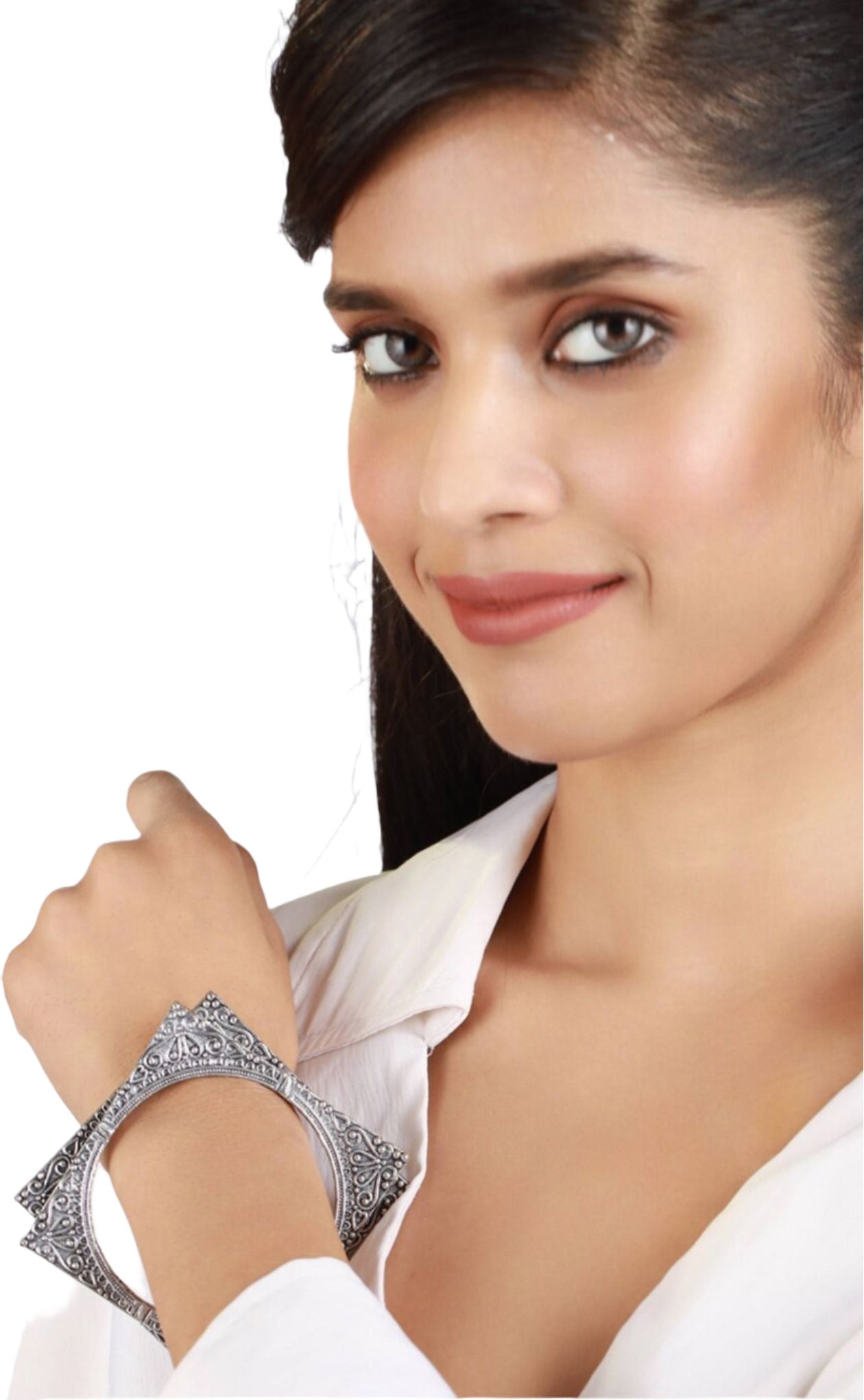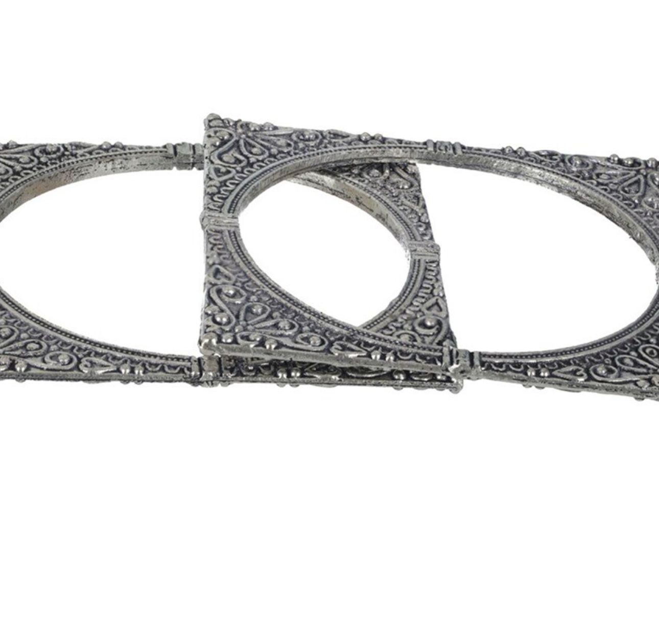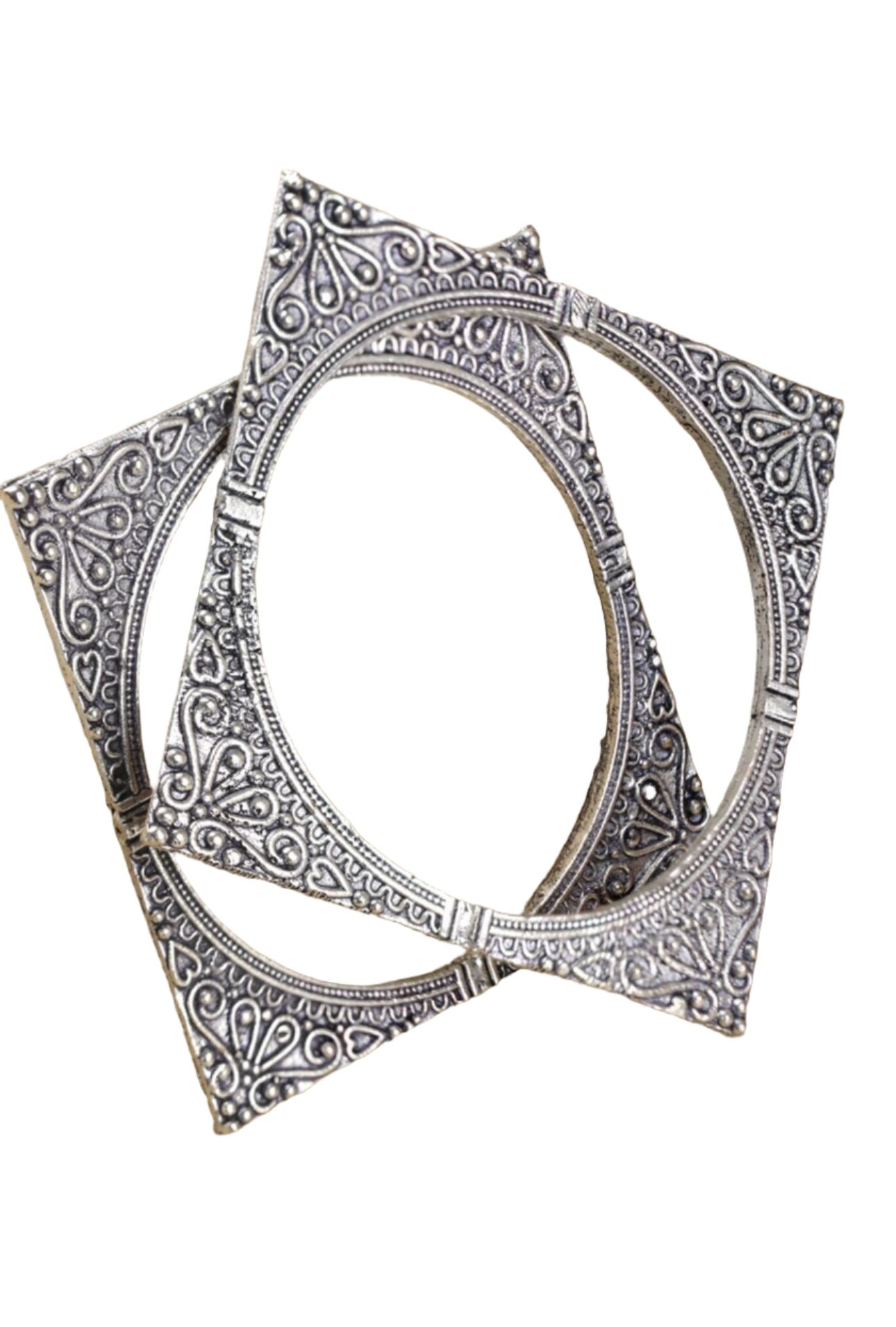 Set of two silver-plated bangles, each has oxidized textured details, secured with slip-on closure