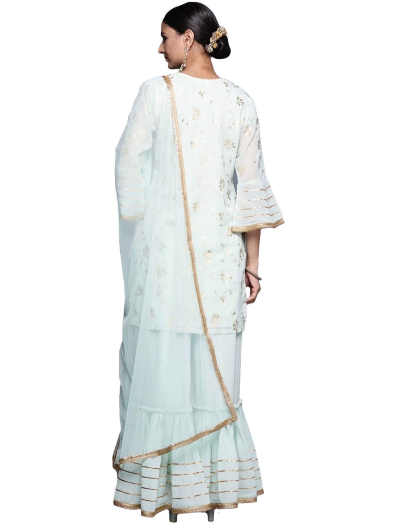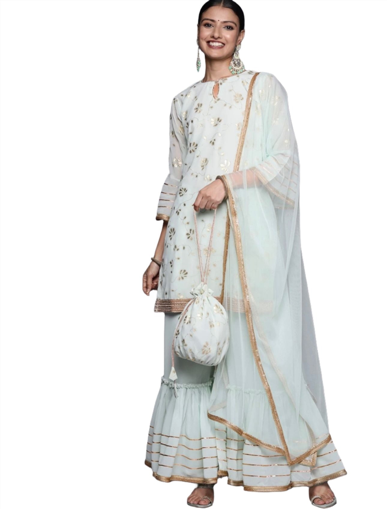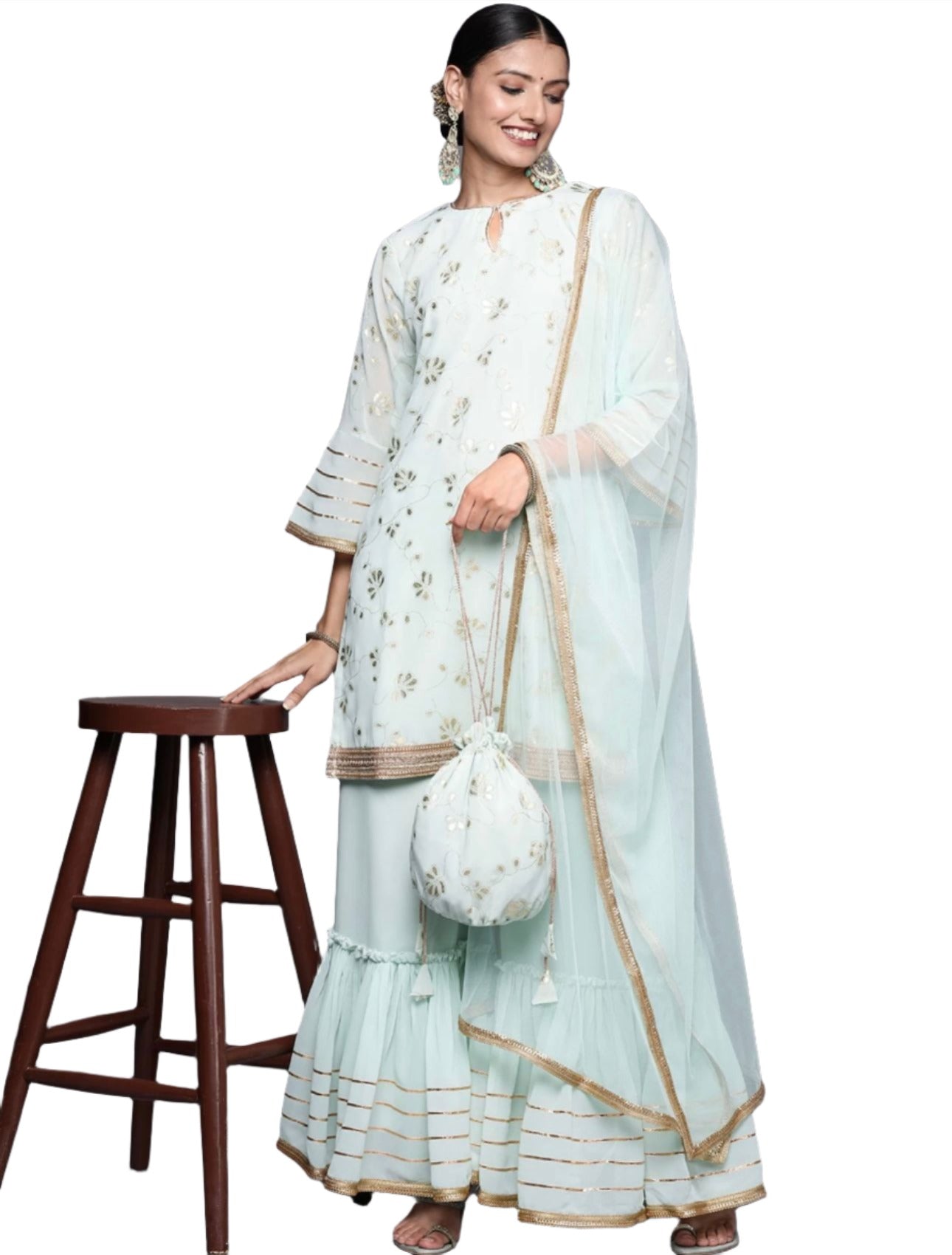 Our 3-piece powder blue georgette sharara set features a straight-fit above knee-length kurti with a keyhole neckline, floral embroidery, sequinned and Gota Patti detailing, and flared three-quarter sleeves. Complemented with embroidered sharara pants, a partially elasticated waistband, slip-on closure, and a matching dupatta, this style comes with a potli and is perfect for festive occasions.
