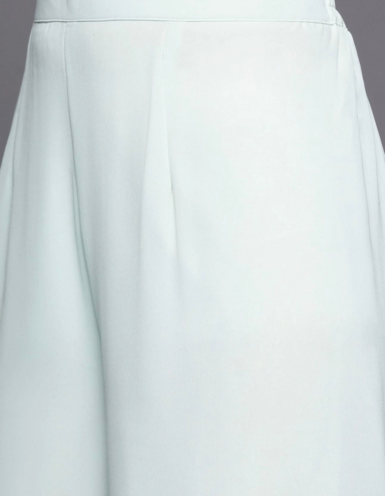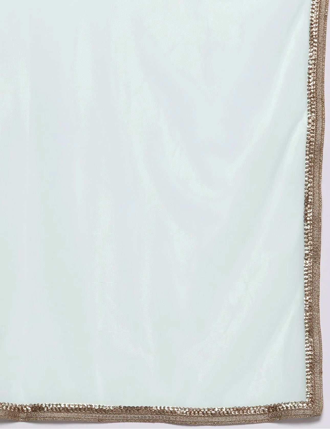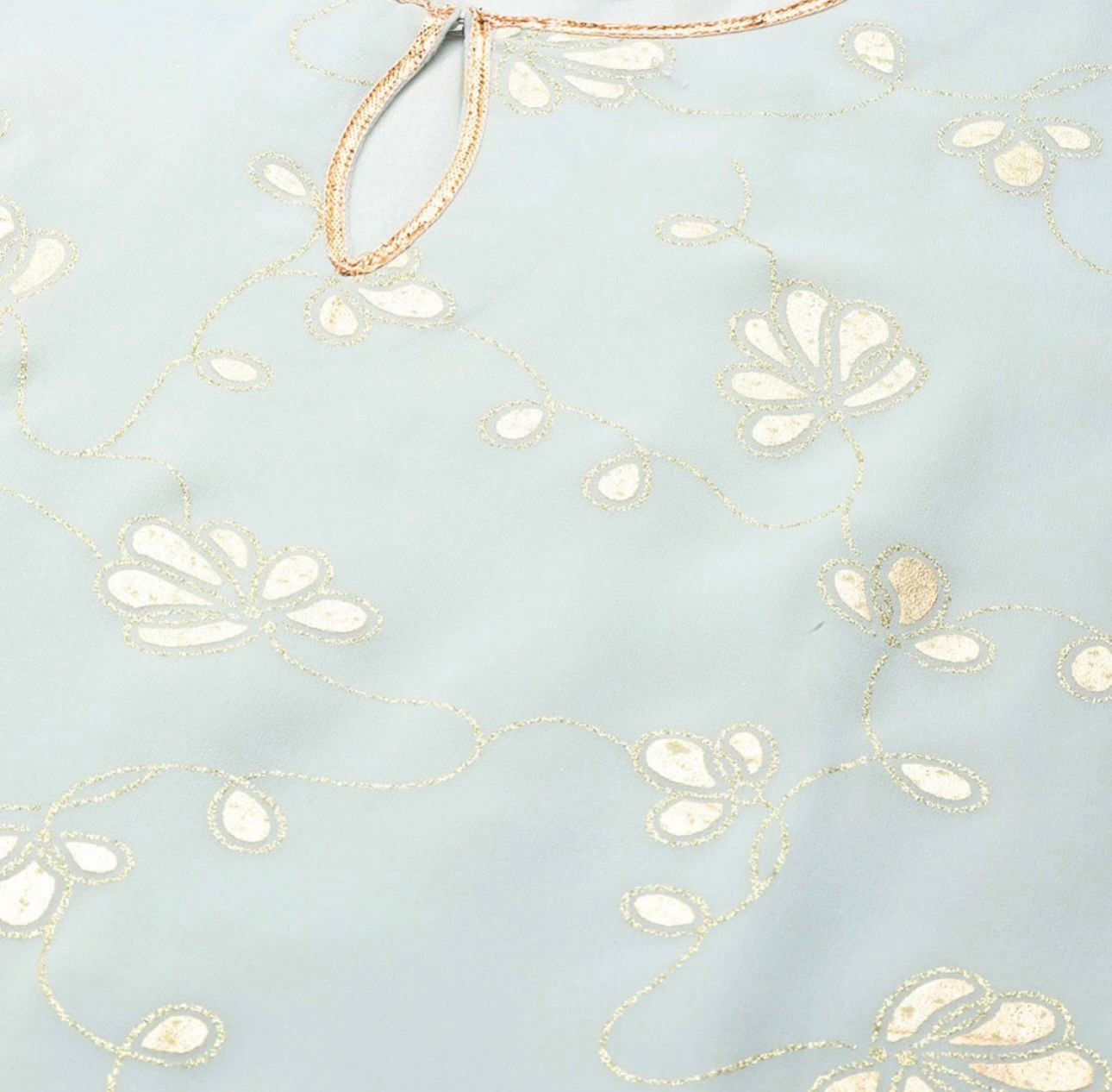 Our 3-piece powder blue georgette sharara set features a straight-fit above knee-length kurti with a keyhole neckline, floral embroidery, sequinned and Gota Patti detailing, and flared three-quarter sleeves. Complemented with embroidered sharara pants, a partially elasticated waistband, slip-on closure, and a matching dupatta, this style comes with a potli and is perfect for festive occasions.