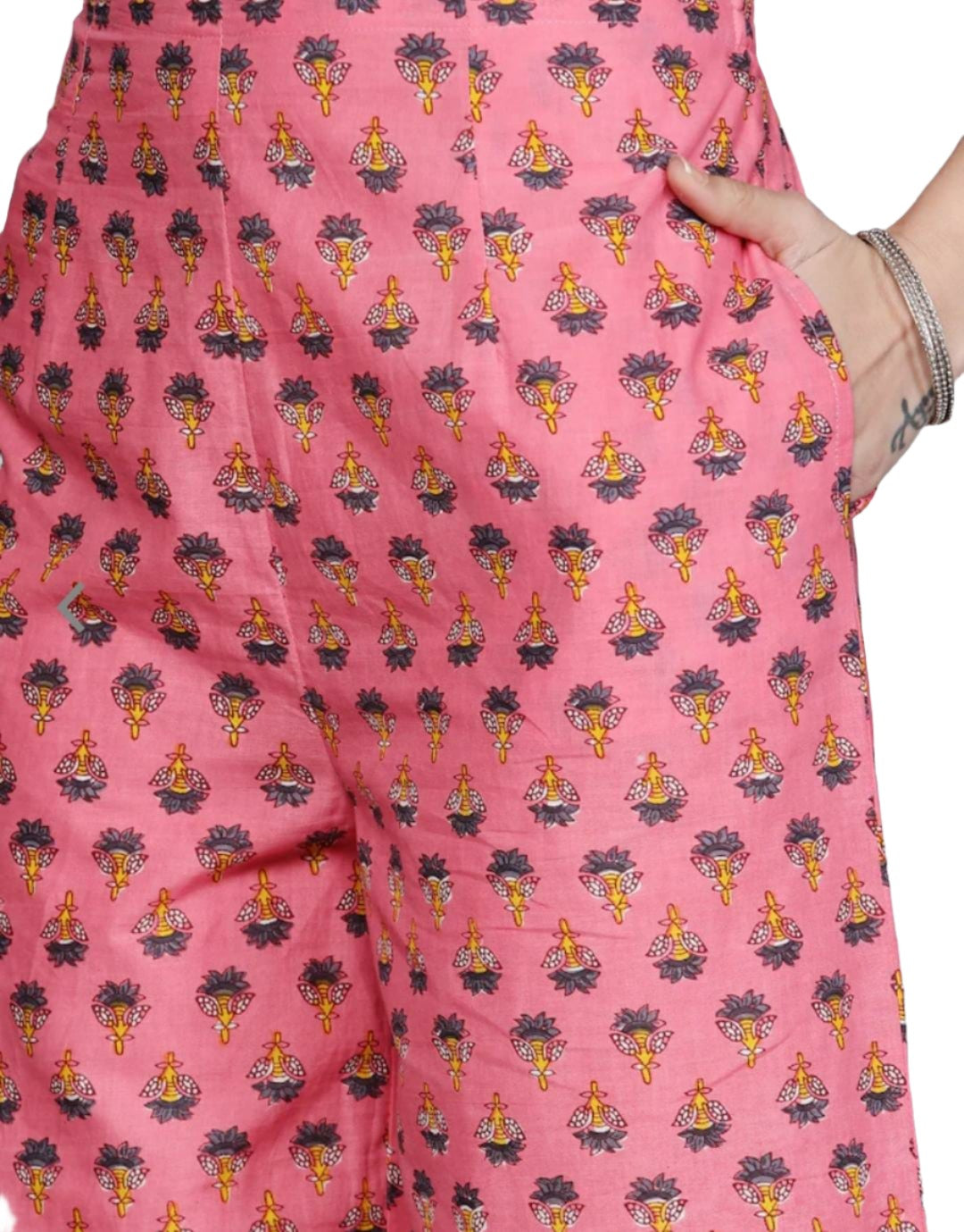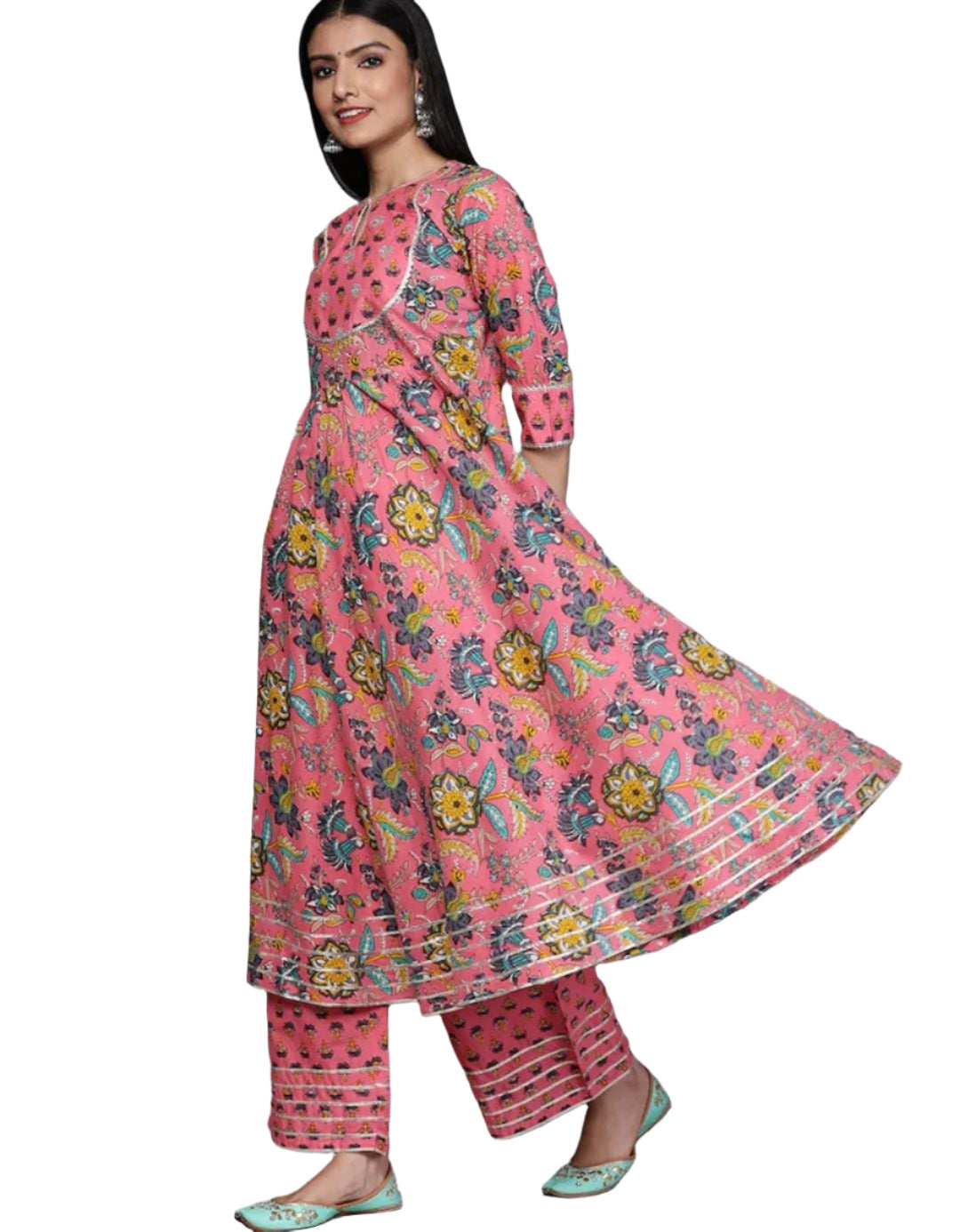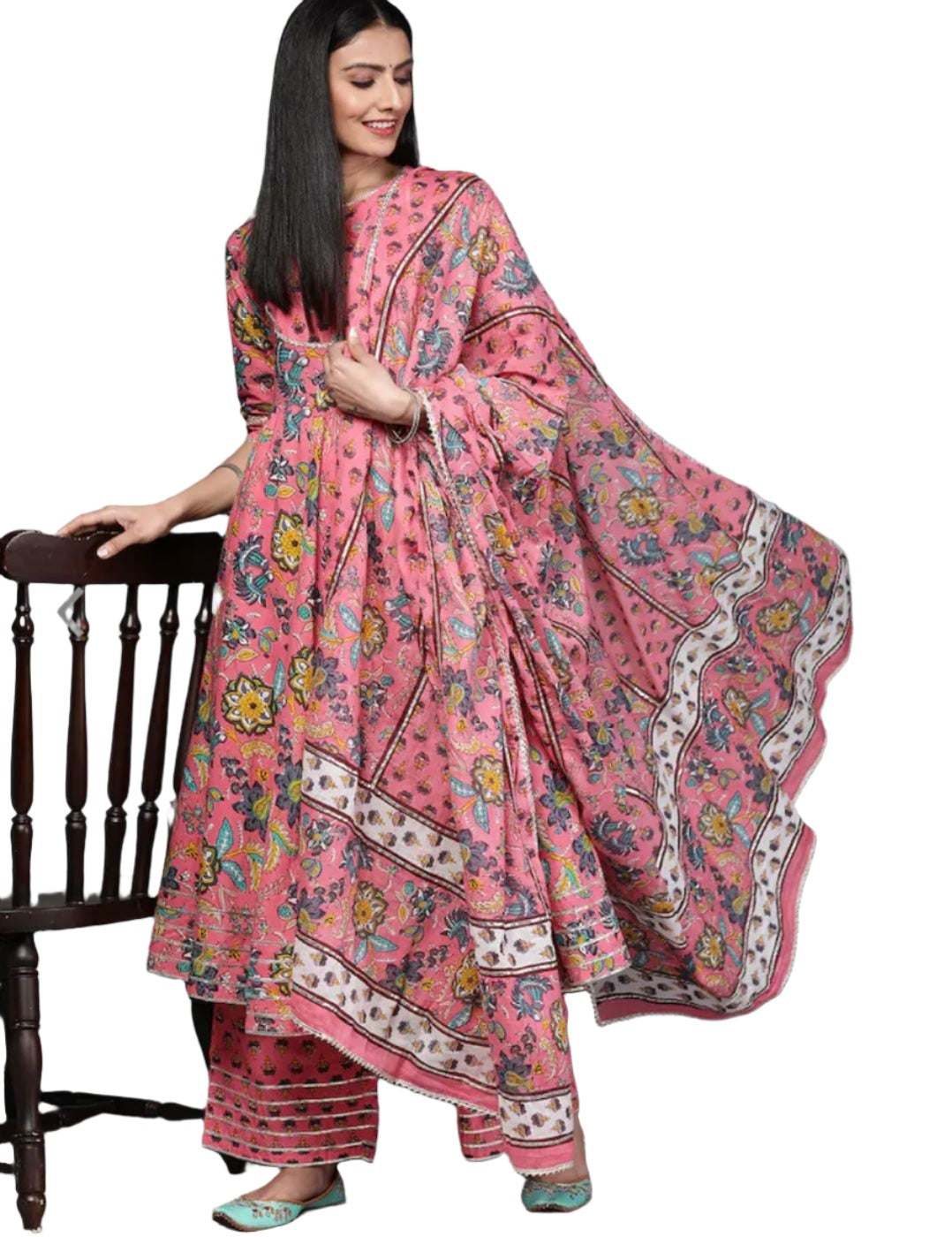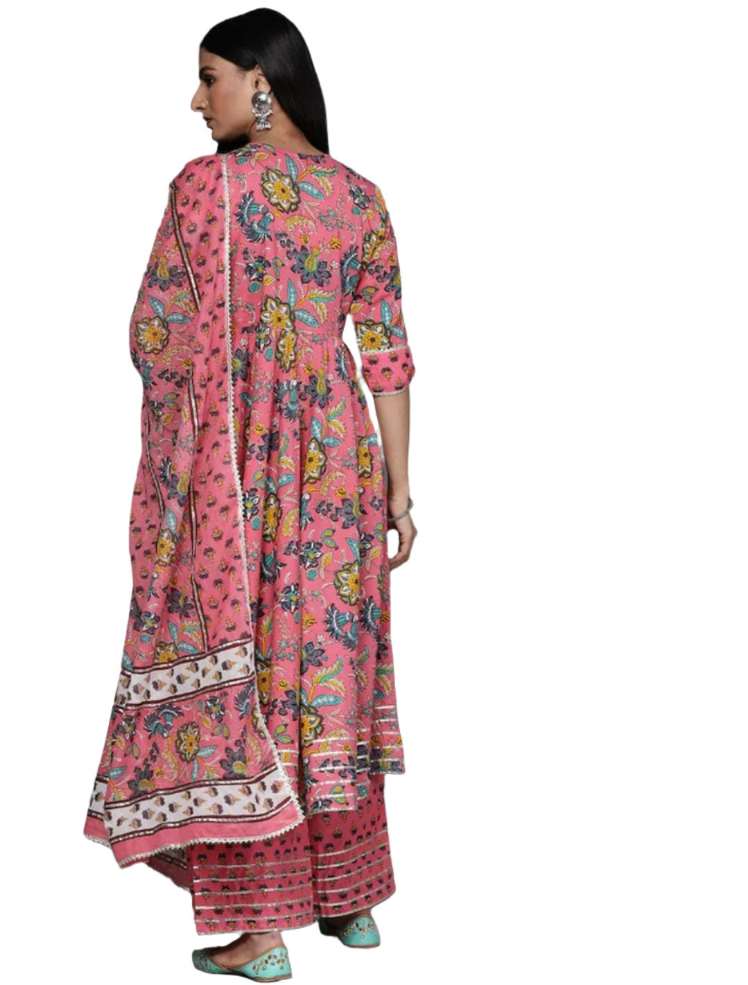 Our 3-piece pink printed cotton suit set features a floral print Anarkali kurta with a keyhole neckline and a statement yoke, straight palazzo pants with a partially elasticated waistband and roomy pockets, and a complementing dupatta. Accentuated with delicate Gota Patti details, this elegant ensemble is perfect for festive celebrations.