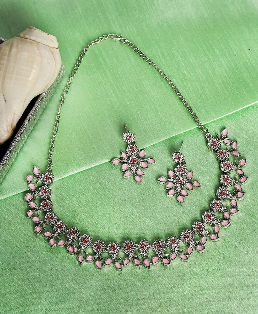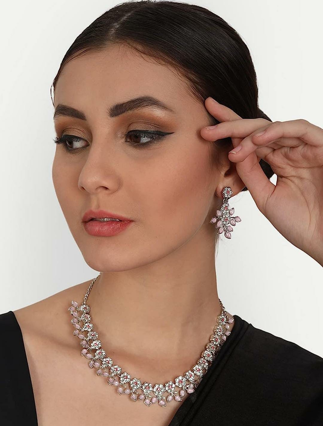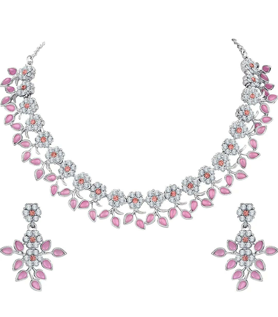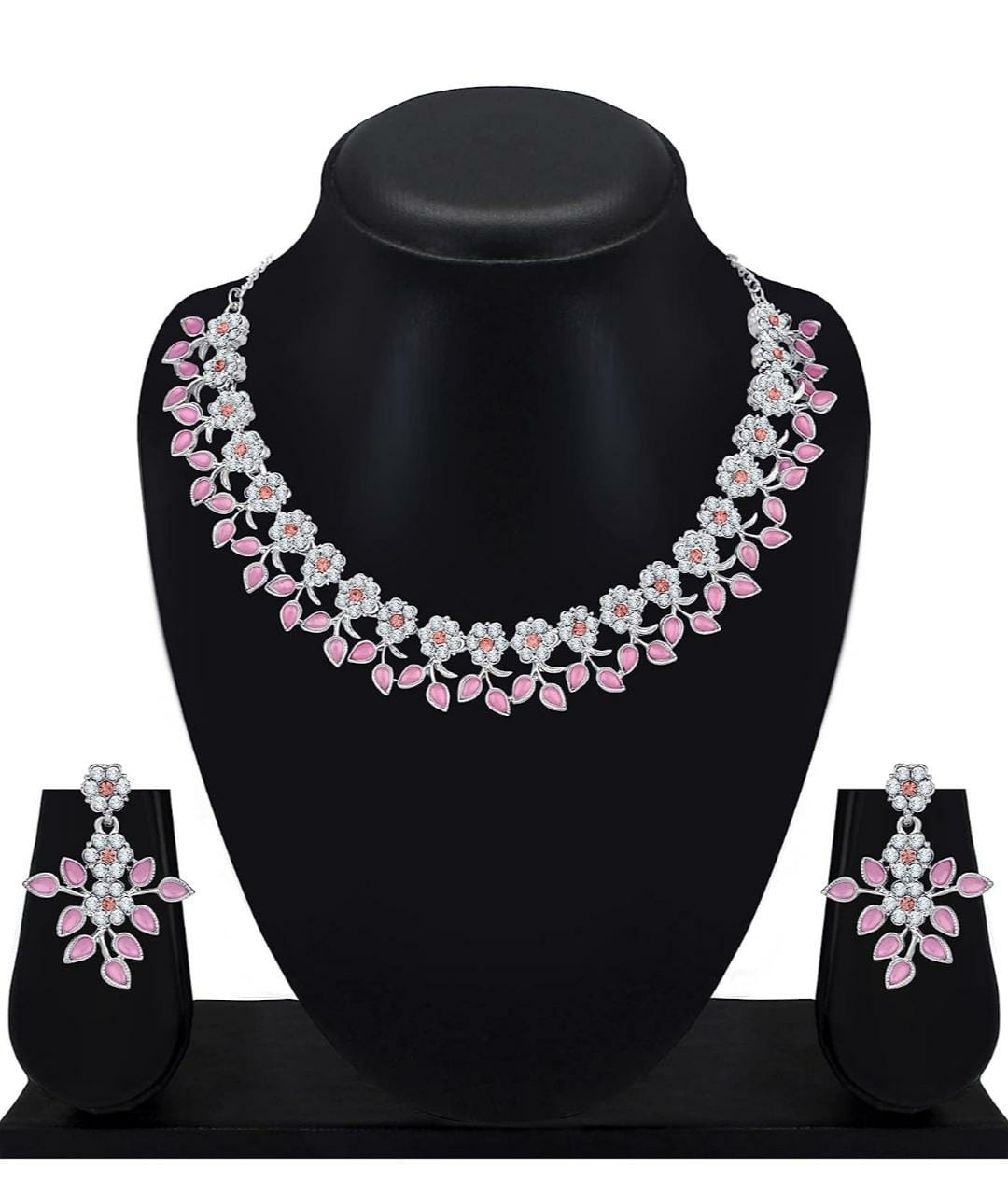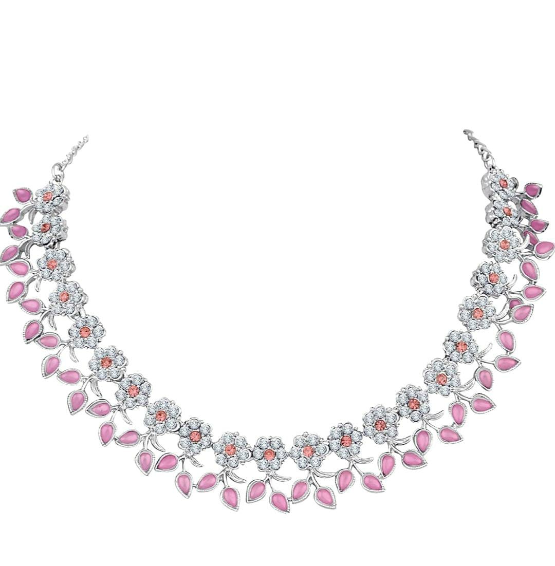 Pink Kundan Silver Plated Crystal AD Diamond Necklace Jewellery Set with Earrings for Women and Girls Suits Best Party, Wedding and Occasional Wear