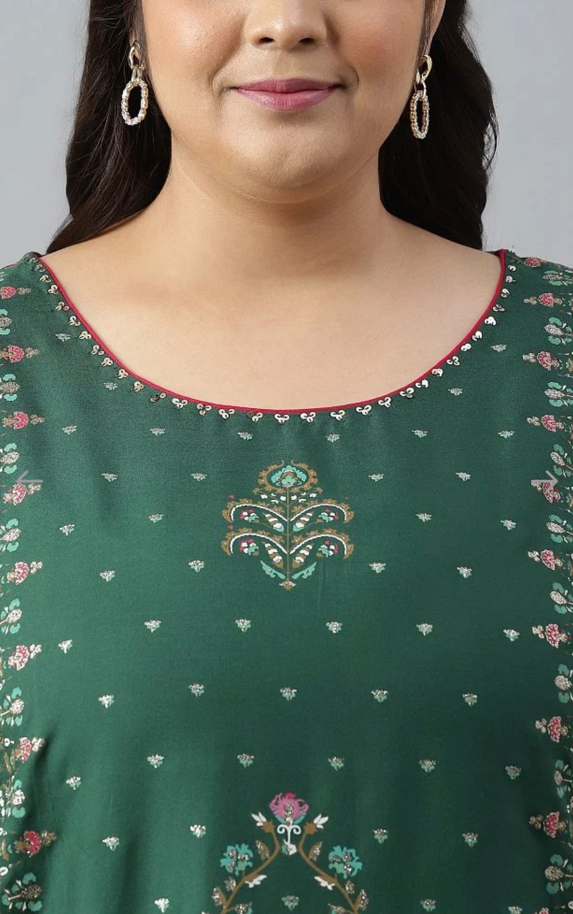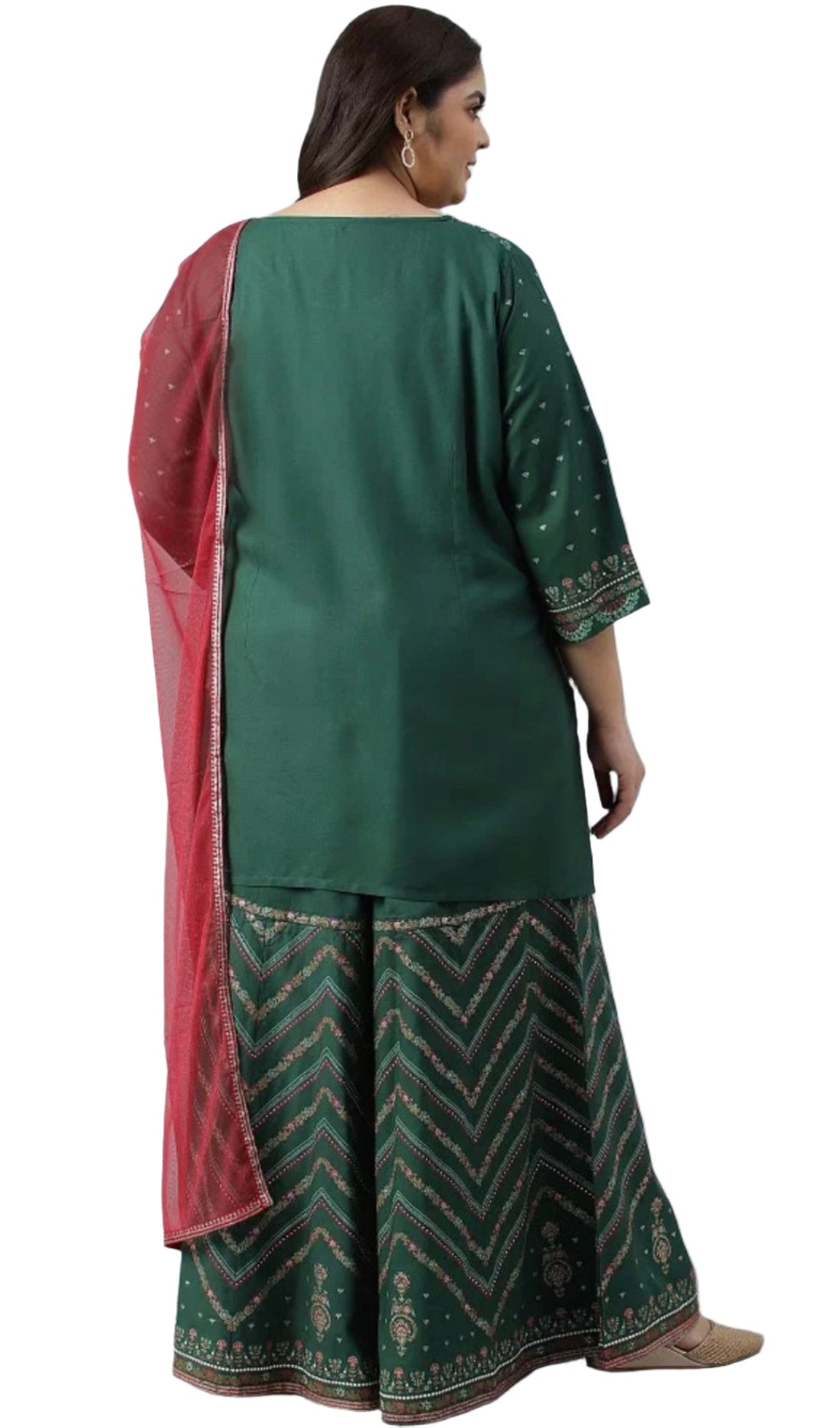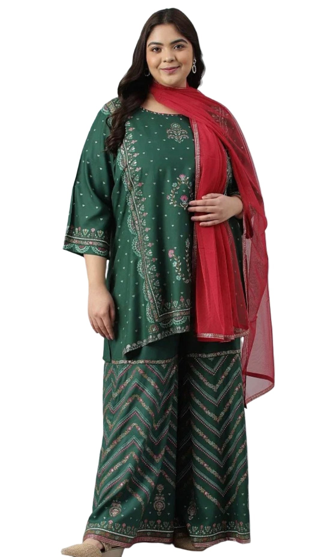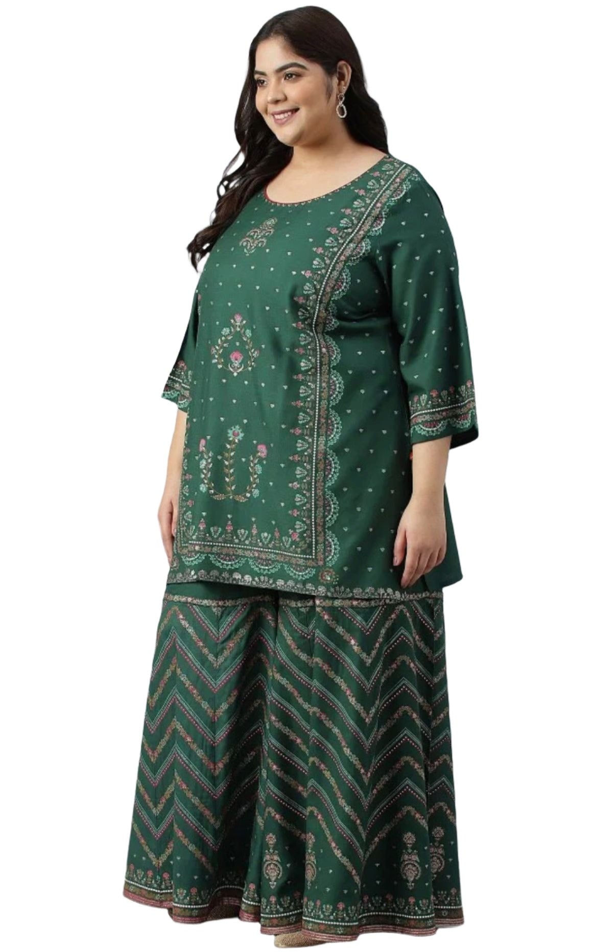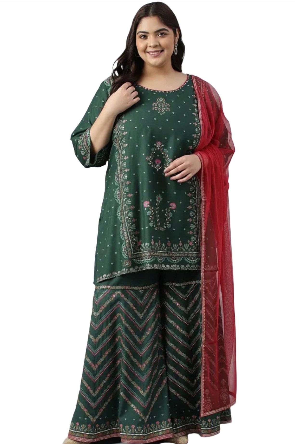 Plus Size Dark Green Glitter Floral Printed kurta With Sharara Pants And Pink Dupatta in Berlin