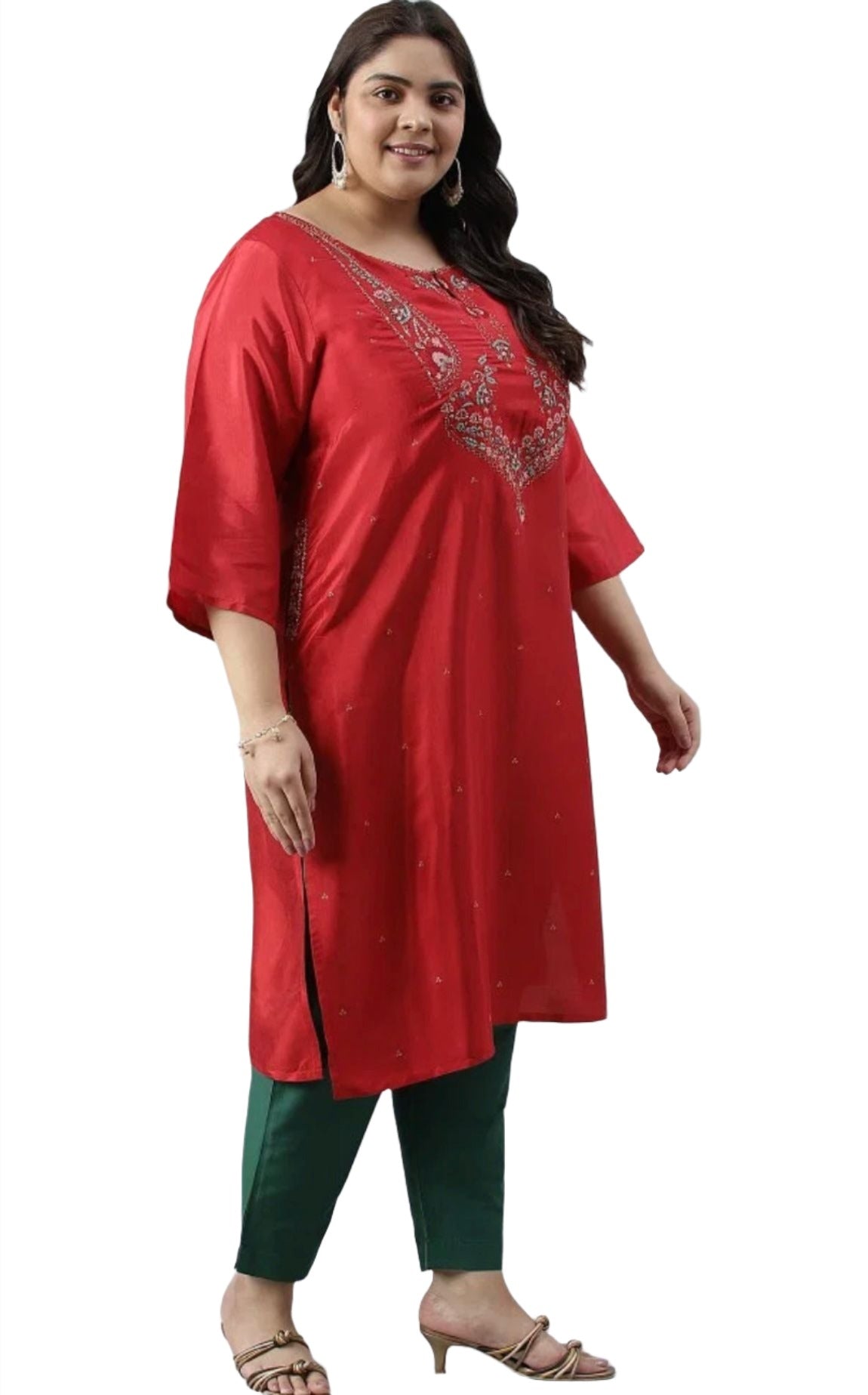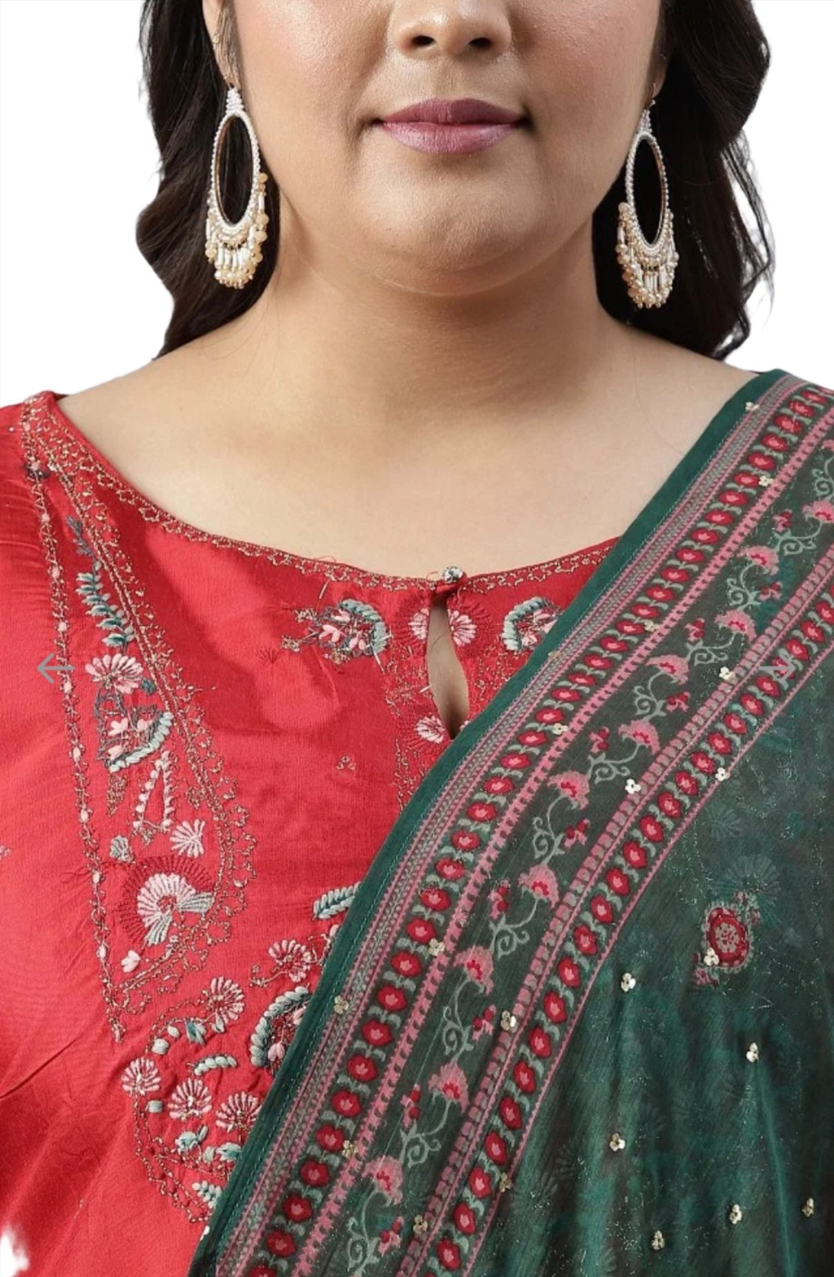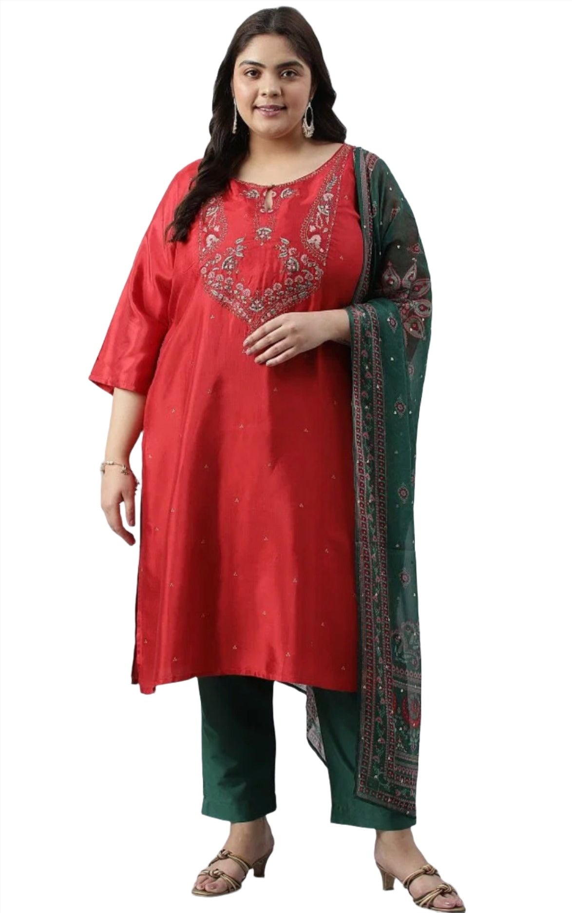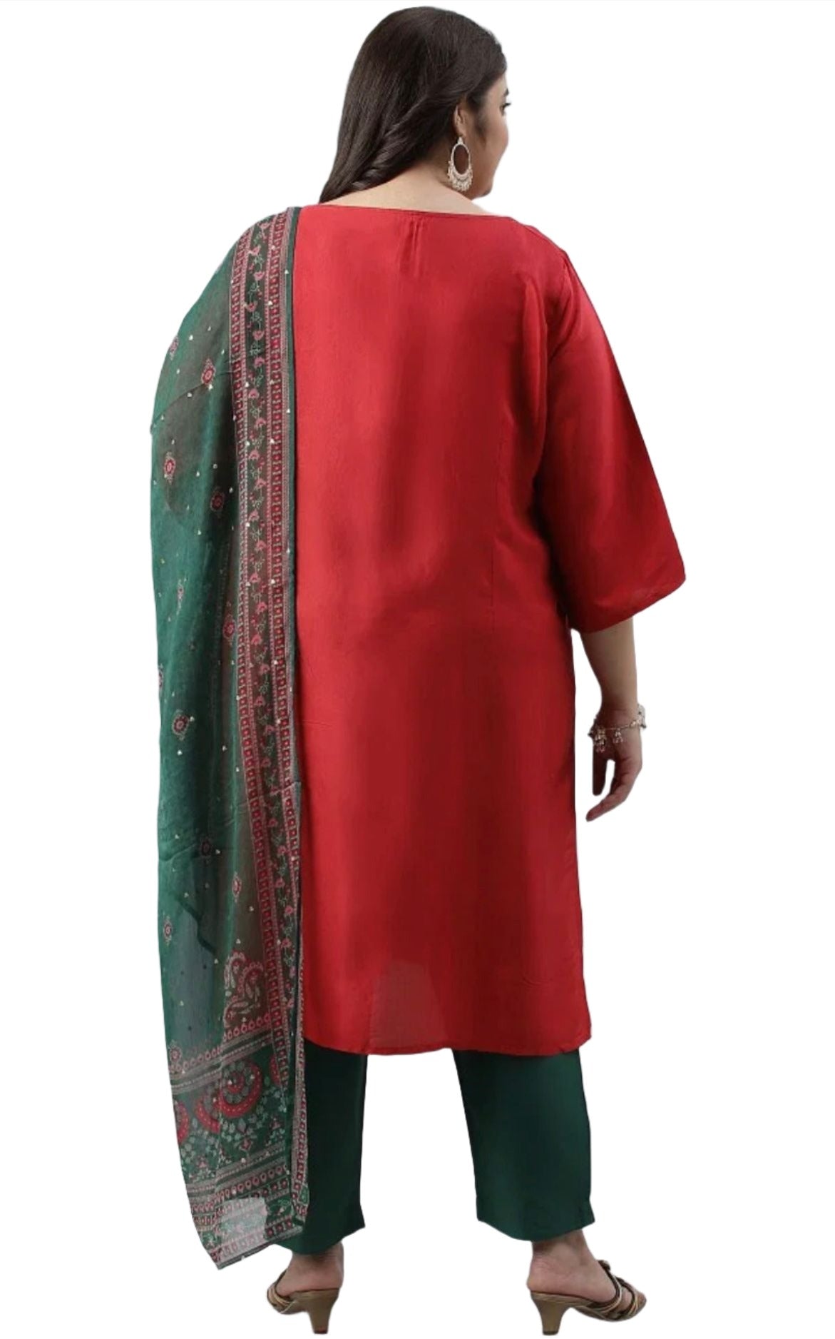 Plus Size Red Glitter Printed Festive kurta With Green Slim Pants And Printed Dupatta in Poland