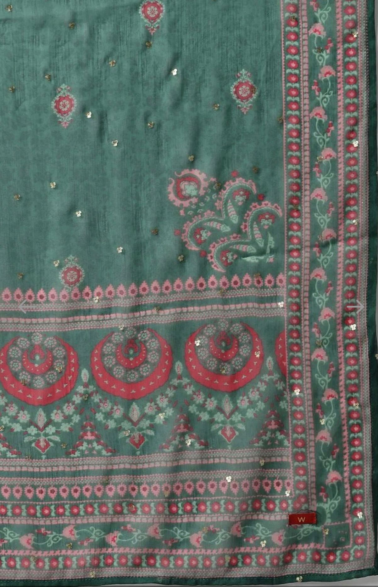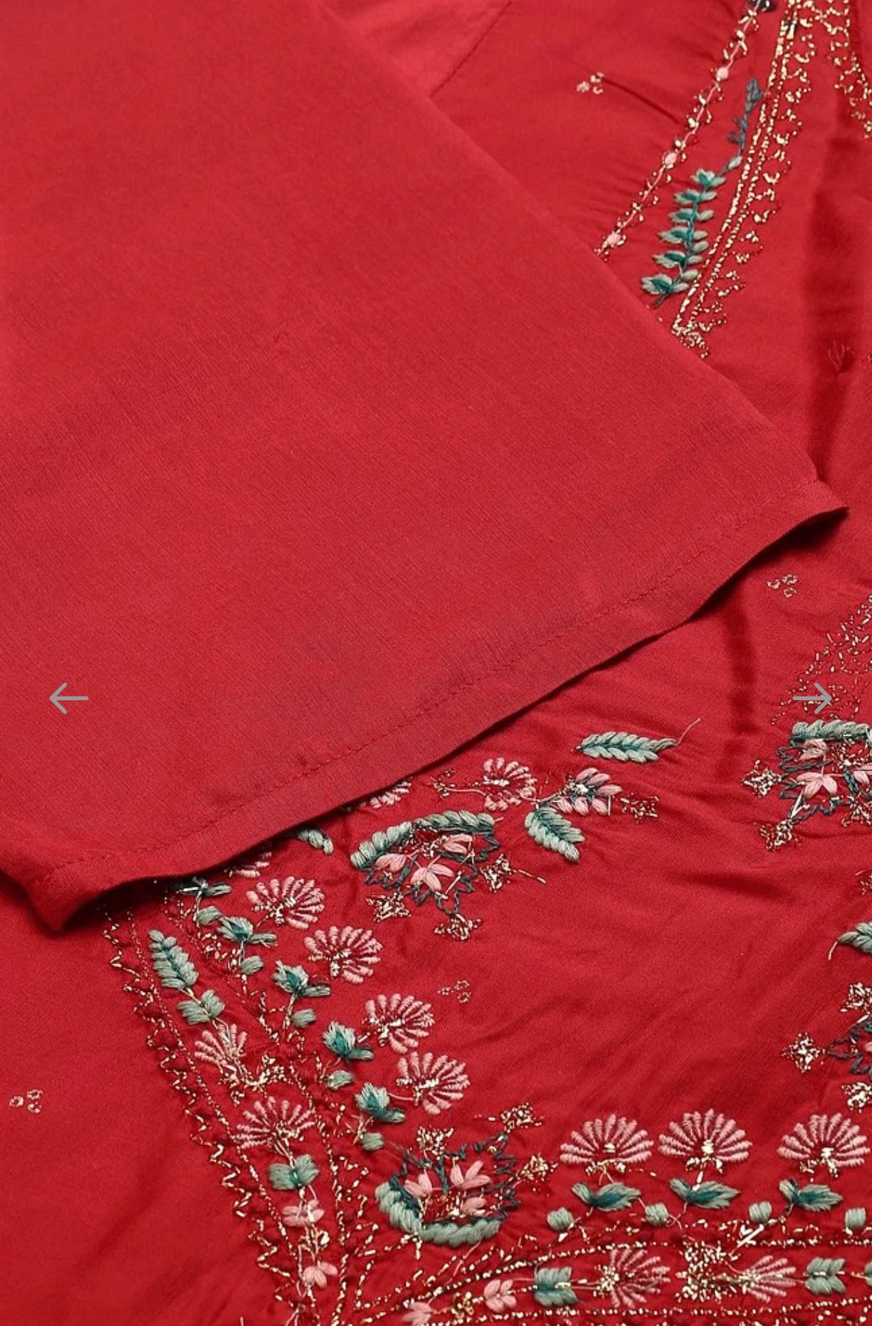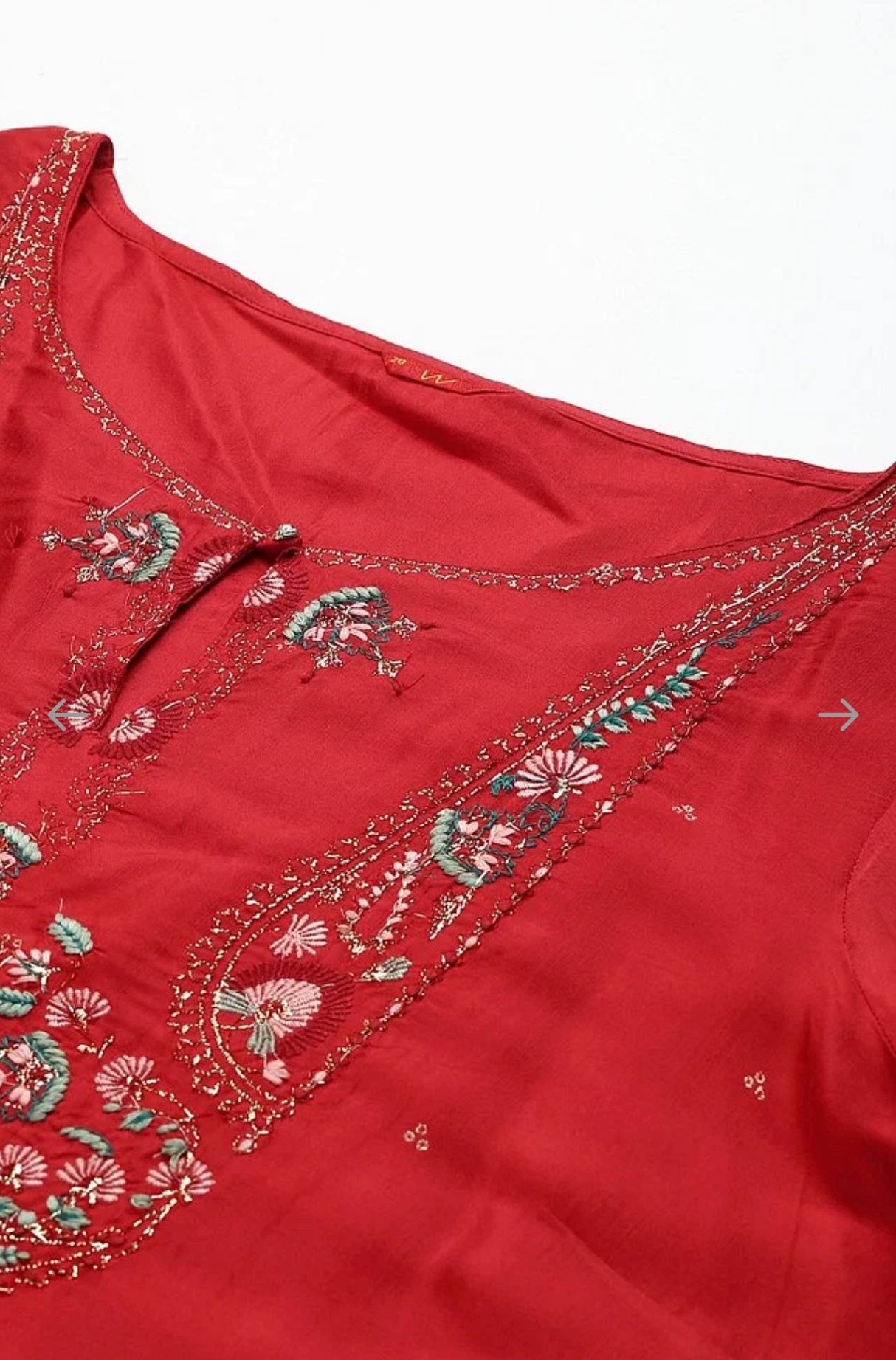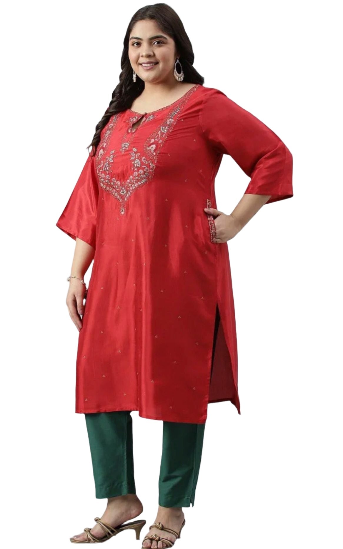 Plus Size Red Glitter Printed Festive kurta With Green Slim Pants And Printed Dupatta in Poland
