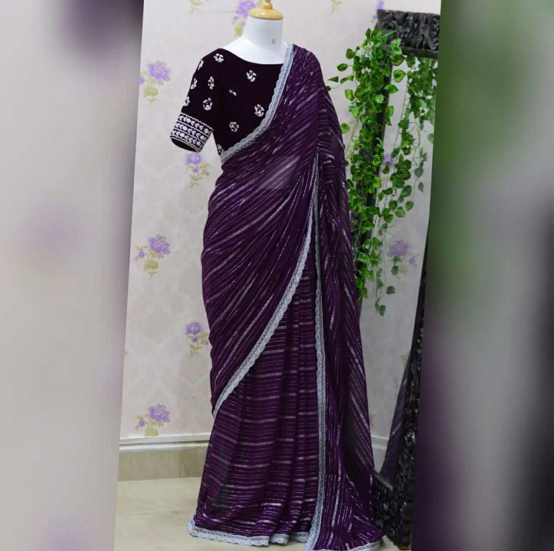 🌷🌷 Beautiful pure viscos georgette saree with fancy lace border & paired up with nice Velvet Blouse
