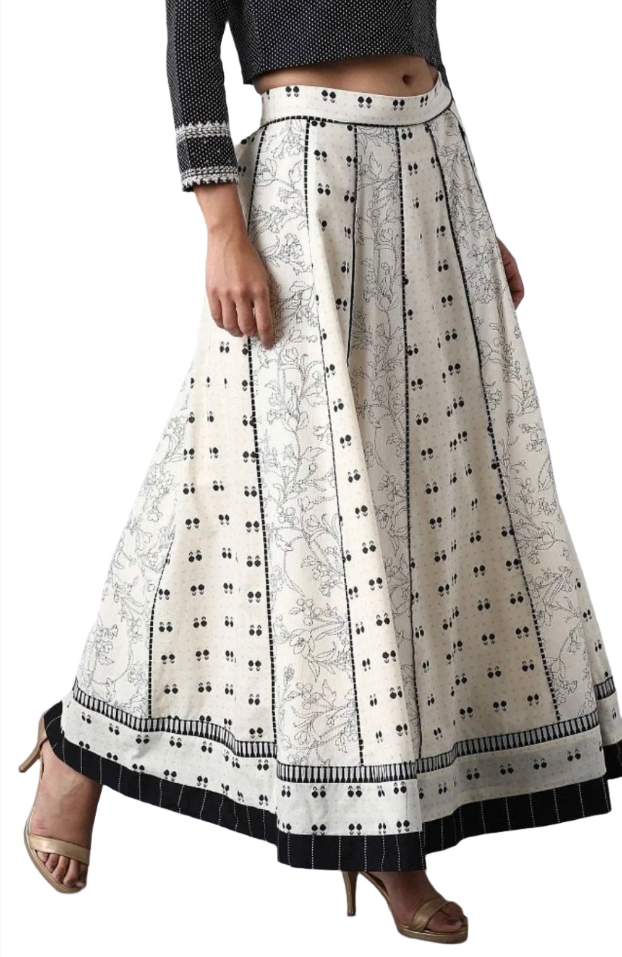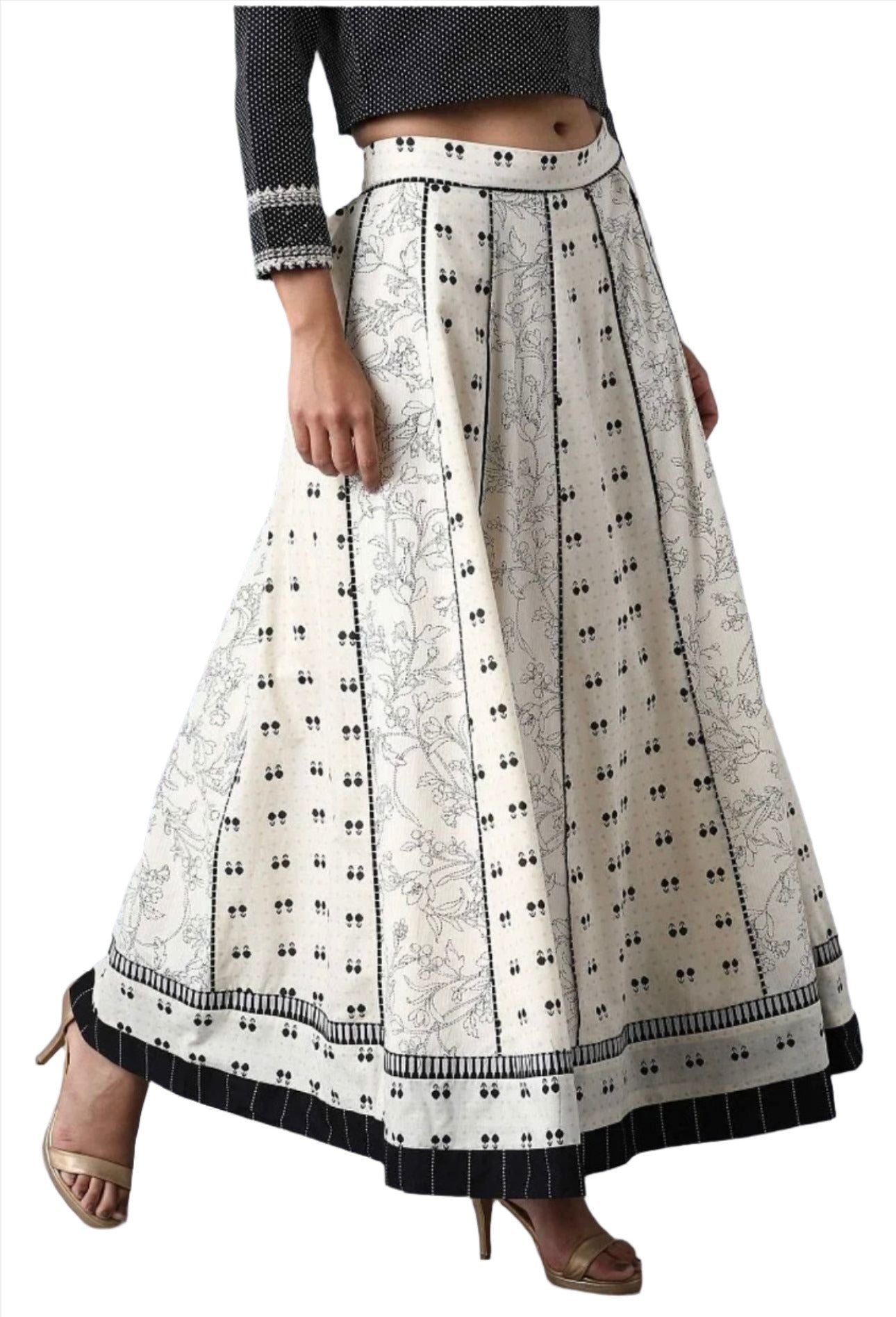Black and Ecru mix-match Panelled flared skirt in floral print with hook & bar and zip.