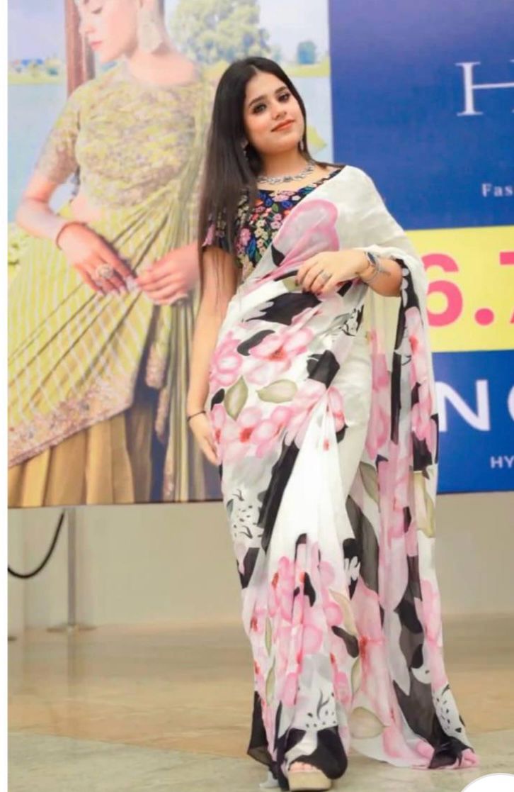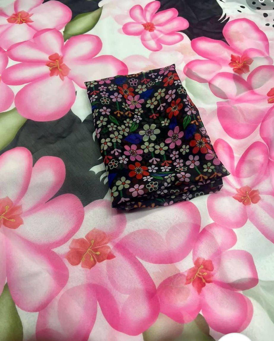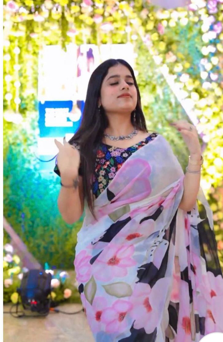Soft gorgette party Stylish saree with digital blouse {unstitched}
