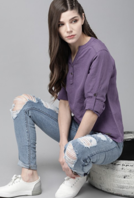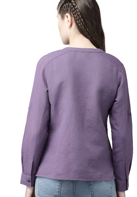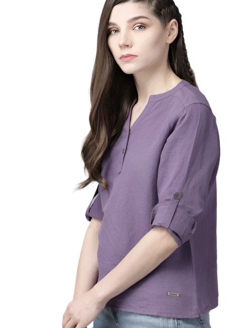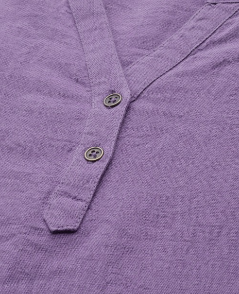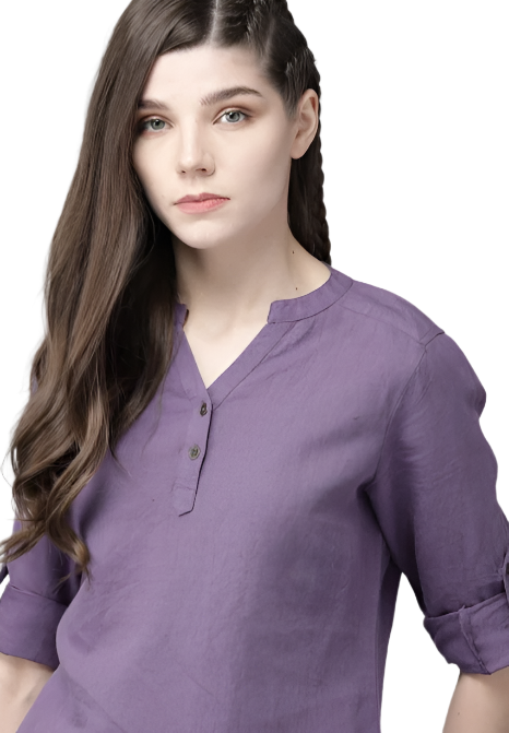 The Lifestyle Co Purple Cotton Linen Solid Mandarin Collar Top in Munich