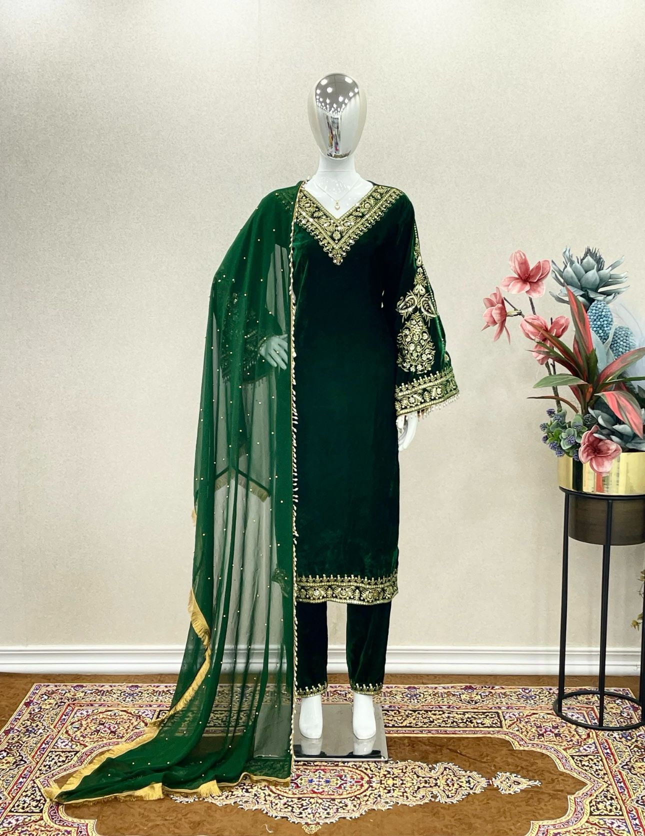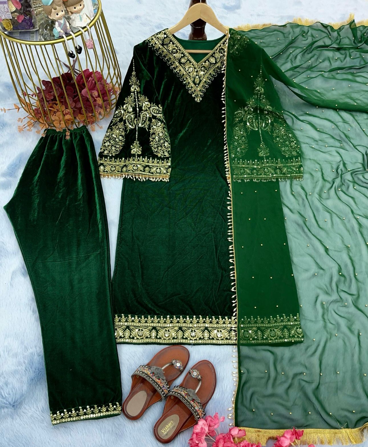 👉🧚♀️ Top Fabric:Heavy Pure Viscose Velvet With Embroidery 5 mm Sequence Work With Fancy Bell Sleeve & Fancy Moti Latkan