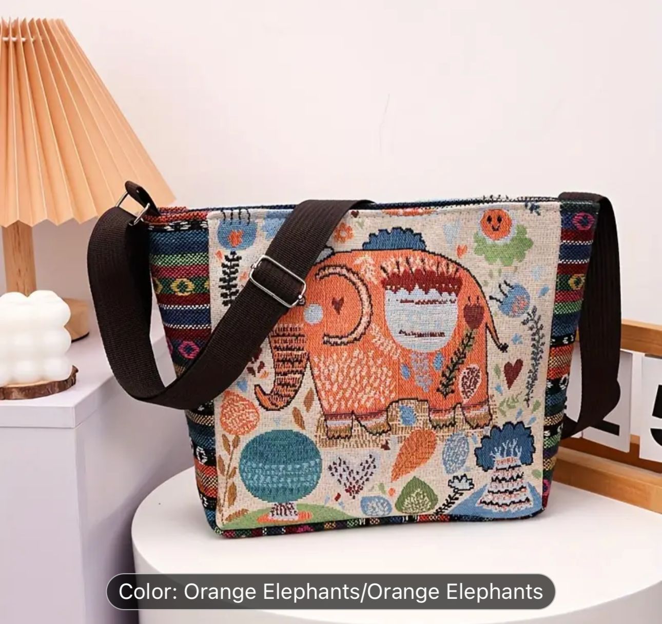 Vibrant Elephant Crossbody Bag – Ethnic Knit Shoulder Bag for Women, Adjustable Strap, Zipper Closure, Foldable Design, Animal Print, Multicolor Fabric, Casual & Stylish