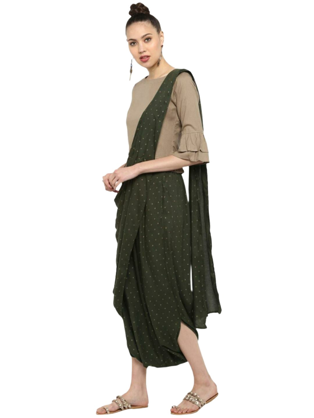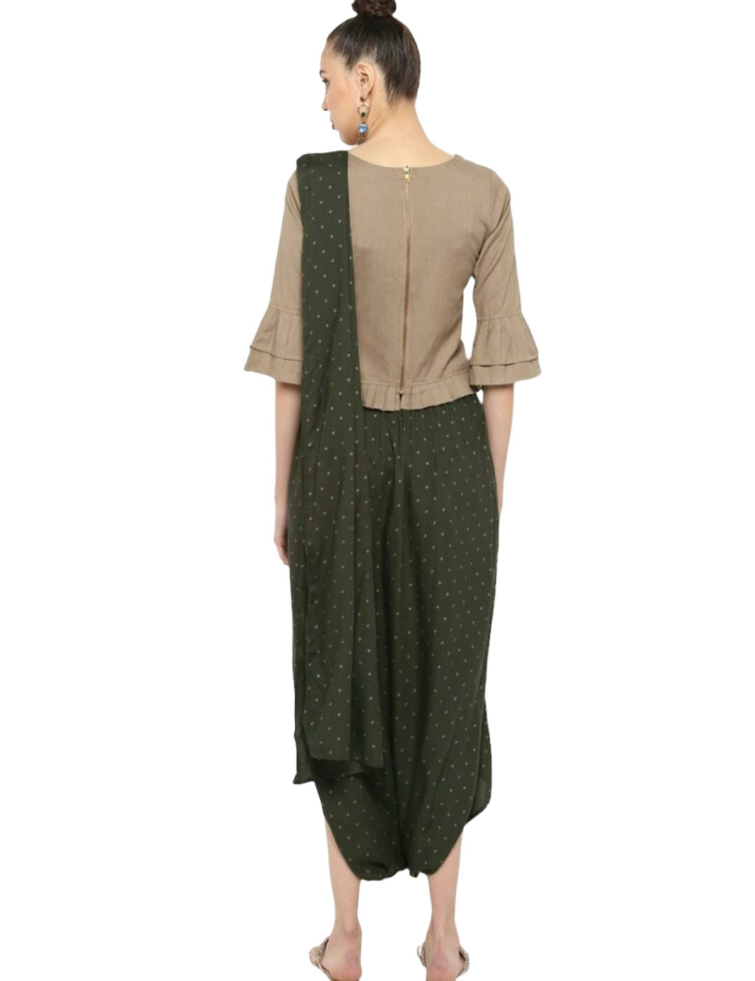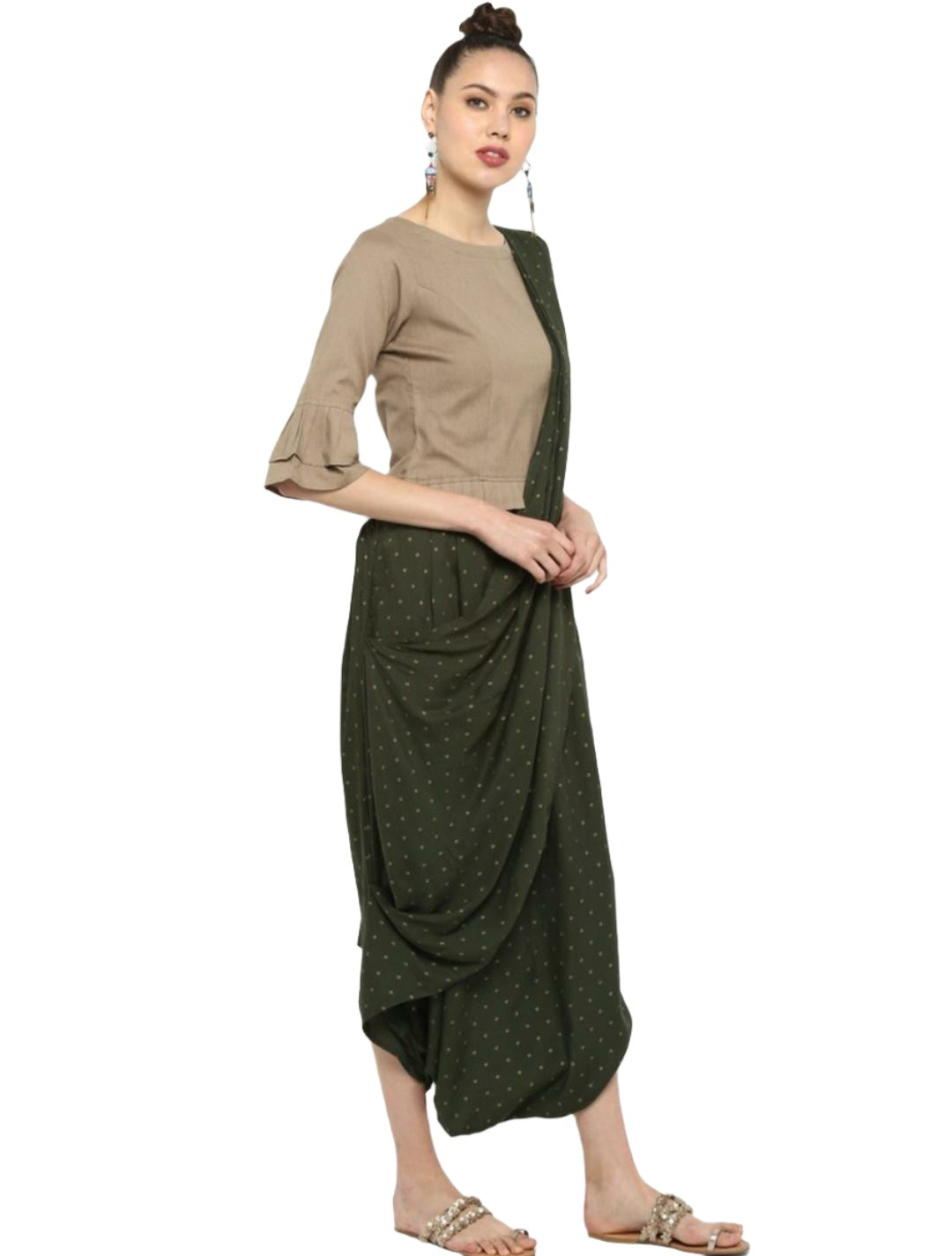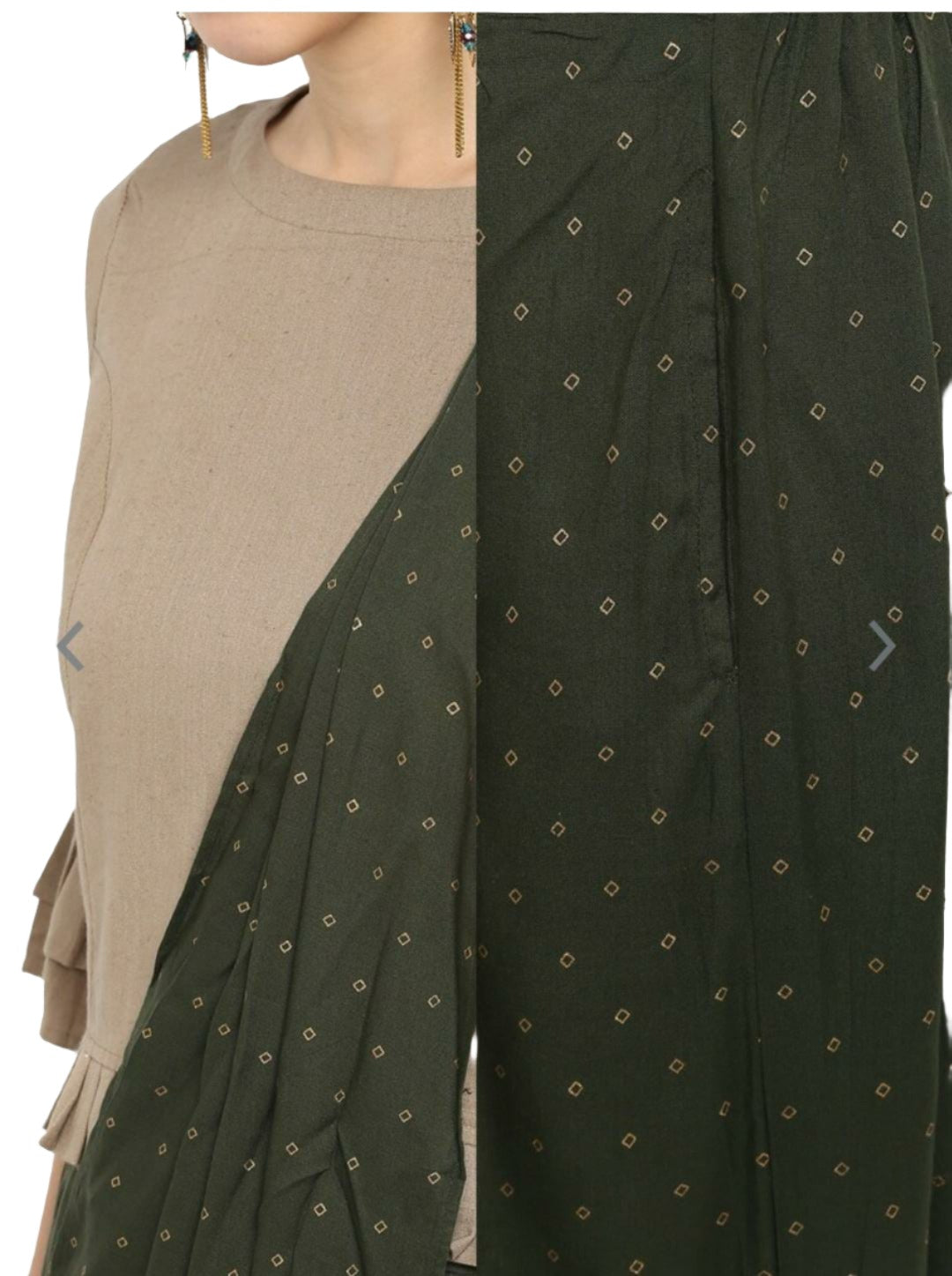 Beige straight above knee kurta, has a round neck, three-quarter sleeves, flared hem