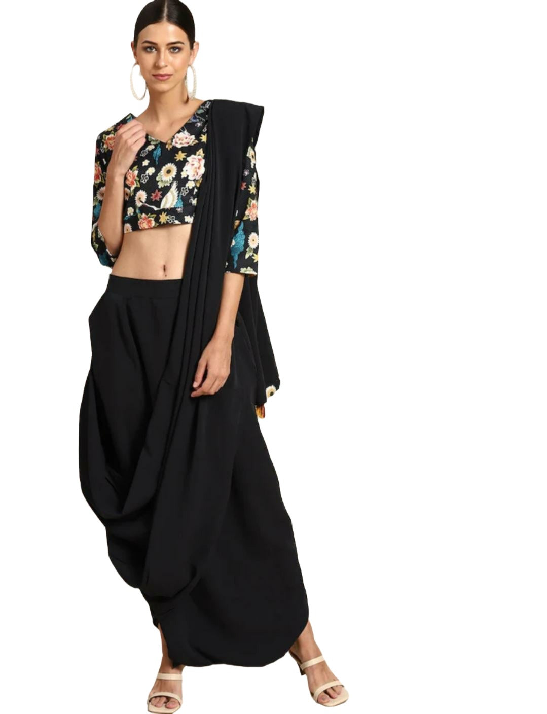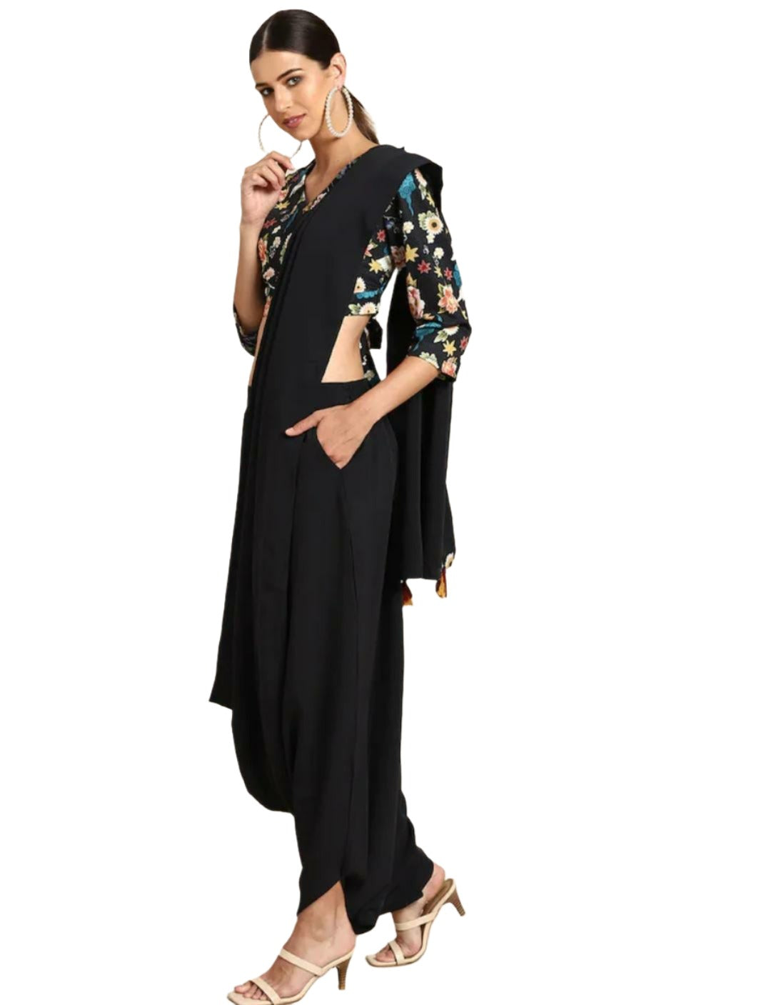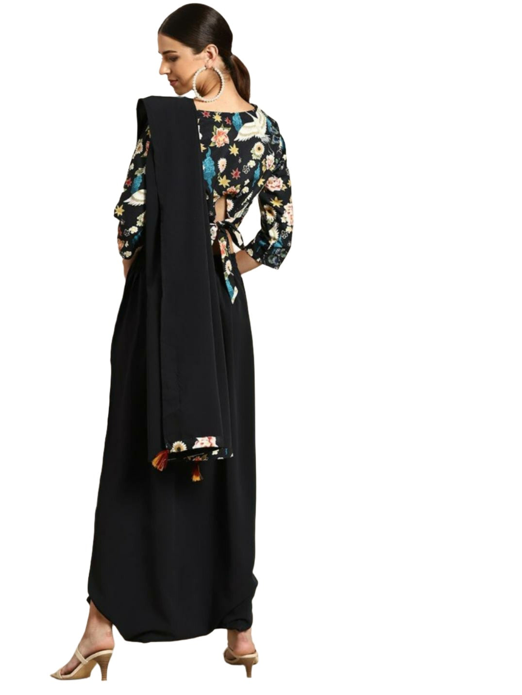Women Black Floral Printed Regular Top with Harem Pants with Attached Dupatta
