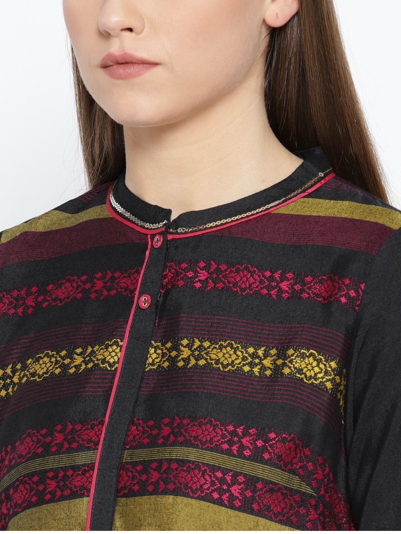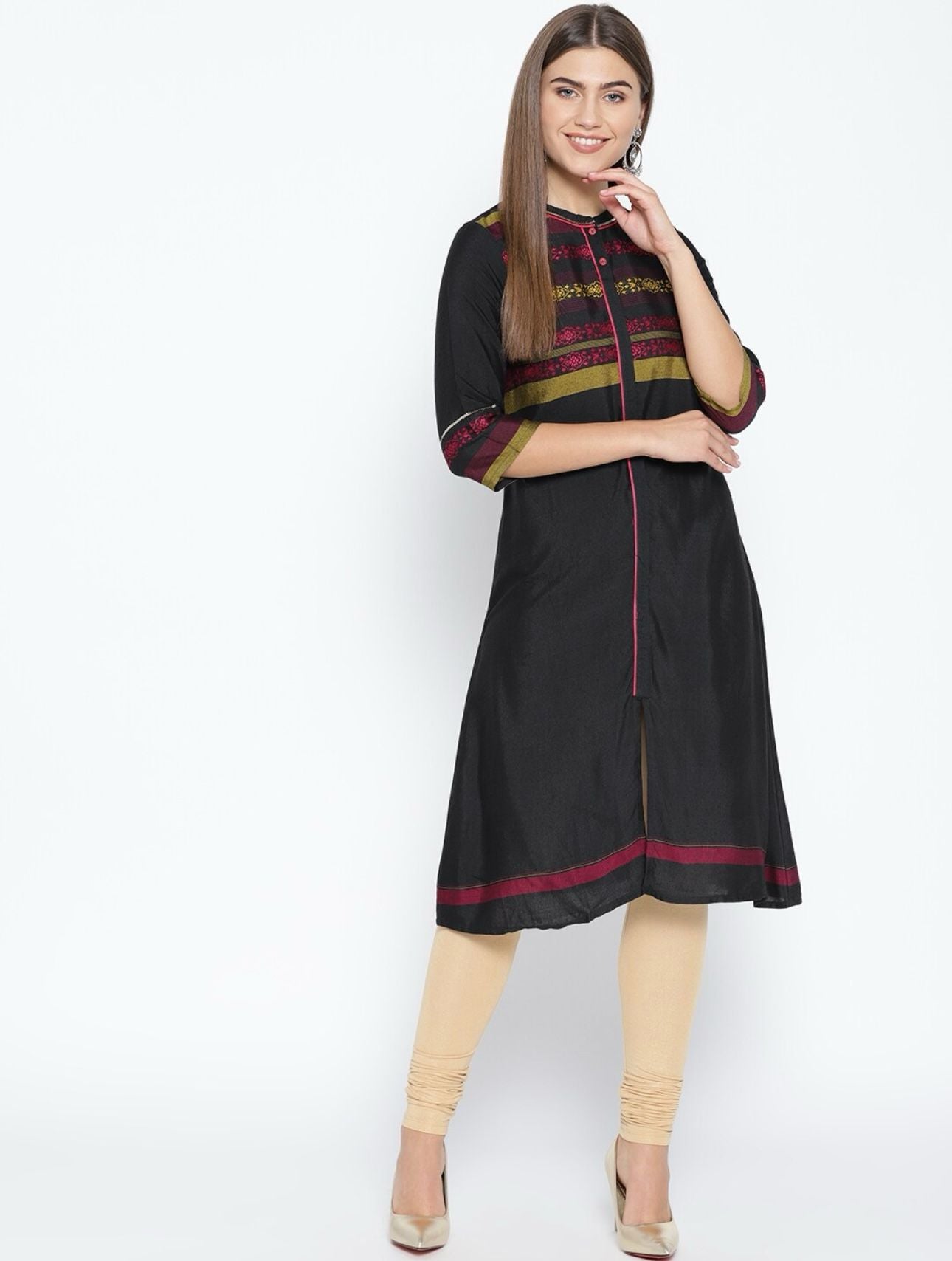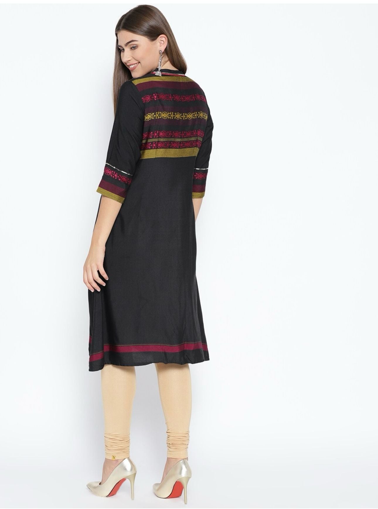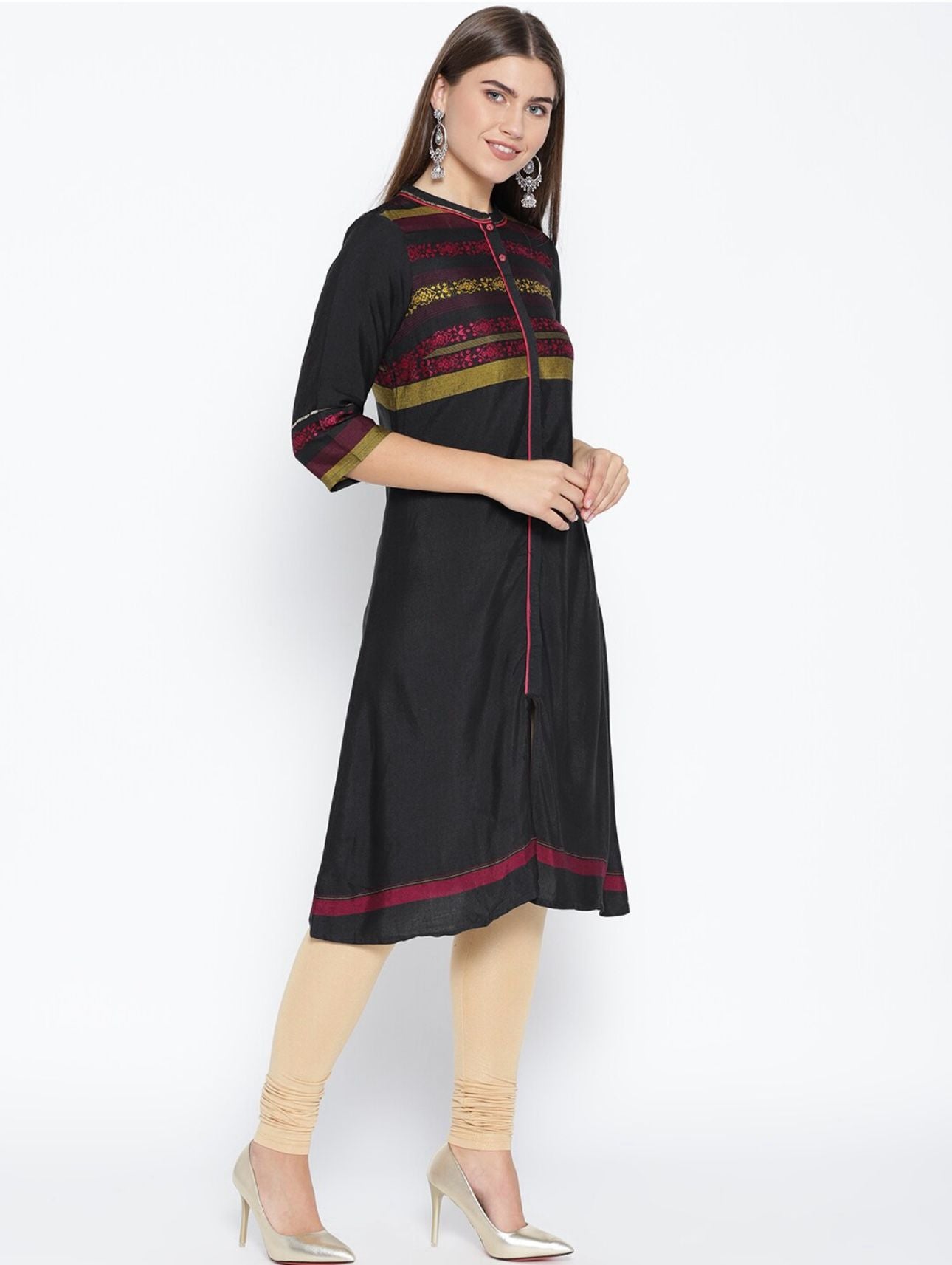This swanky kurta fwill take your personal style to new heights. Dress up for your next family event by pairing this black piece with your best Kolhapuris and simple jewellery.