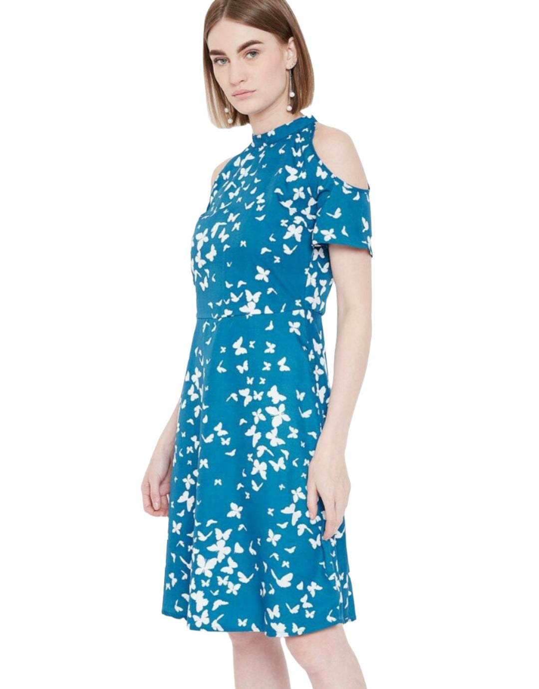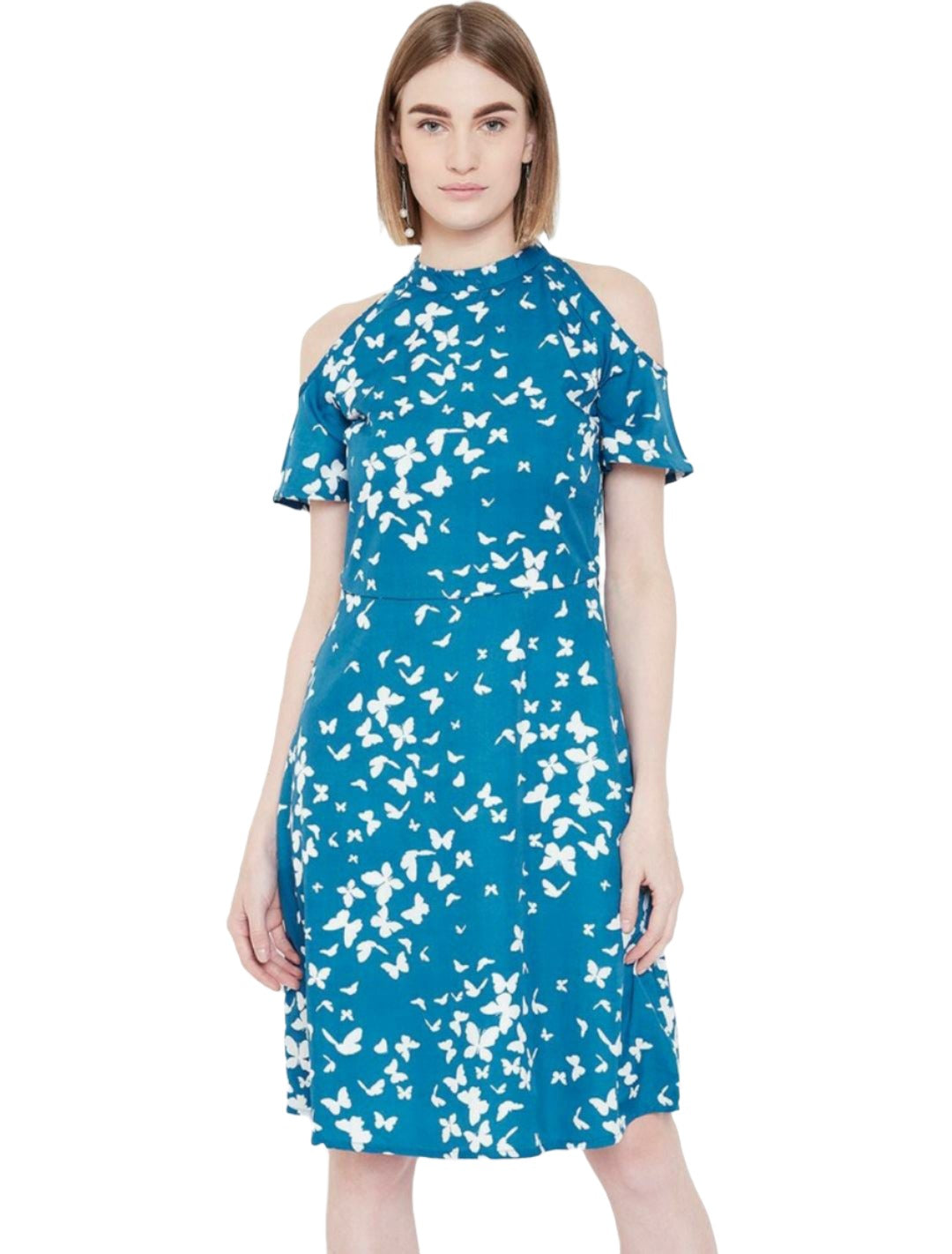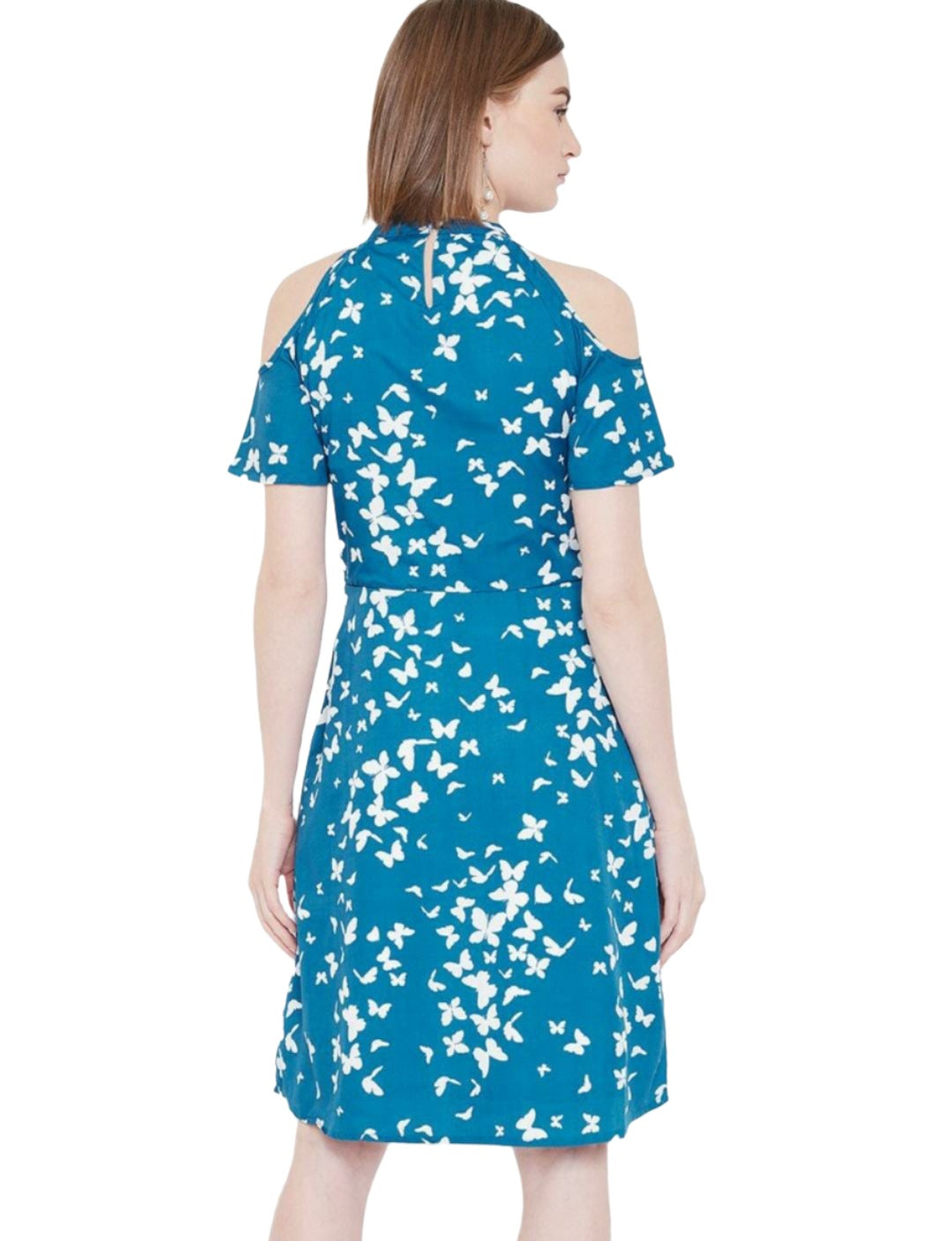 Women Blue & White Butterfly Printed Cold-Shoulder A-Line Dress