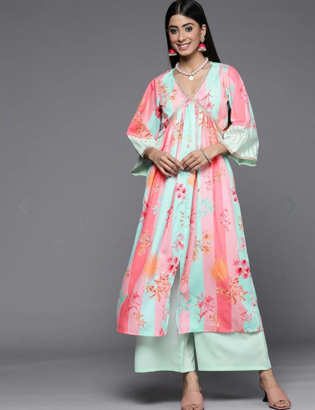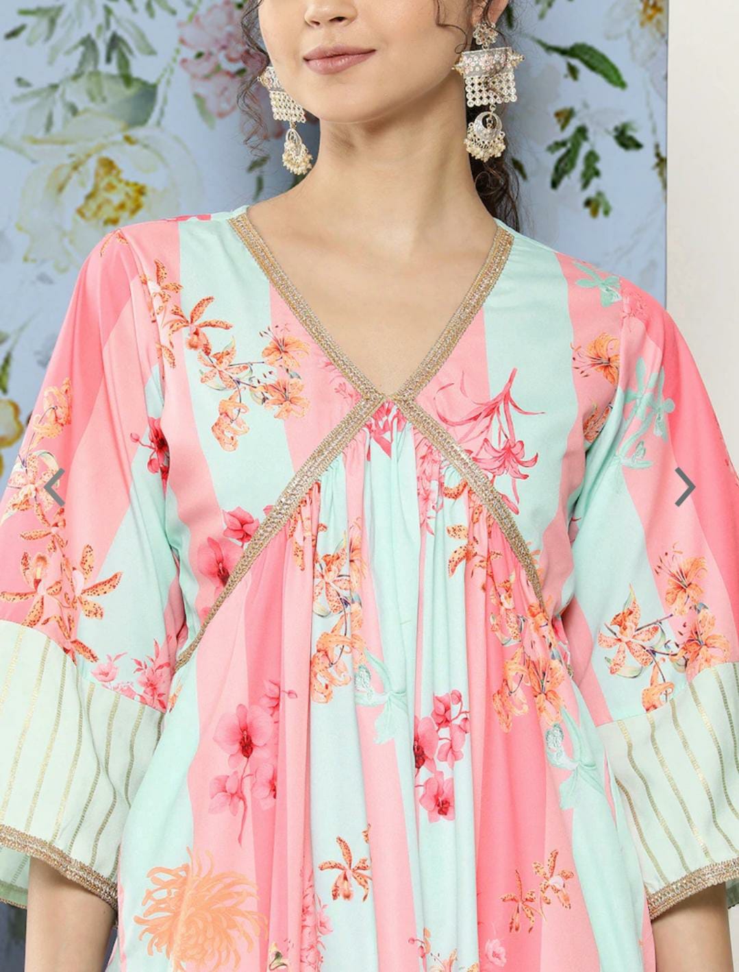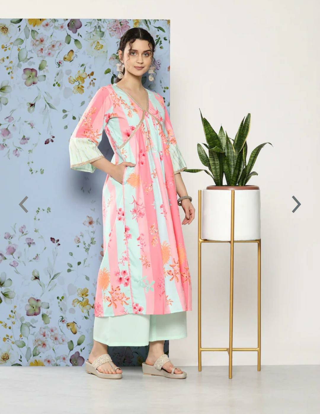 Women Floral Printed Pleated Gotta Patti Kurta With Palazzos