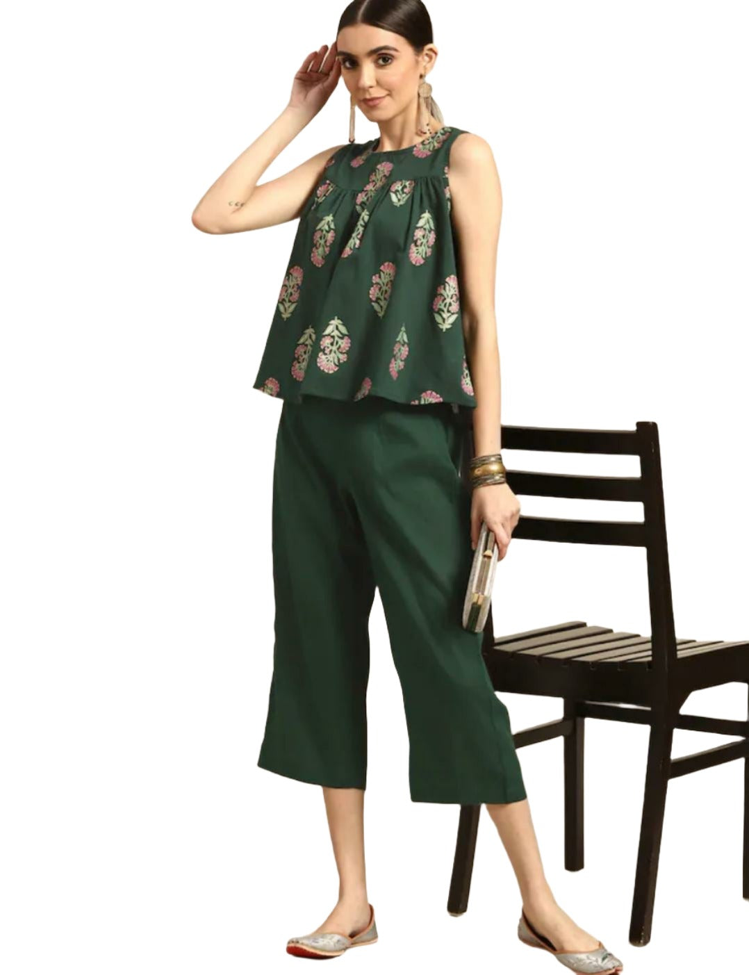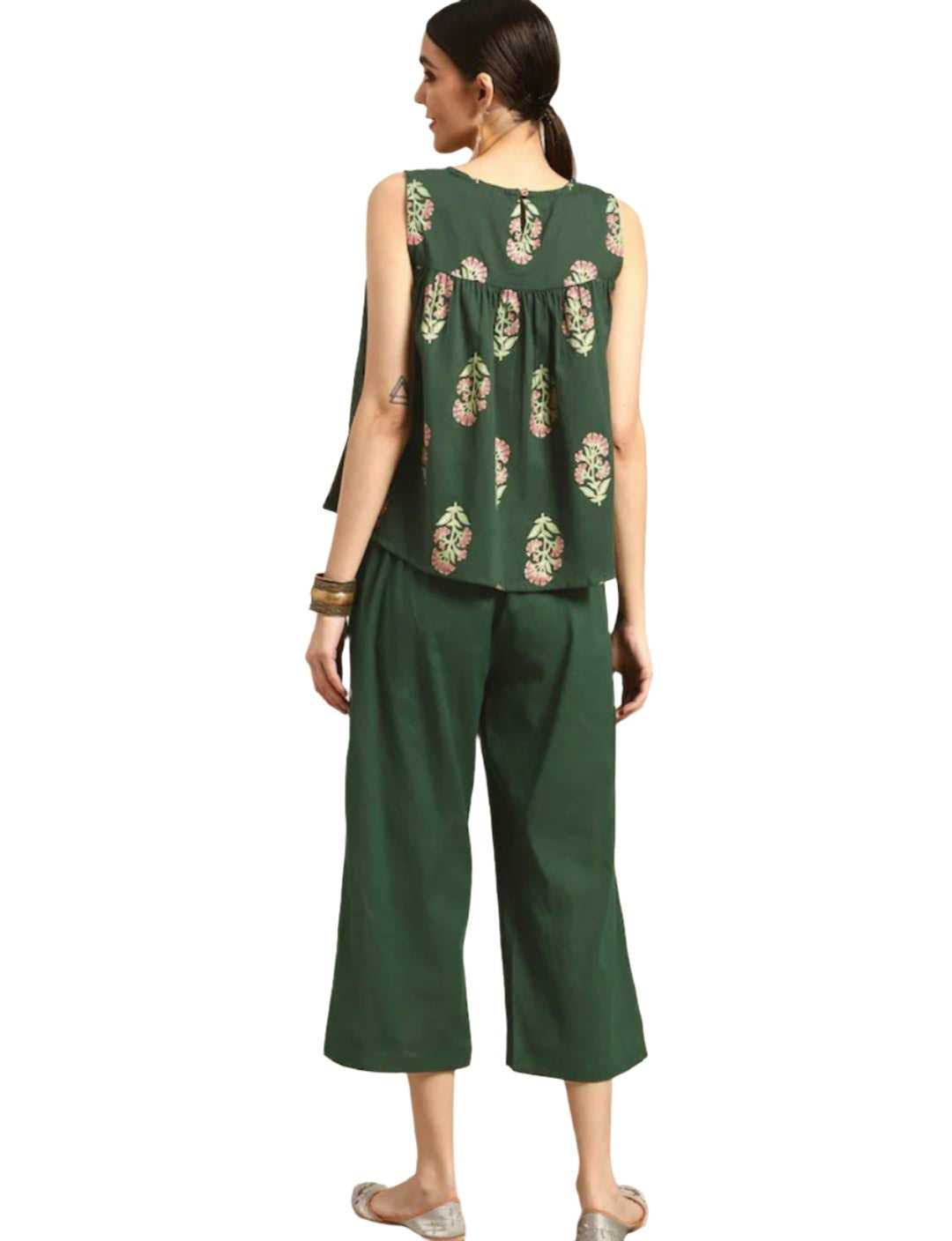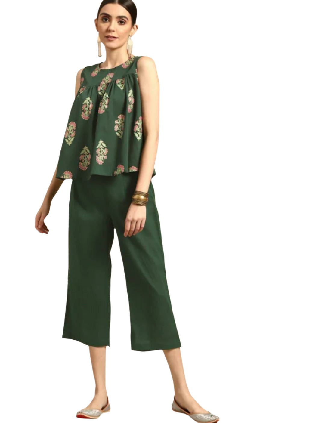 Women Green Pure Cotton Printed Pleated Top with Palazzos