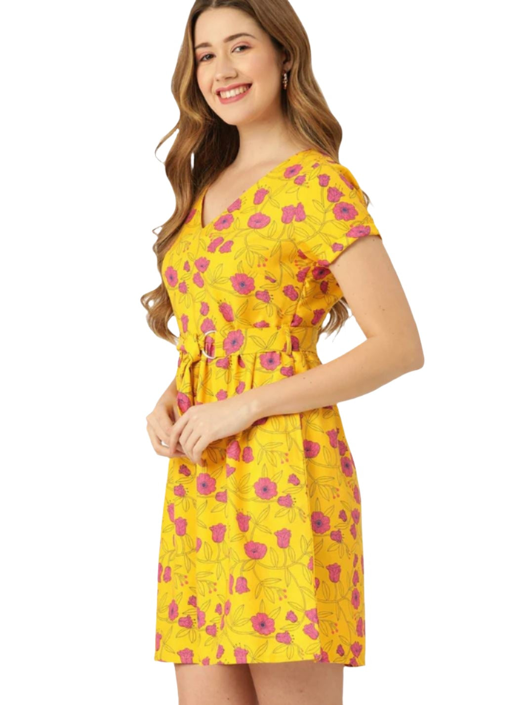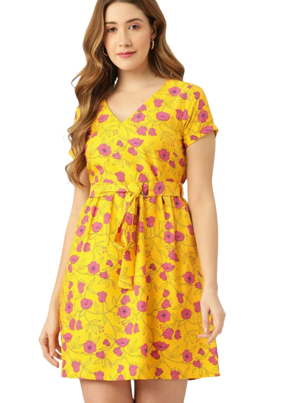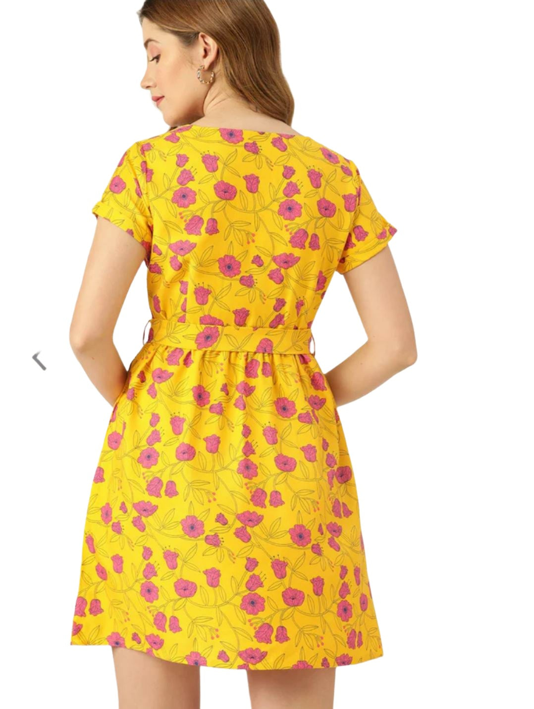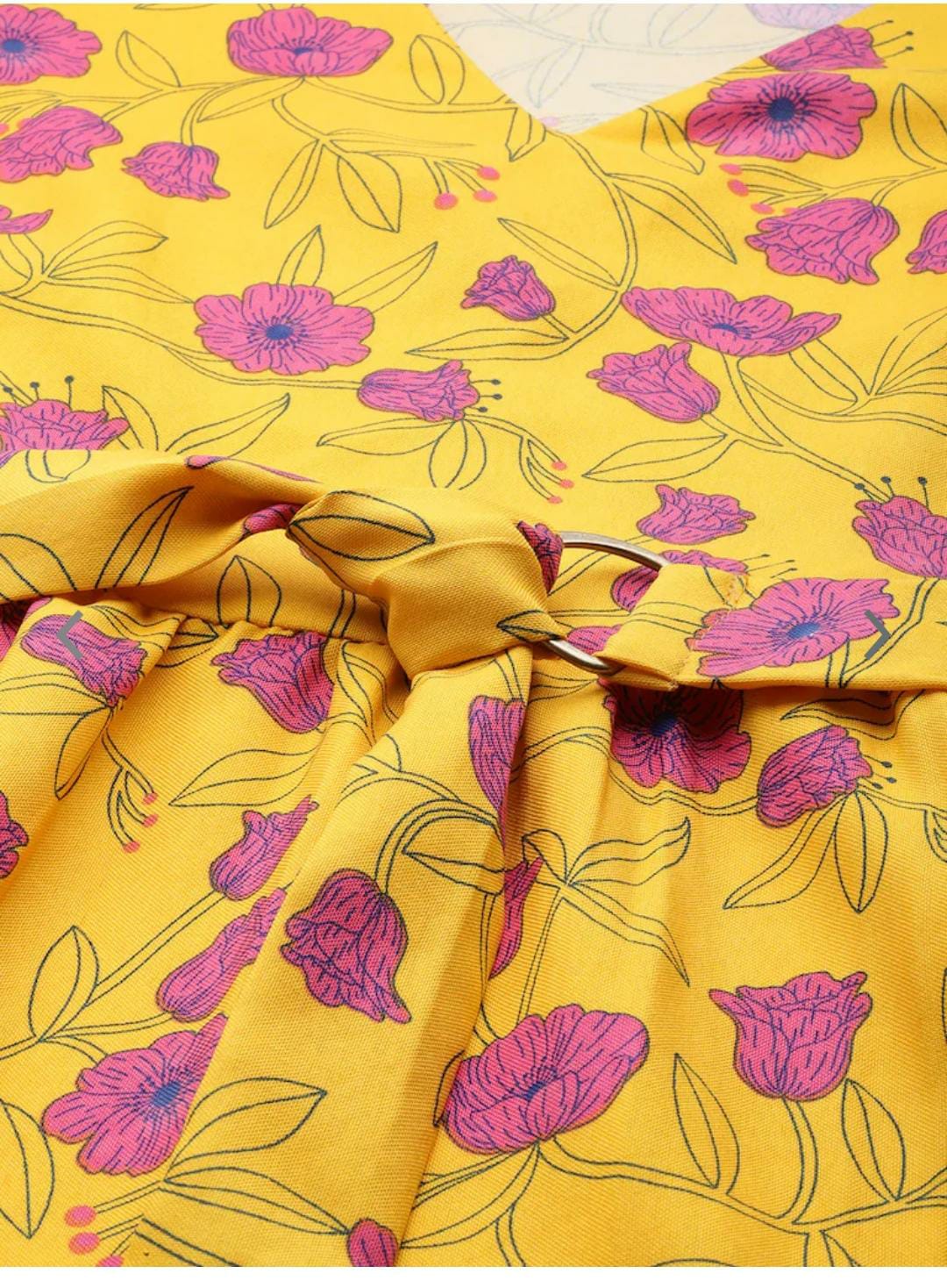 Women Mustard Yellow & Pink Floral Printed A-Line Dress