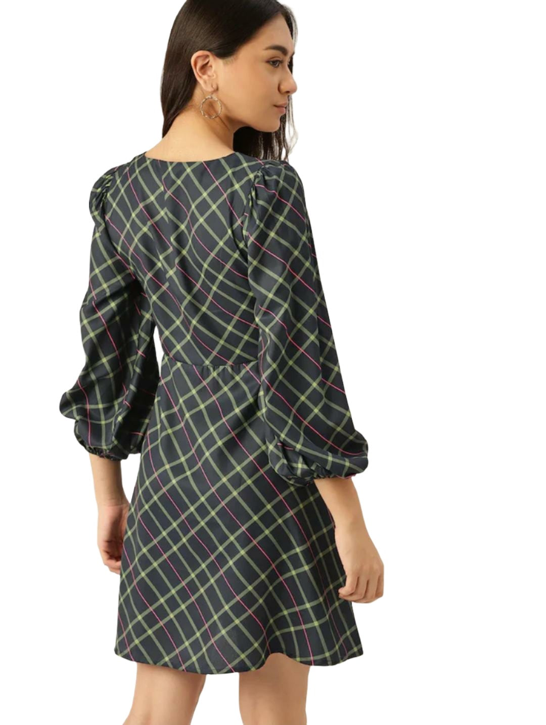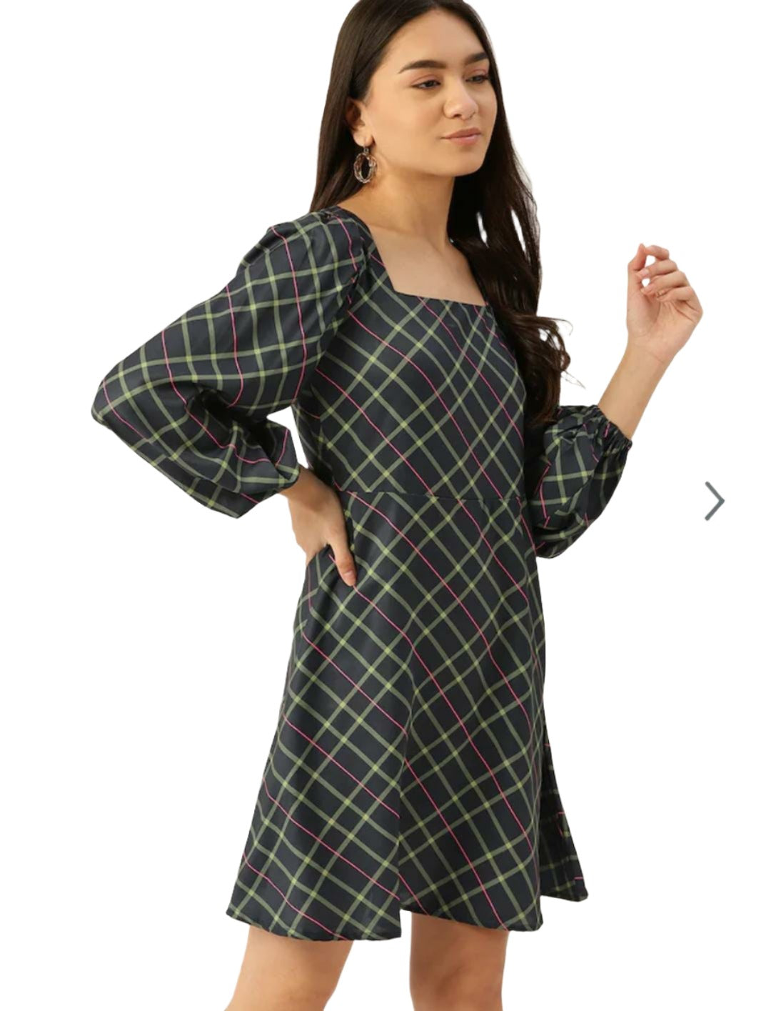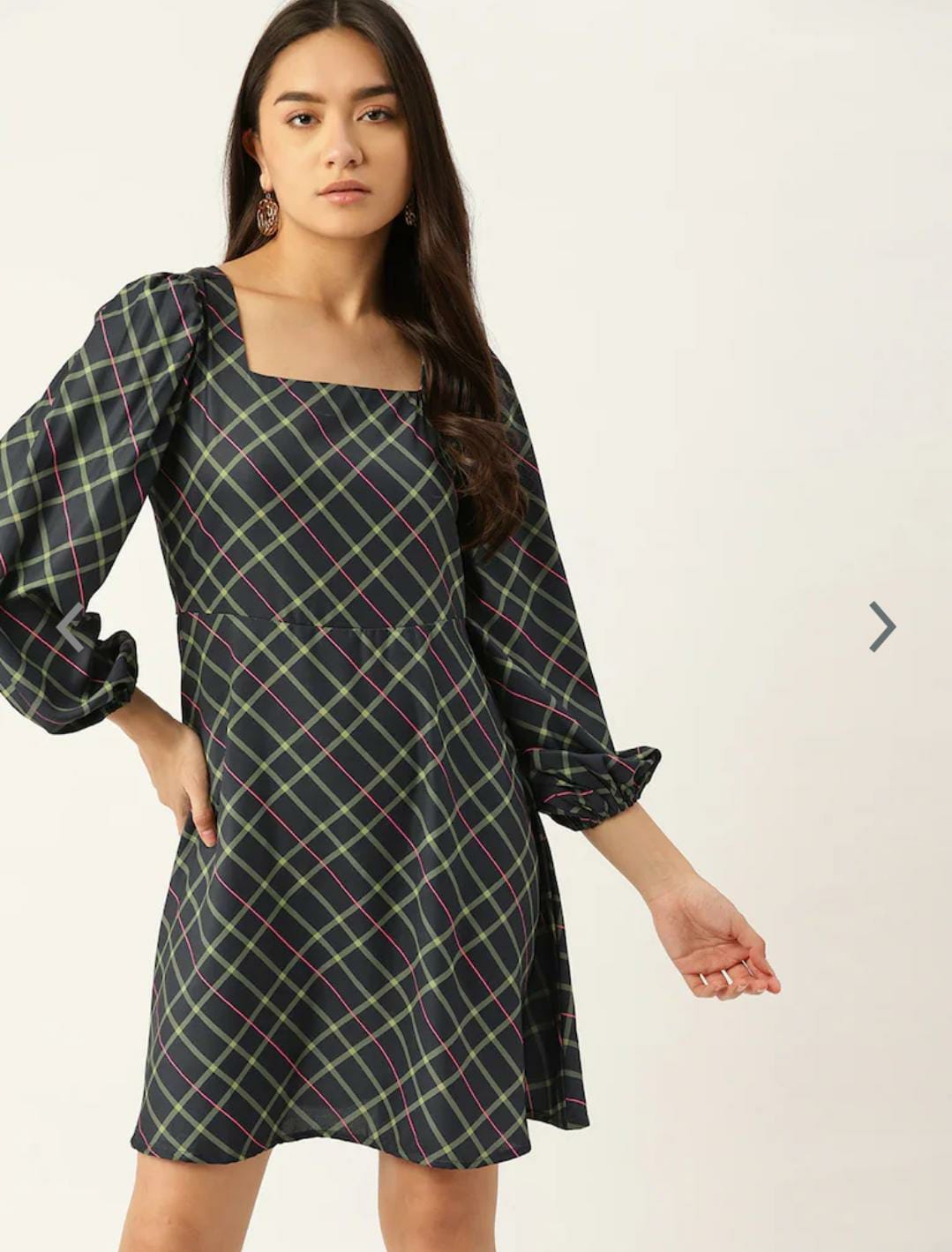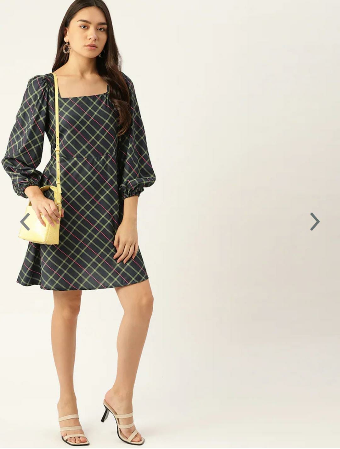 - Navy blue and yellow checked fit & flare dress