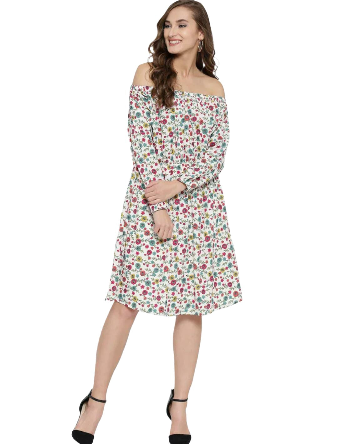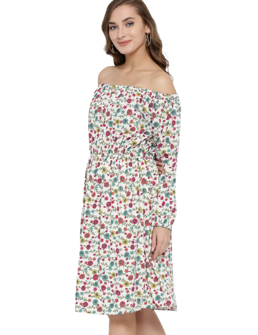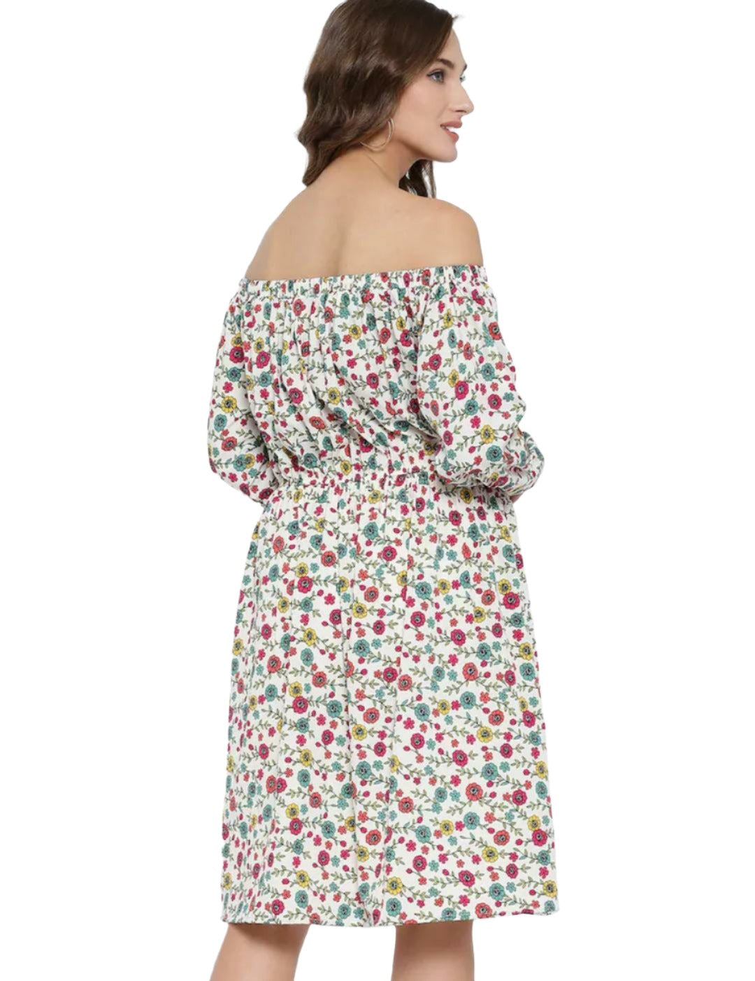 Off-white and pink printed woven blouson dress, has an off-shoulder neck, long sleeves, an attached lining, and flared hem