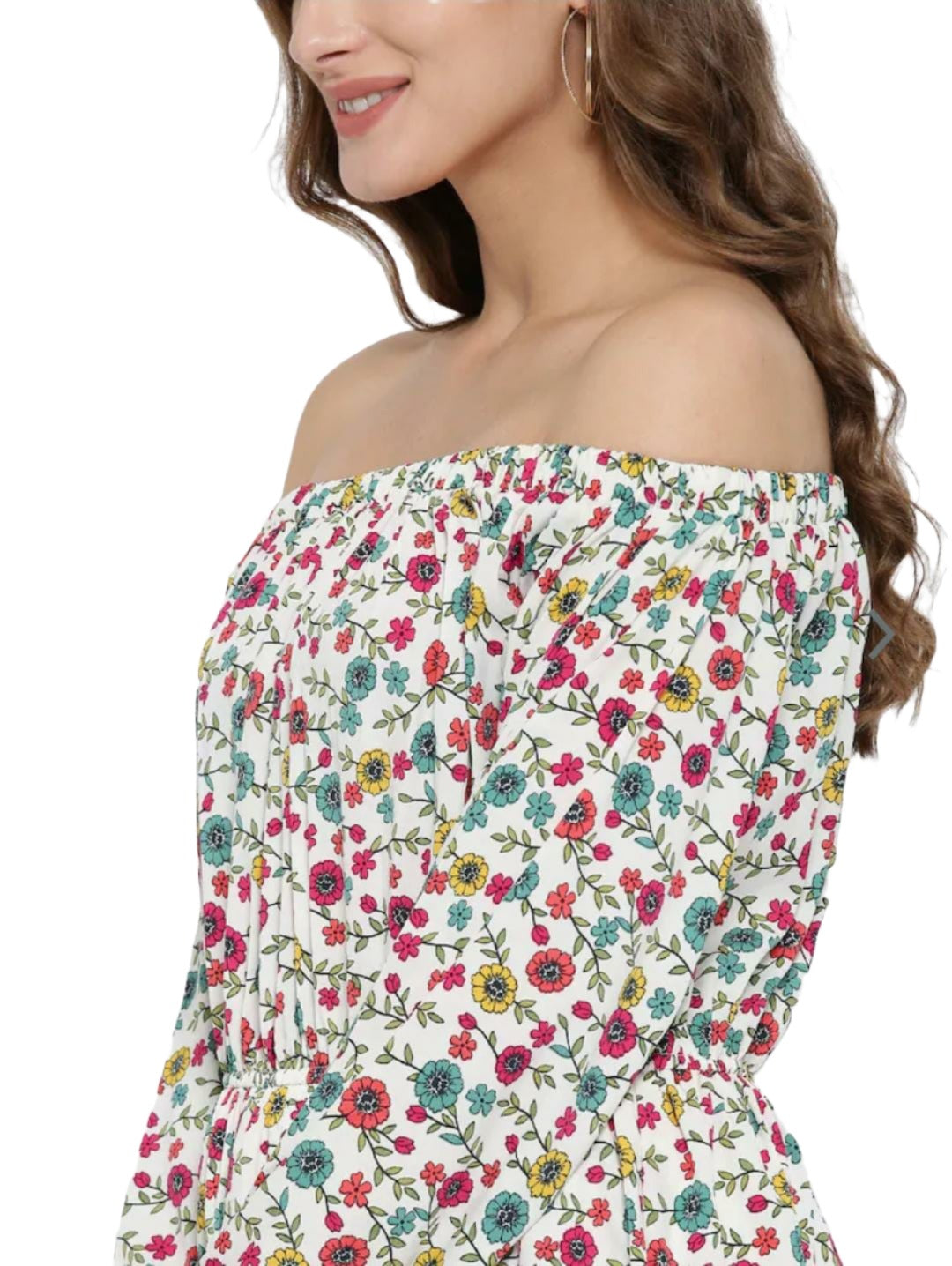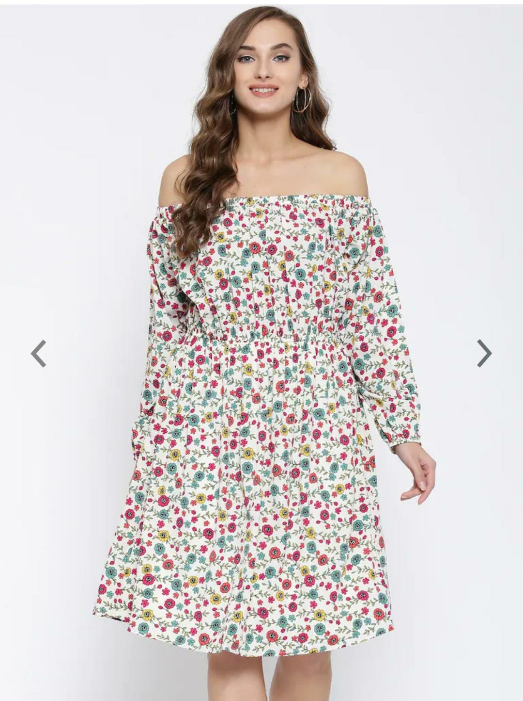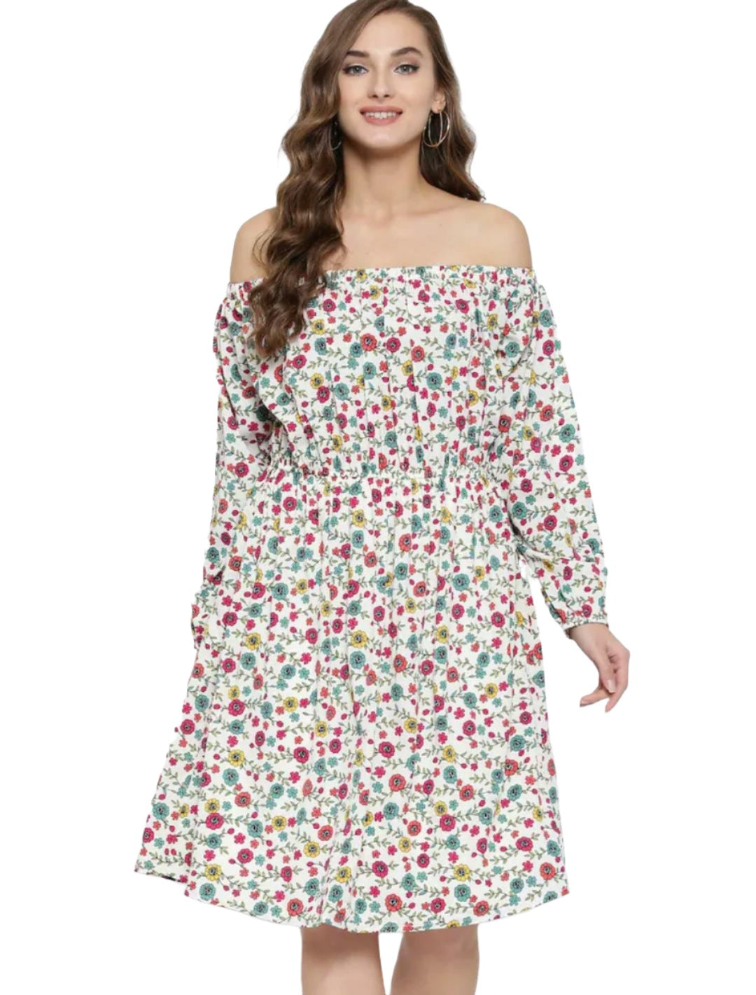 Off-white and pink printed woven blouson dress, has an off-shoulder neck, long sleeves, an attached lining, and flared hem