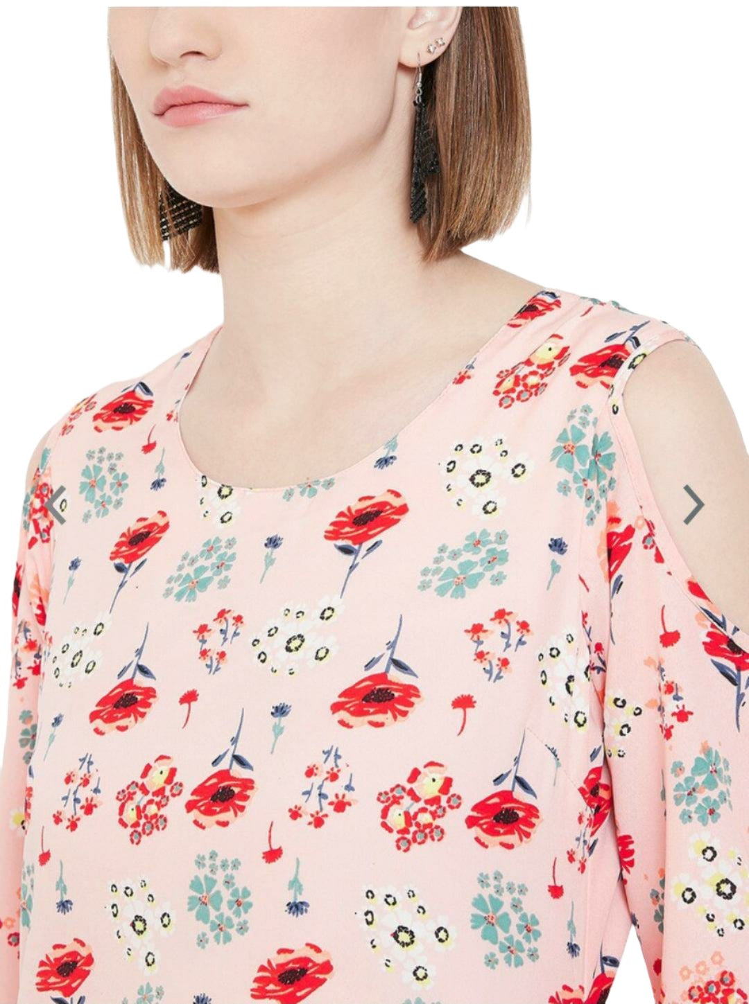 Women Peach-Coloured & Red Cold-Shoulder Floral Printed A-Line Dress