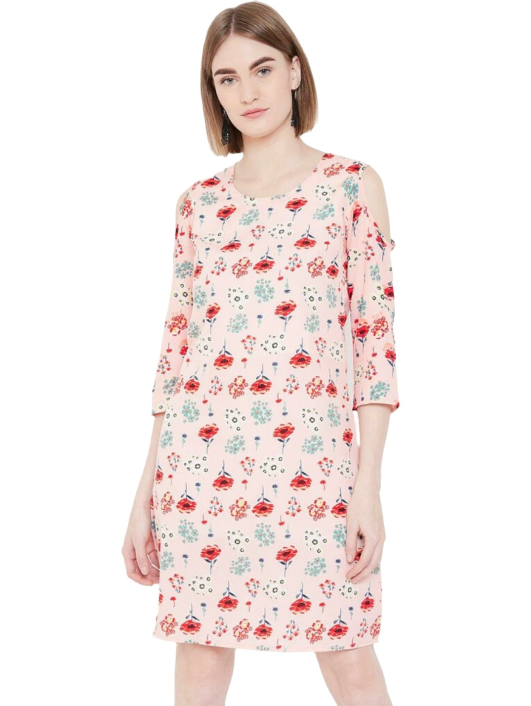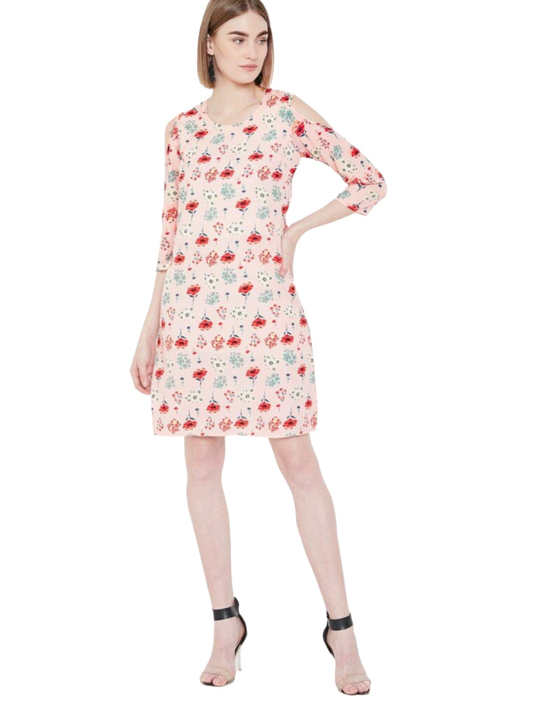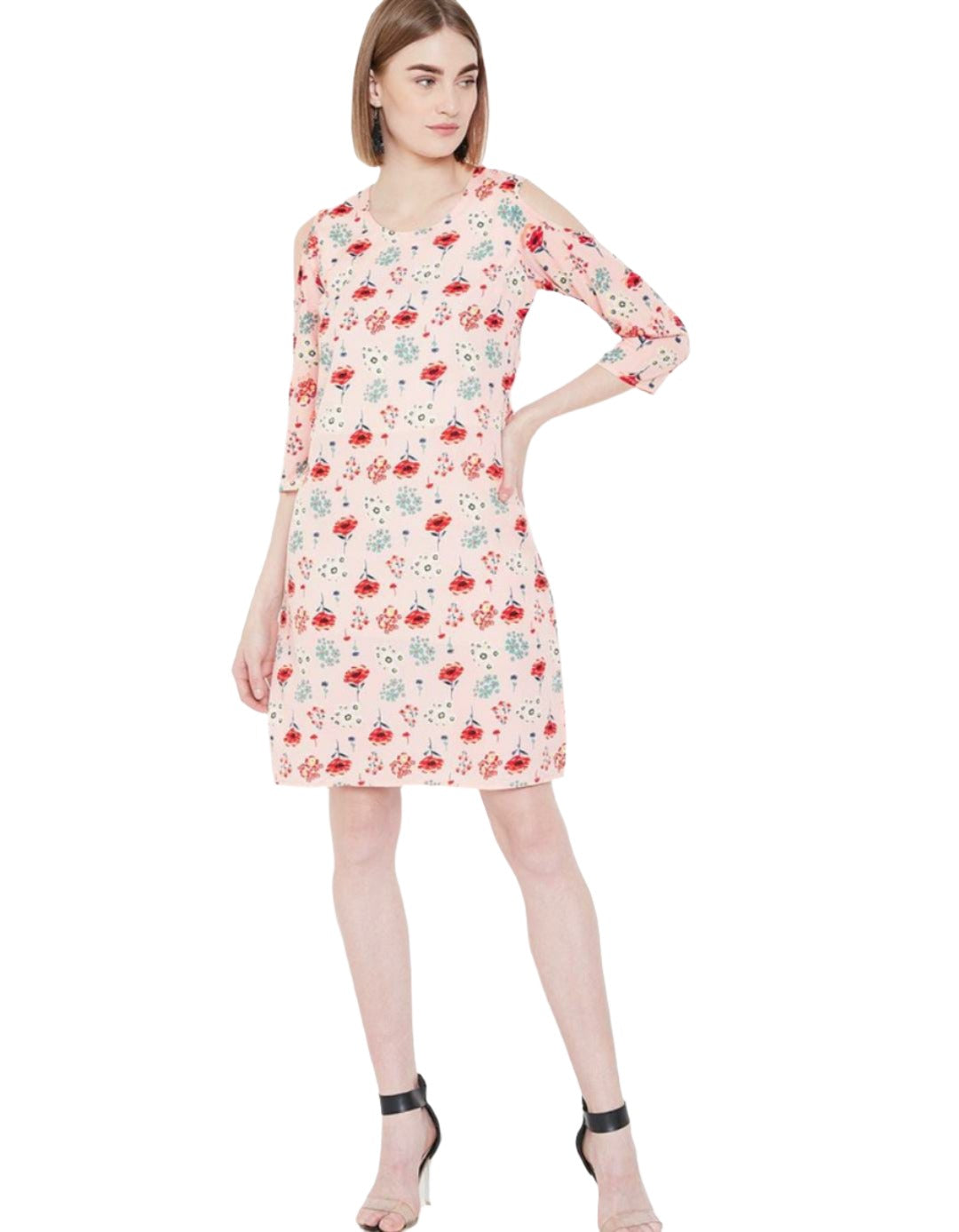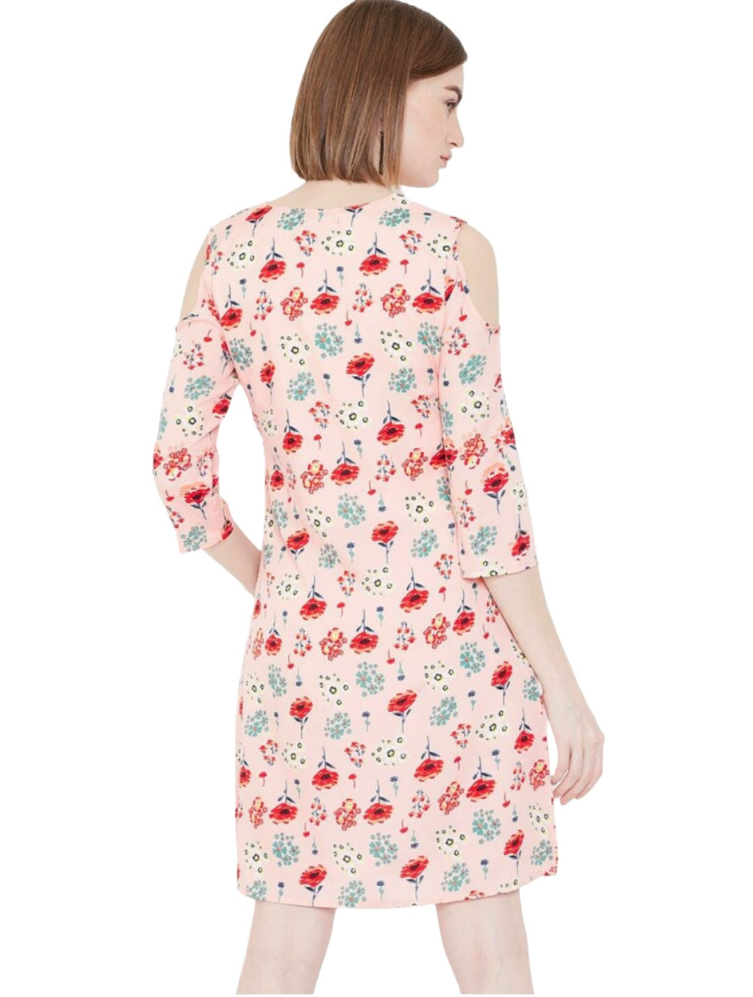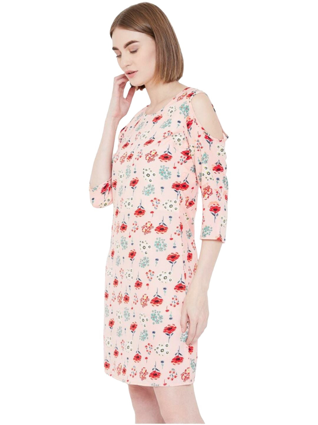 Peach-coloured, red and green cold-shoulder printed woven A-line dress, has a round neck, three-quarter sleeves, and flared hem