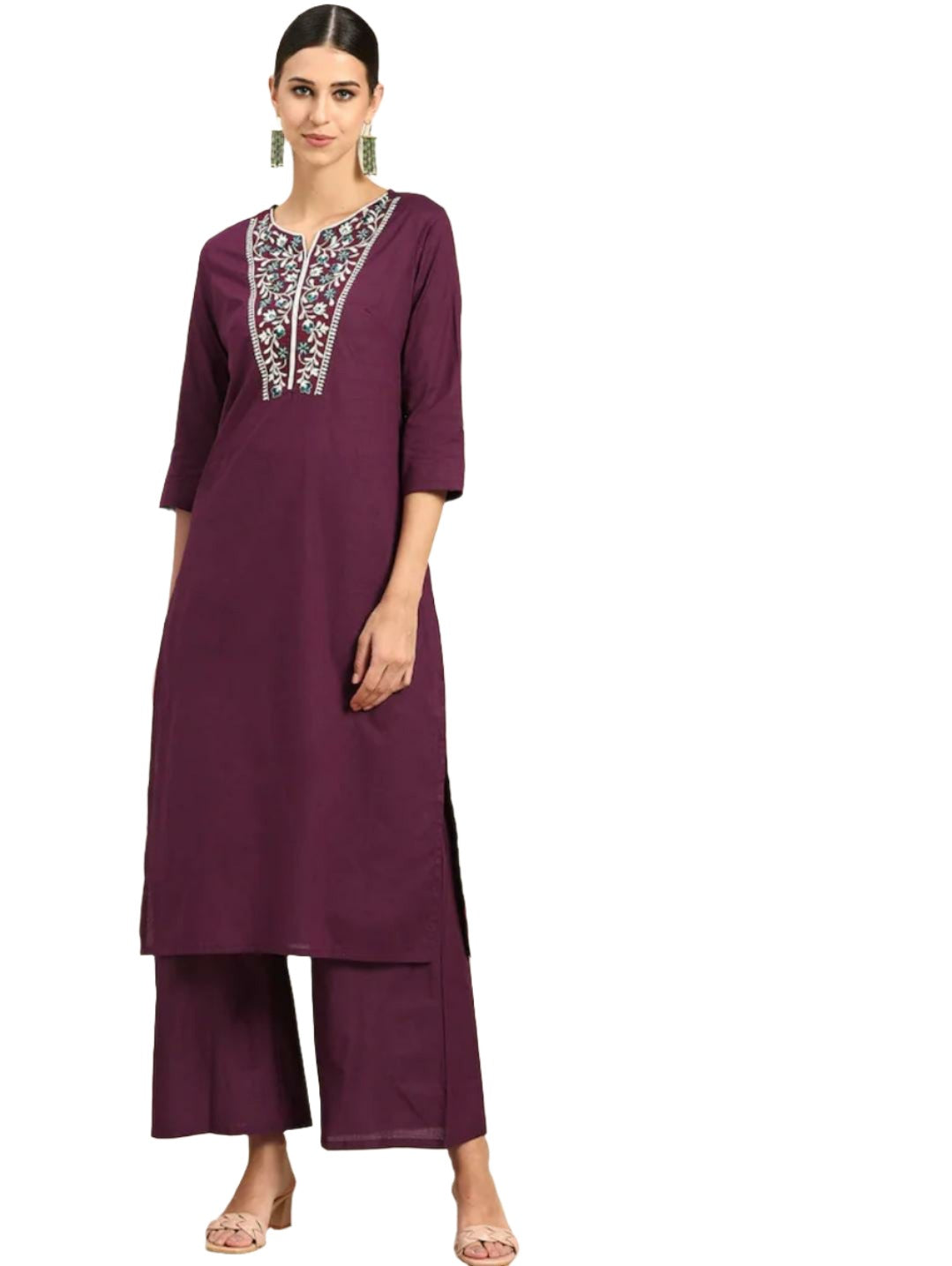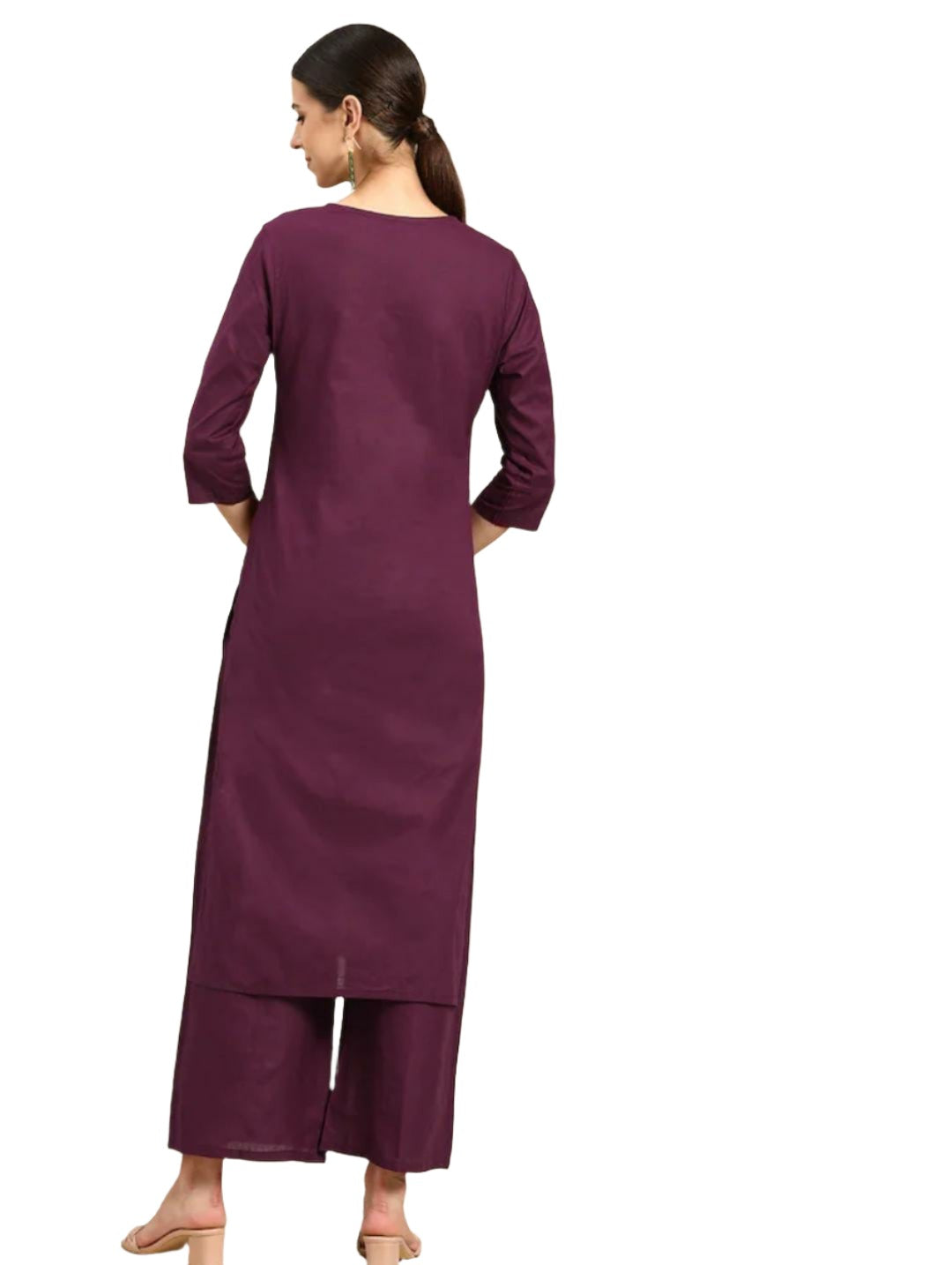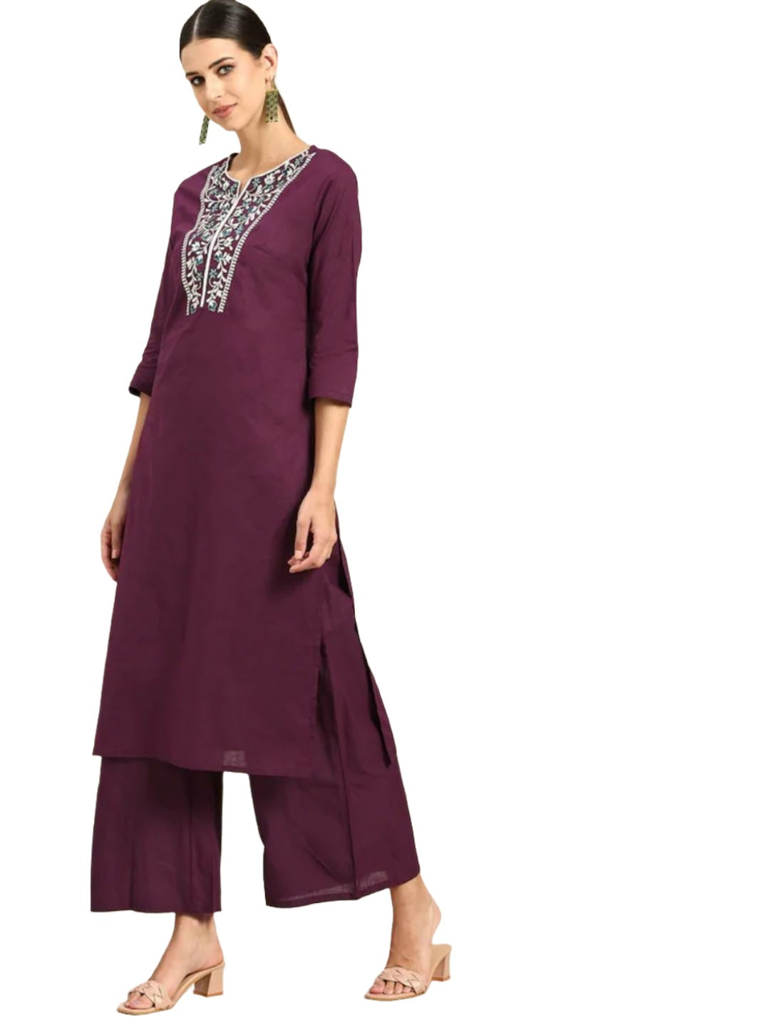 Women Purple Ethnic Motifs Yoke Design Regular Thread Work Pure Cotton Kurta with Palazzos