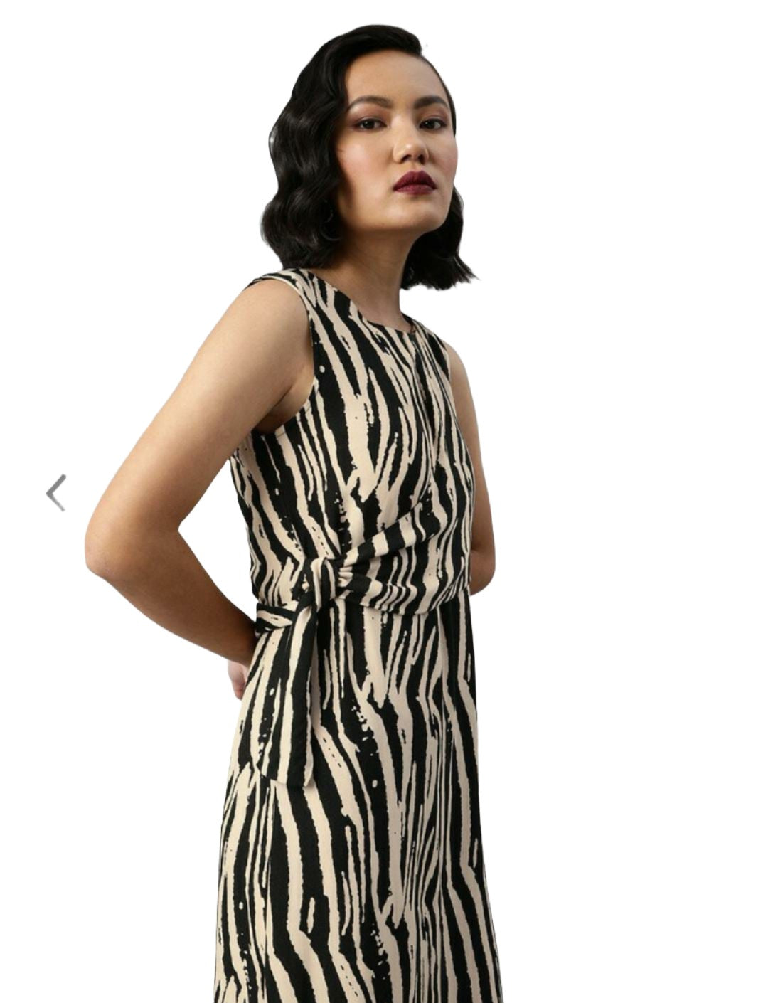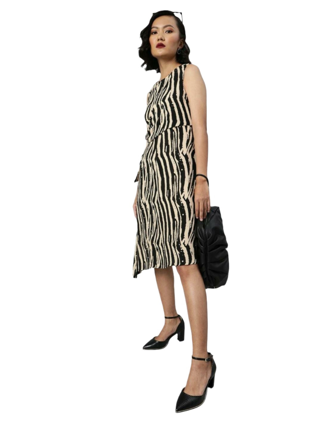 White and Black printed woven wrap dress, has a round neck, sleeveless, button closure, and straight hem