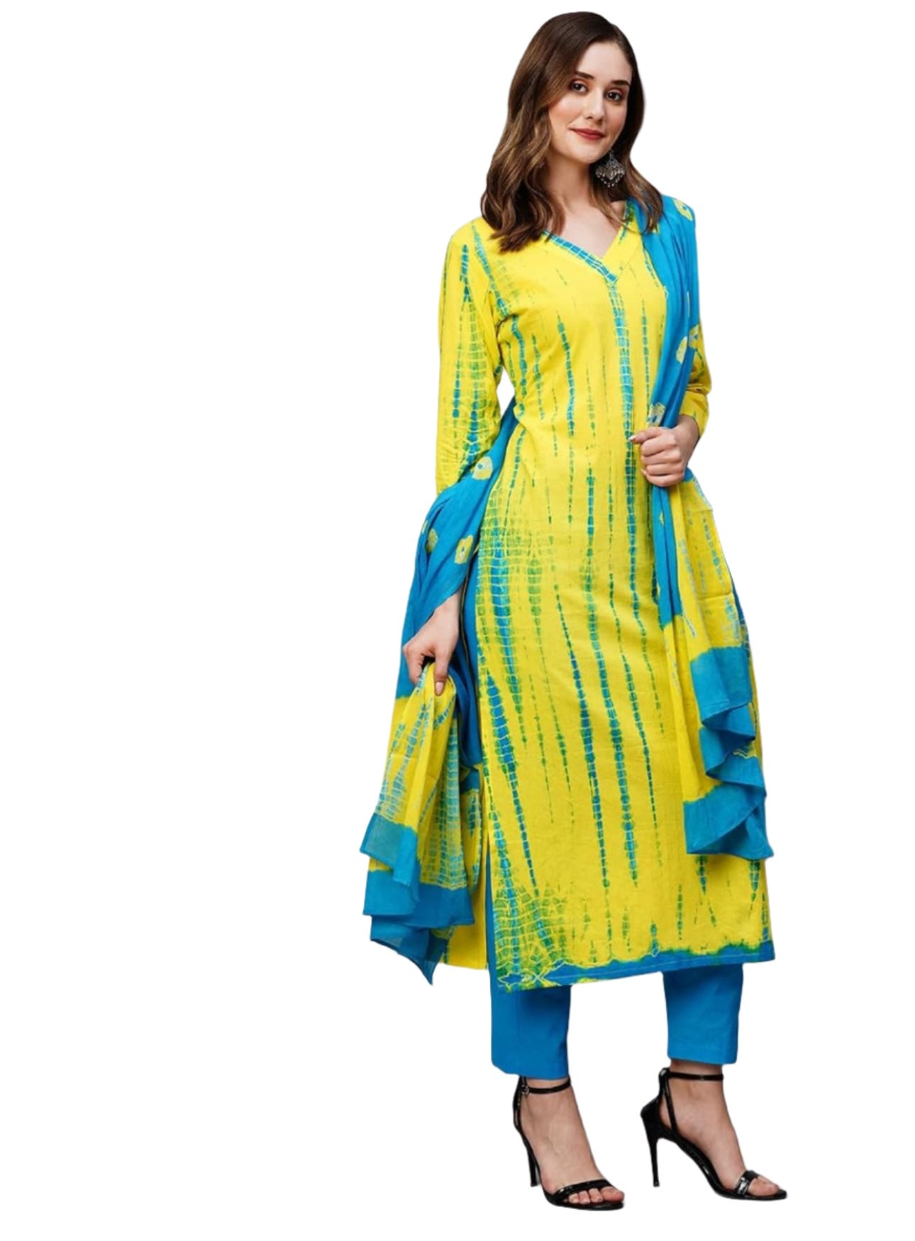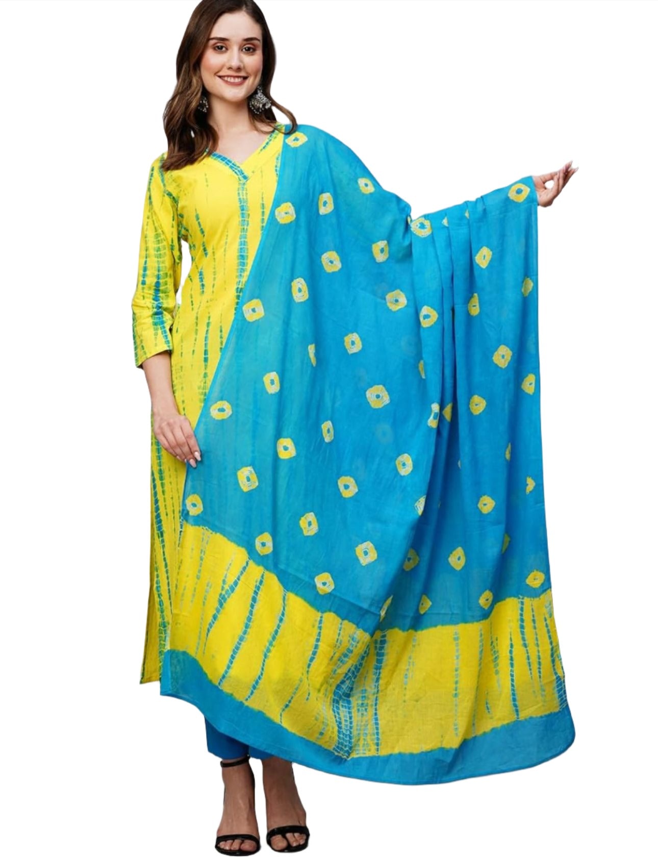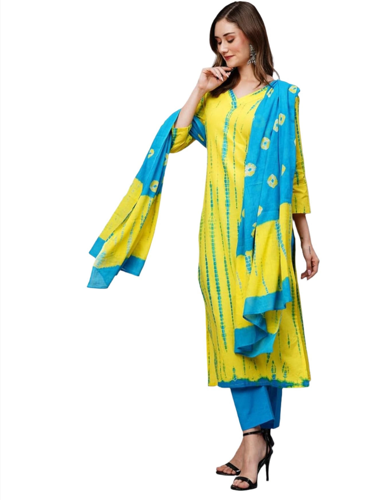 Kurta Set Fabric: Cotton Blend || Kurta Set Color :- YellowStyle: Straight || Length: Calf Length || Sleeves: 3/4 Sleeves || Size Chart- Kurta-S-36 in, M-38 in , L-40 in , XL-42 in , XXL-44 in,Pant :- S-28 in, M-30 in , L-32 in, XL- 34 in , XXL- 36 inThis set includes: 1 Kurta and 1 Pant with Dupatta || Work :- Printed || Neck Style:- Round NeckOccassion: Traditional wear, Casual Wear, party wear, evening wear, Please Click On Brand Name "GoSriKi" For More Products.Product Color May Slightly Vary Due To Photographic Lighting Sources Or Your Monitor Settings
