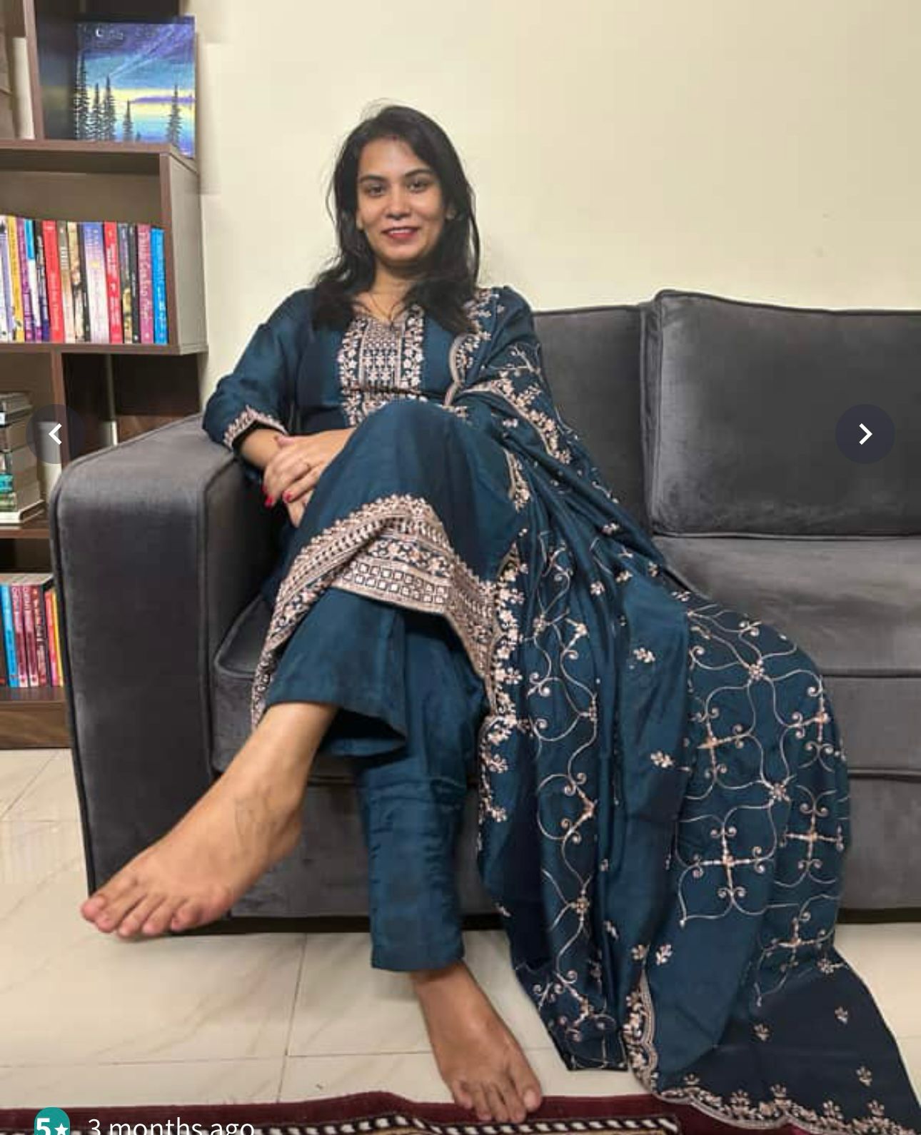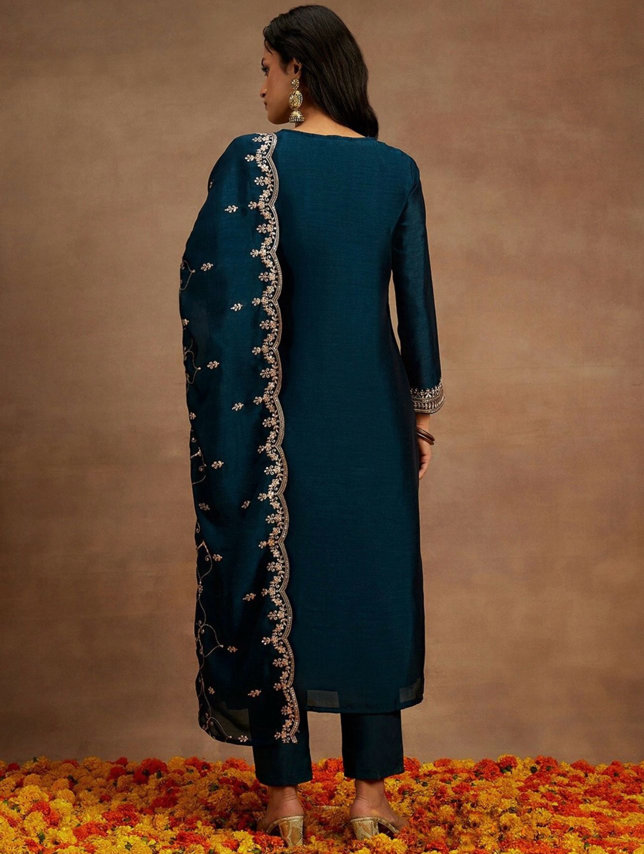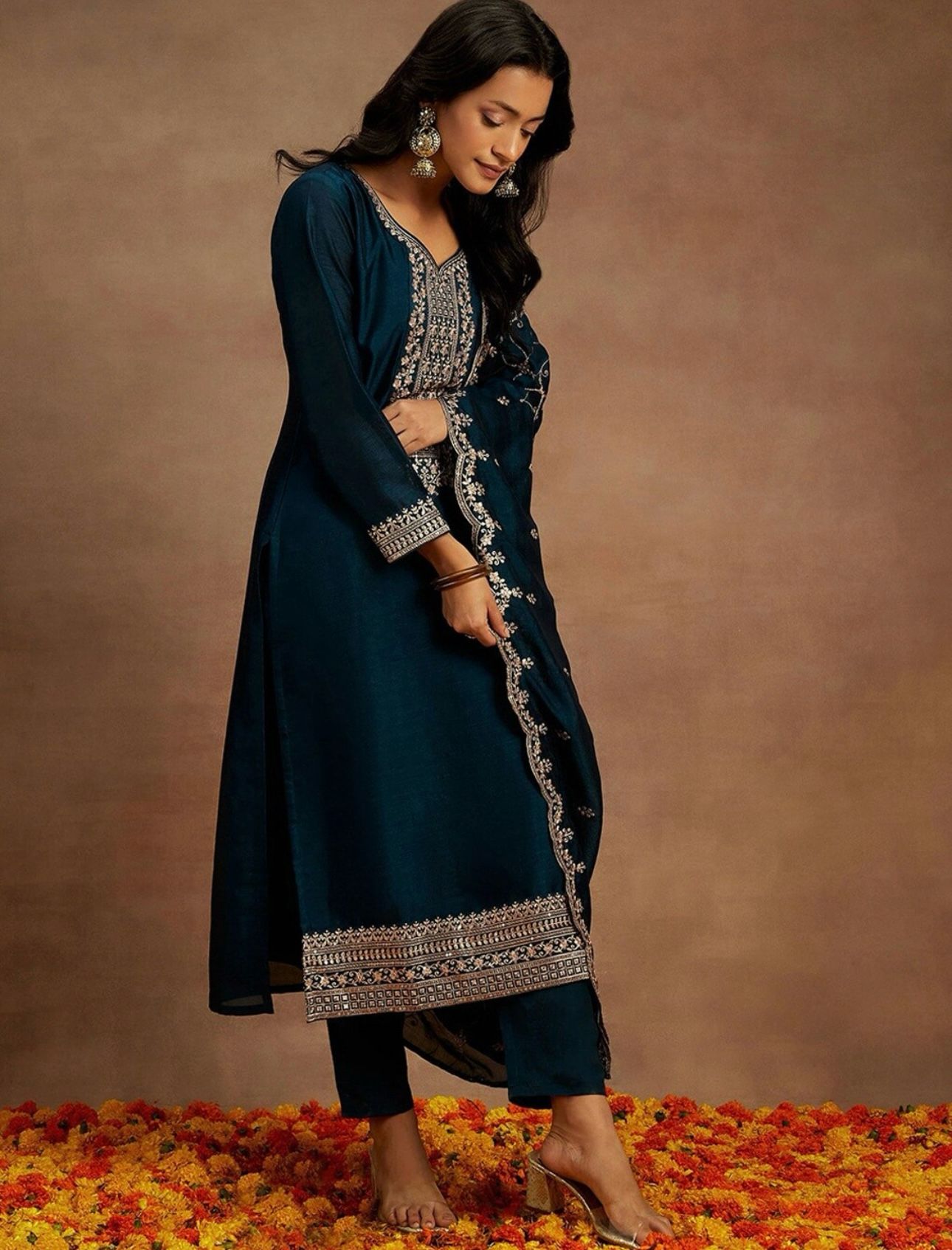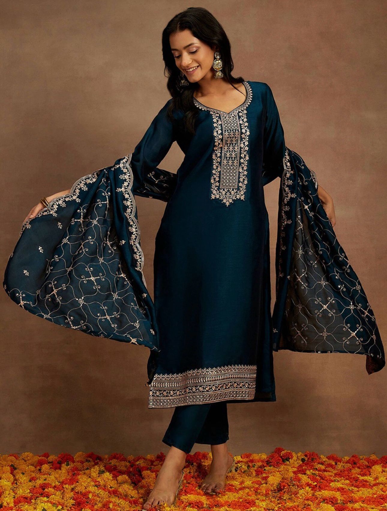 Yoke Design Sequinned Straight Kurta with Trousers & With Dupatta
